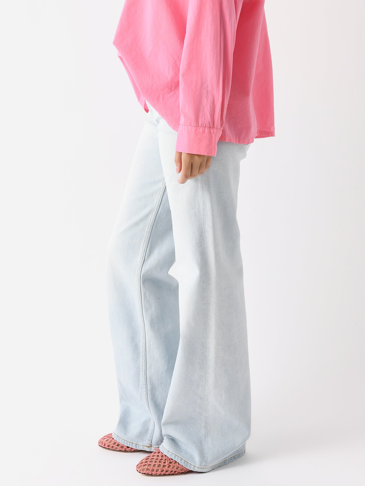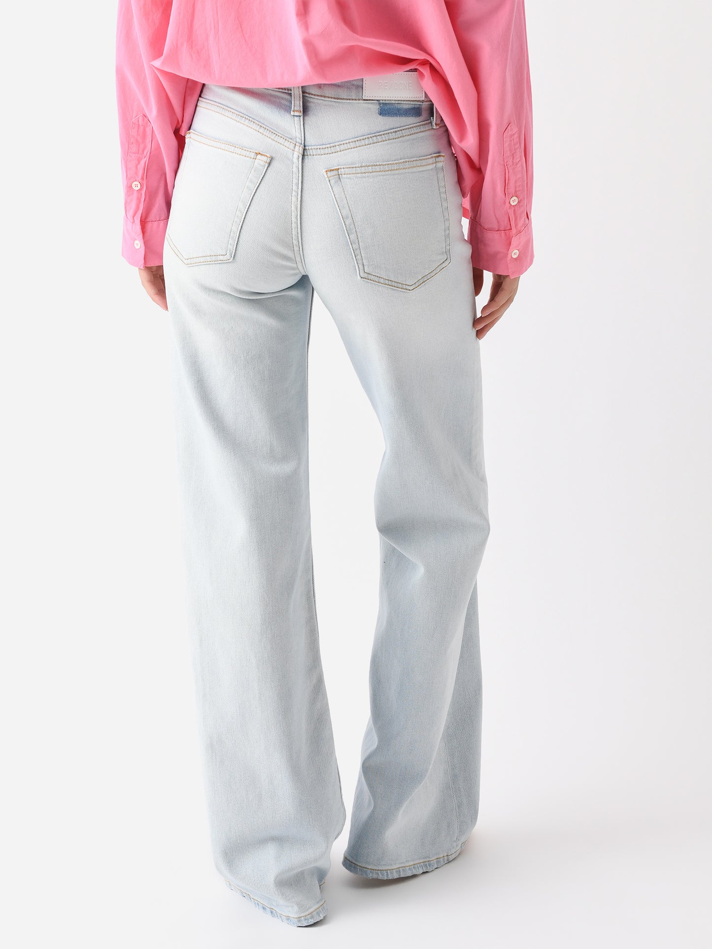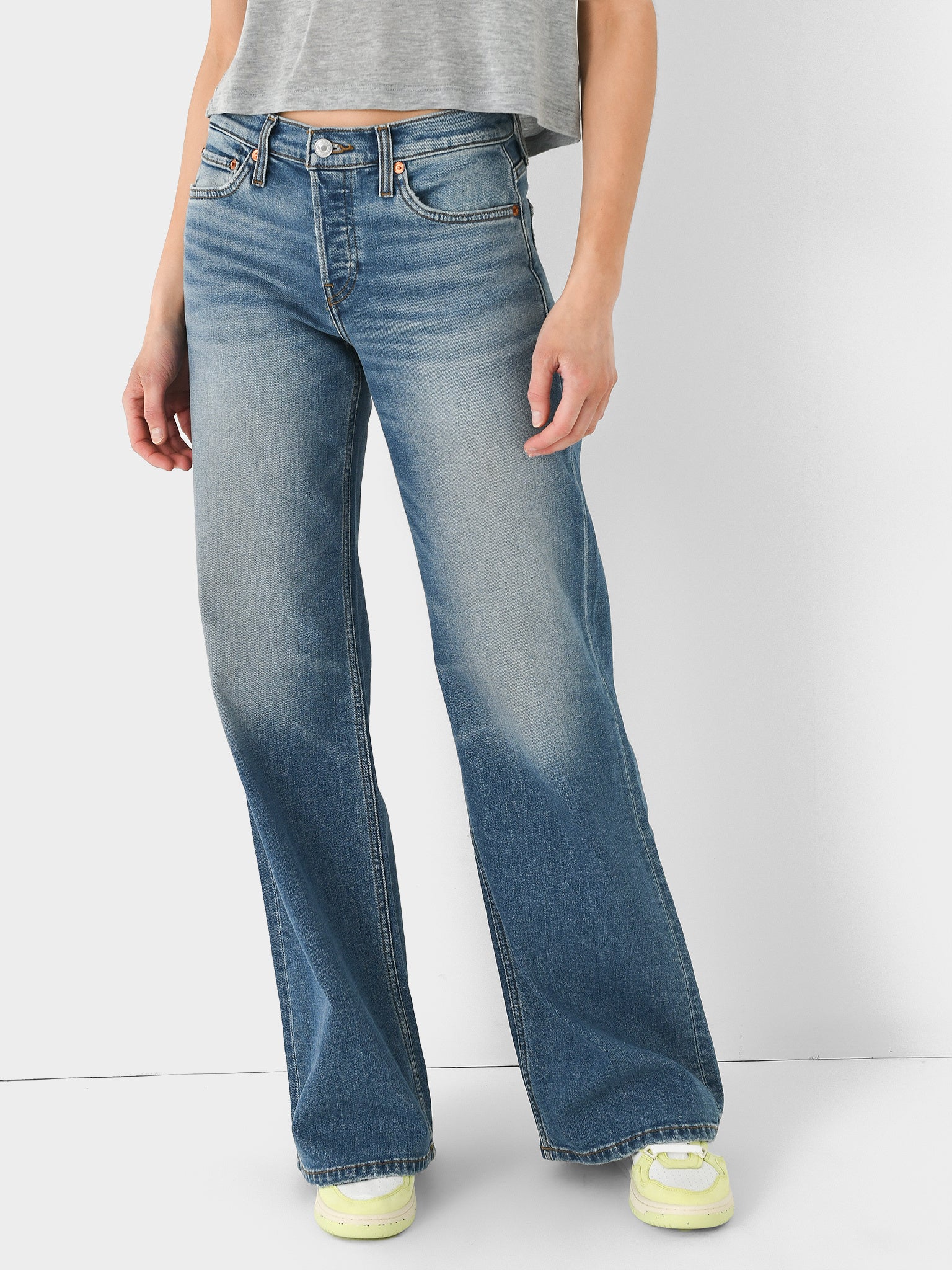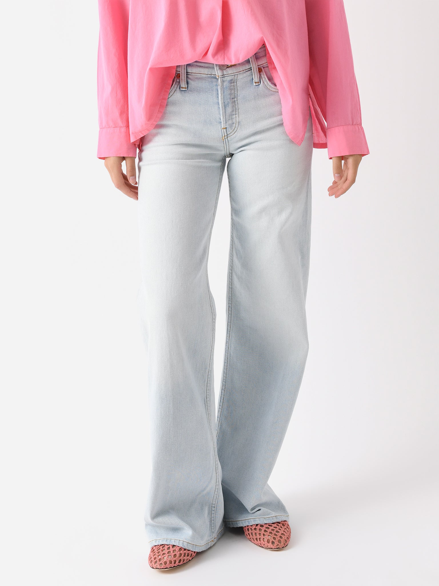 A mid-rise stretch denim jean with a wide-leg silhouette with faded details.