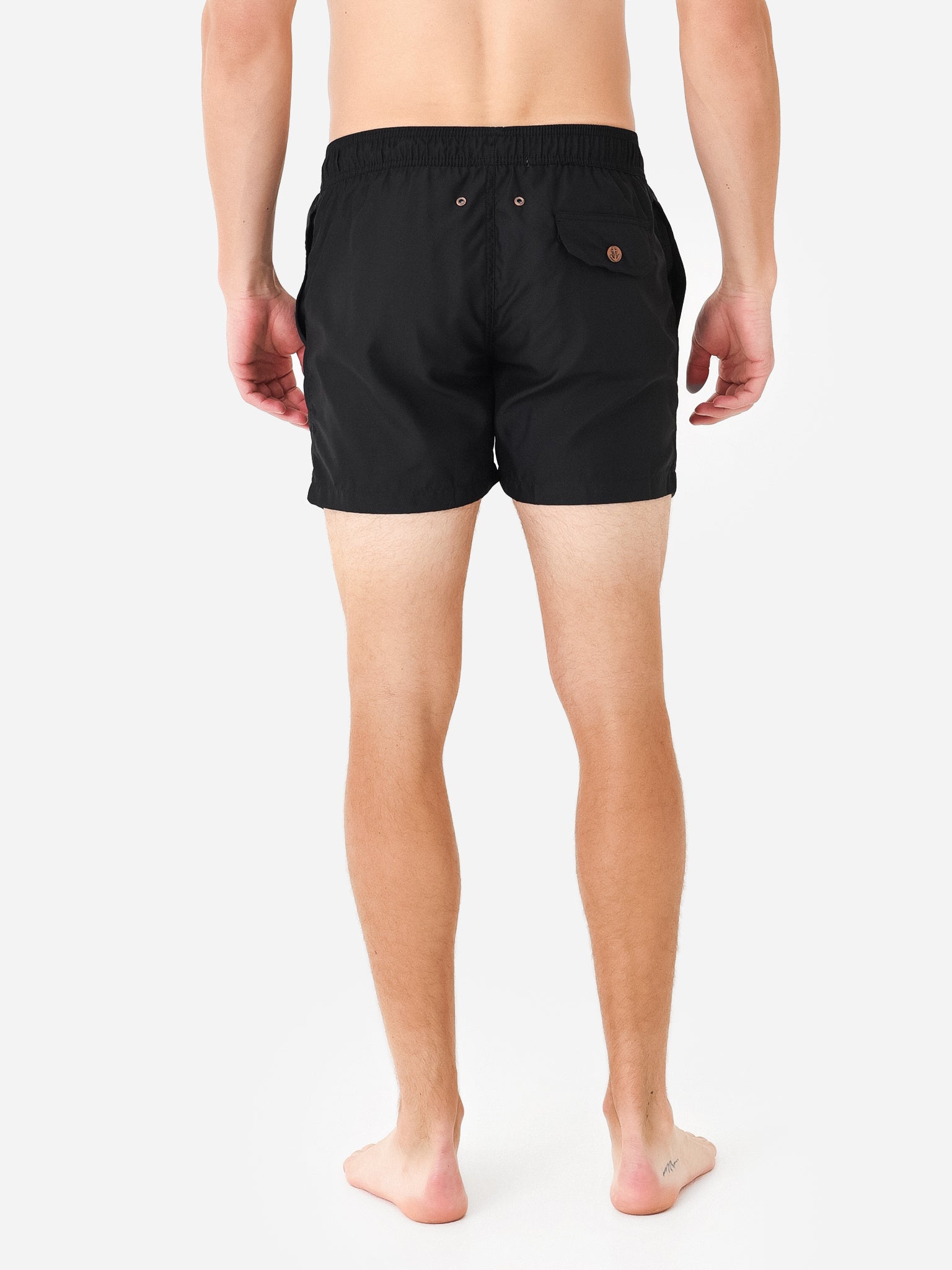Black swim trunk made from chlorine-resistant peached fabric.
