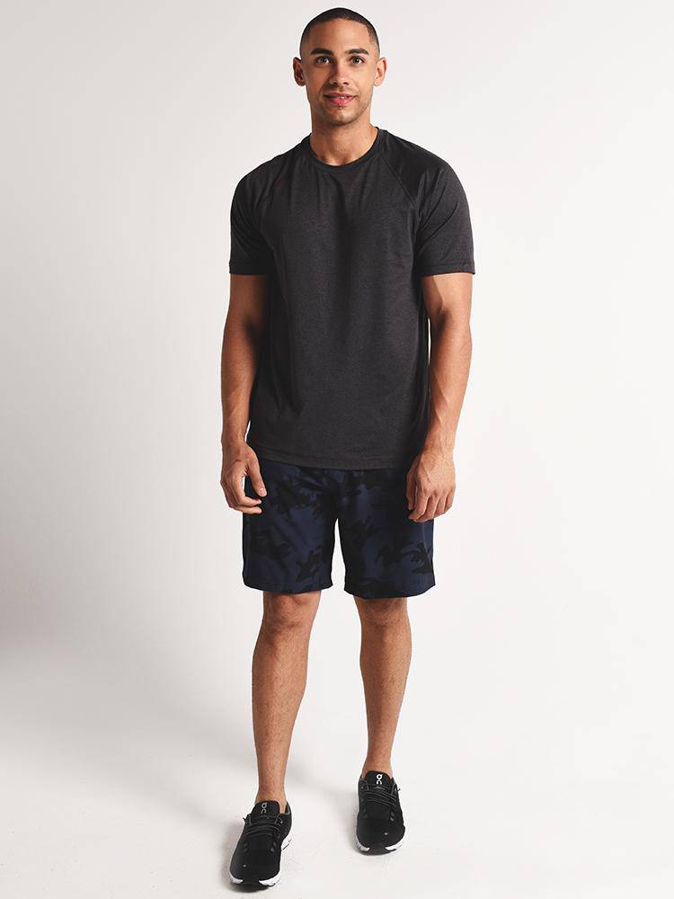 - Styled with Rhone tee Style # RGN-COR and On shoes Style # MENS CLOUD NEW. Model is wearing size medium short and shirt.