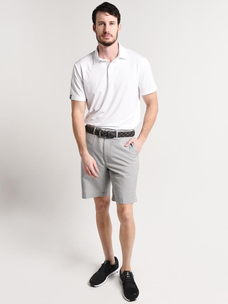 - Styled with Peter Millar shorts Style # MC0EB82. Model is wearing size medium polo and size 32 short.