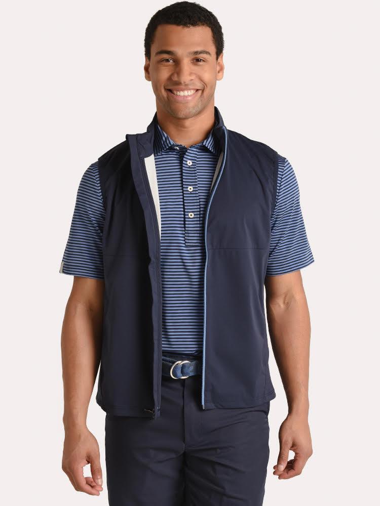 The RLX Paneled Interlock Golf Vest has water-repellent and wind-blocking properties that will keep you dry and comfortable swing after swing.