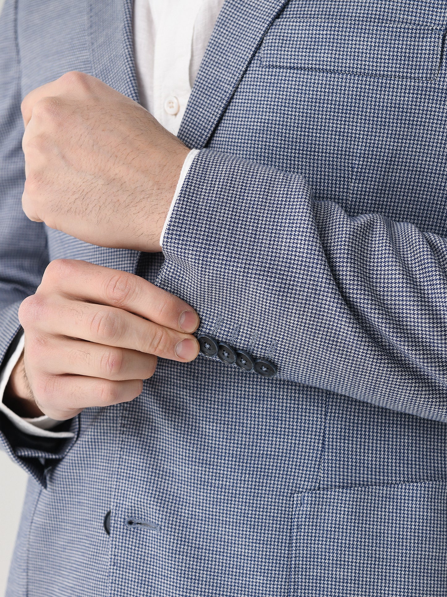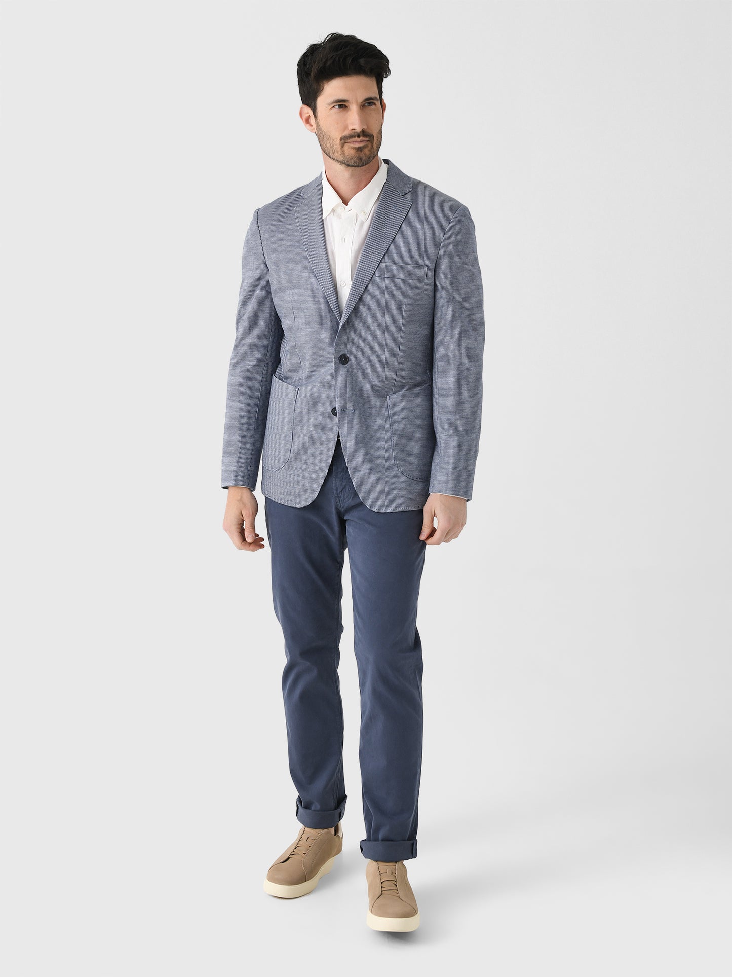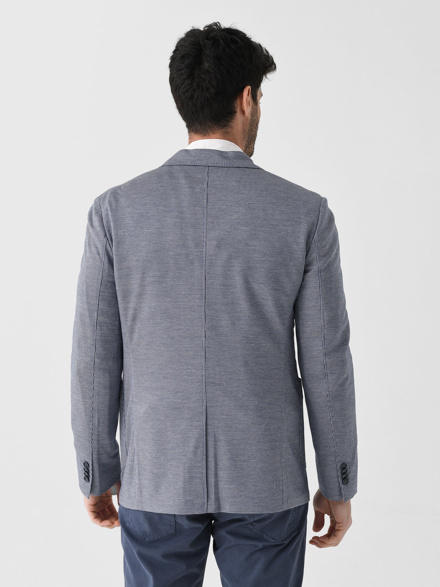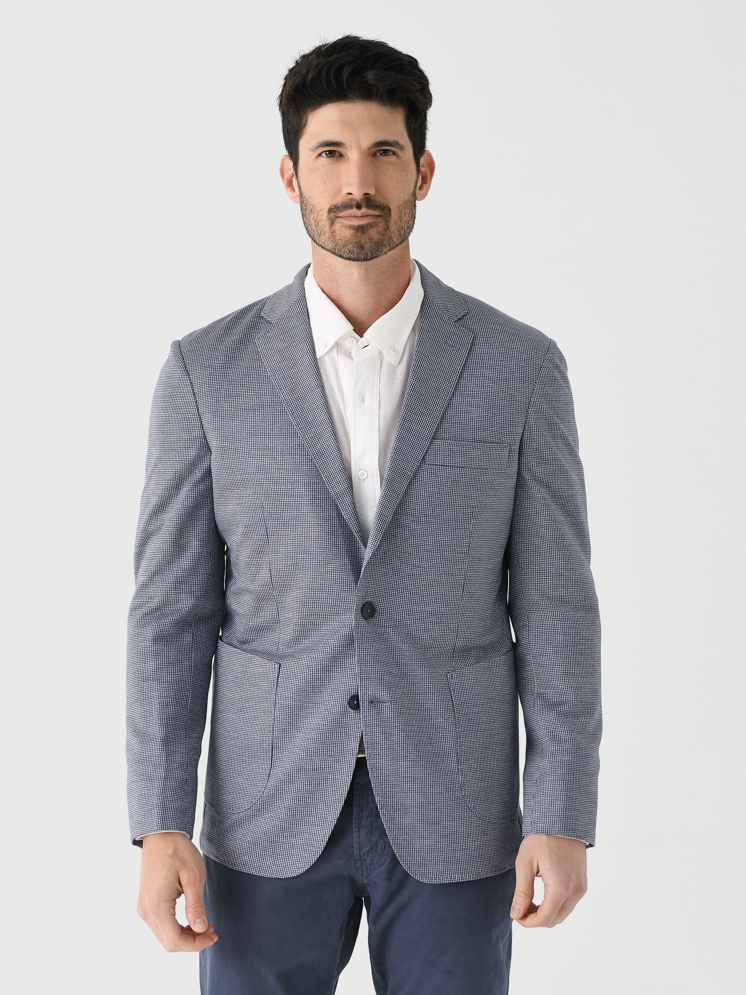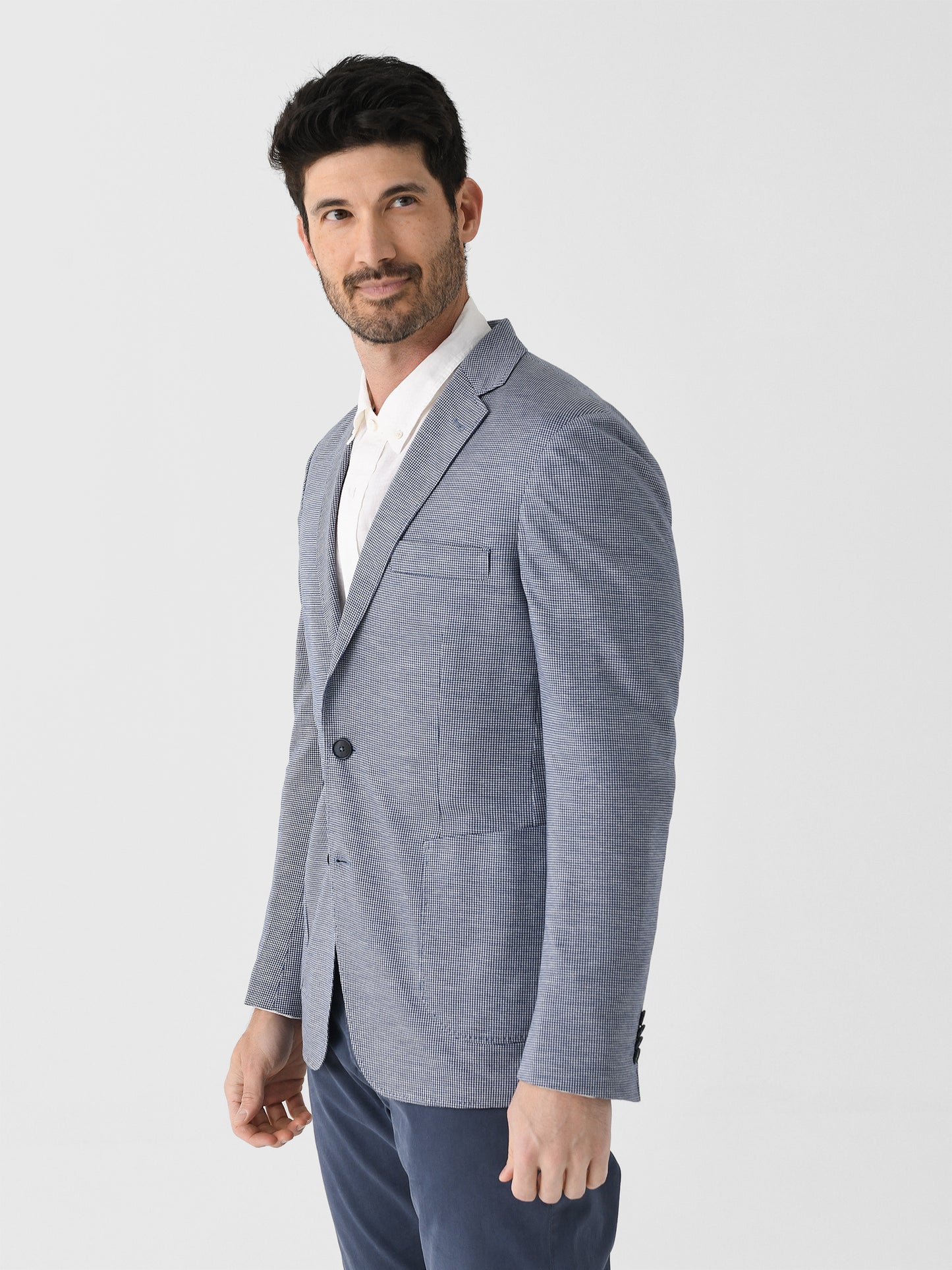 This jacket boasts an Italian-woven lyocell-wool blend with a refined micro-houndstooth pattern. Its deconstructed construction and natural shoulder padding provide a comfortably sophisticated feel.