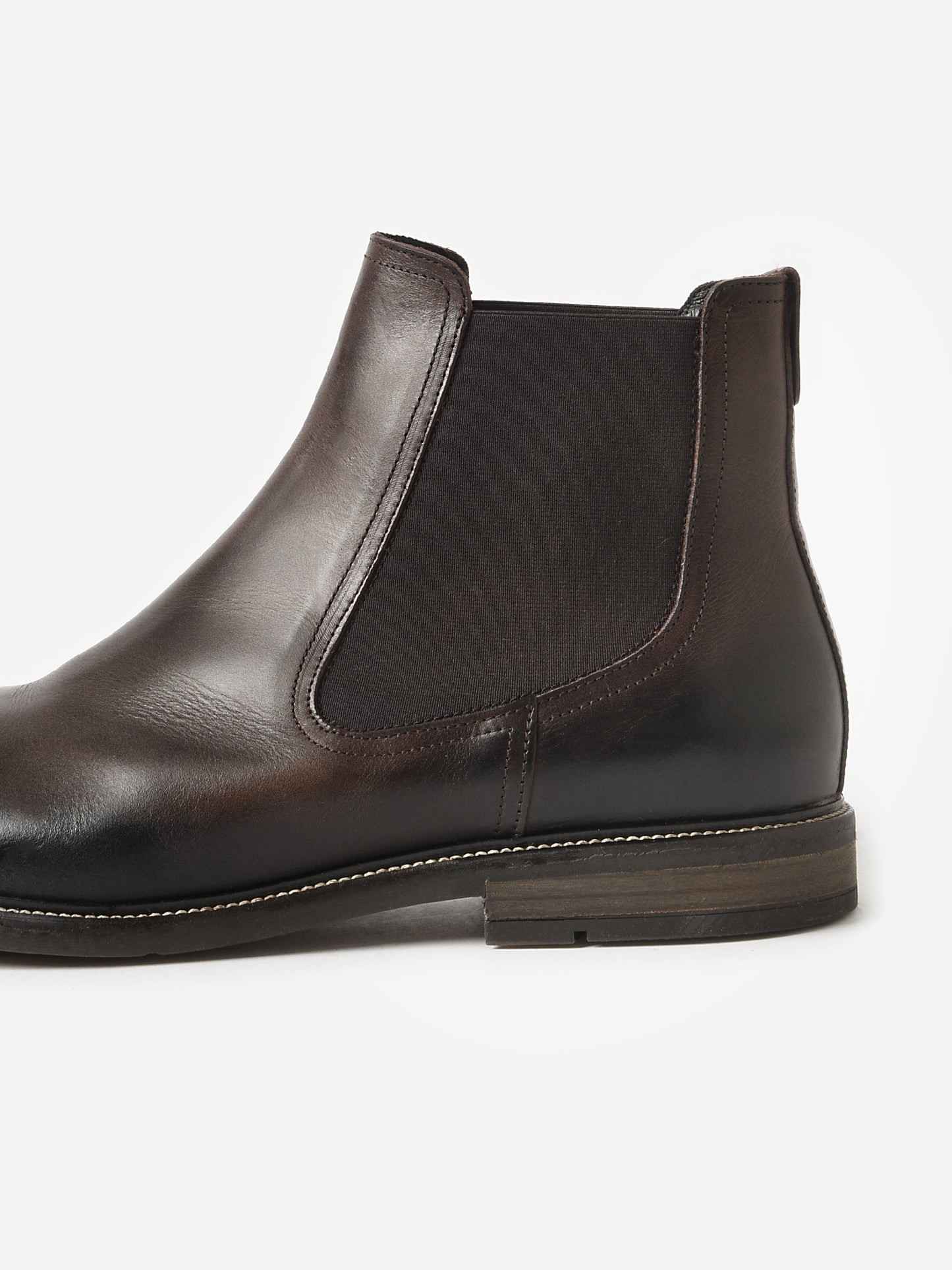 A classic Chelsea boot crafted with a burnished European bovine leather upper and two-tone antique rubber sole.