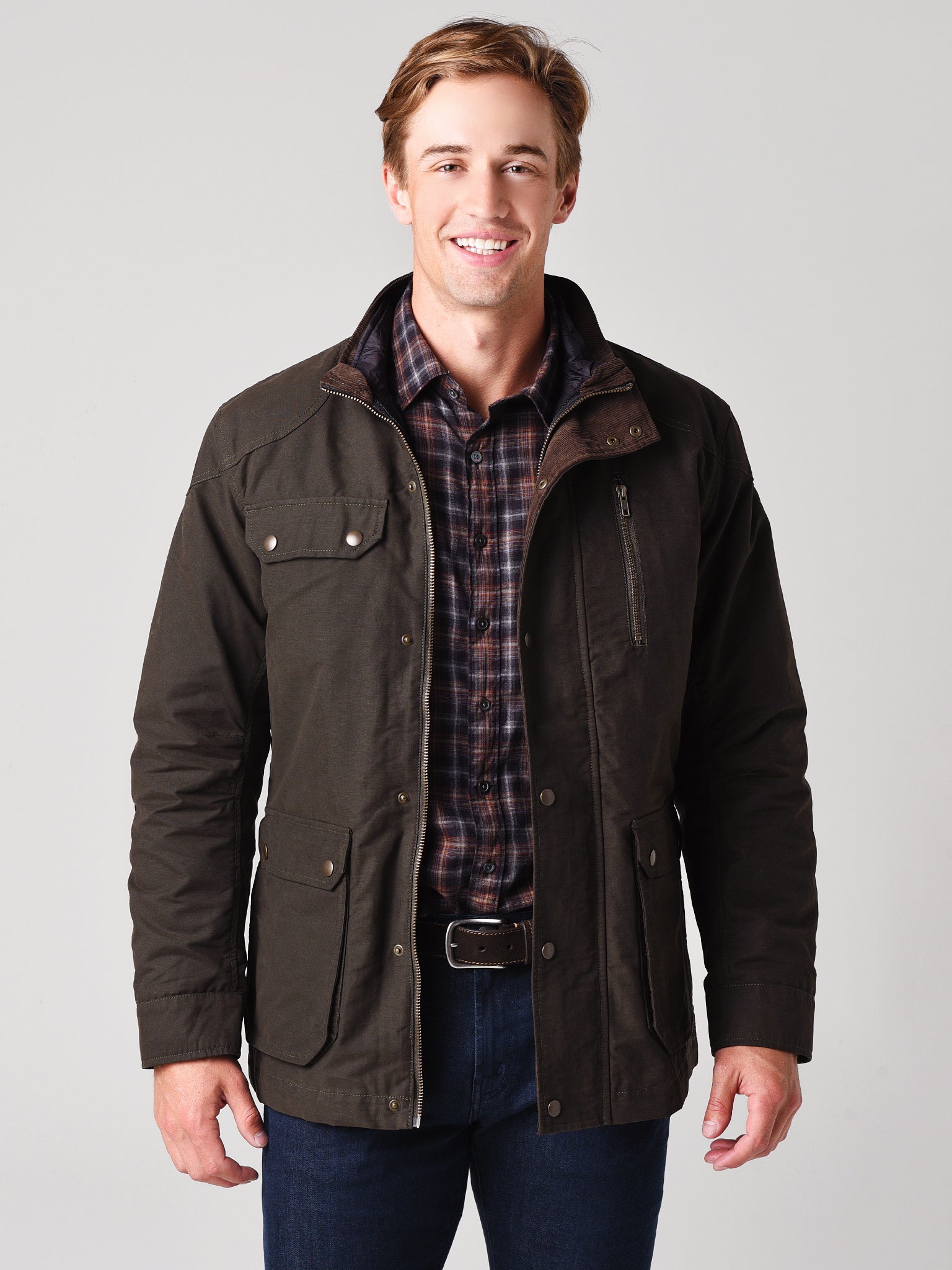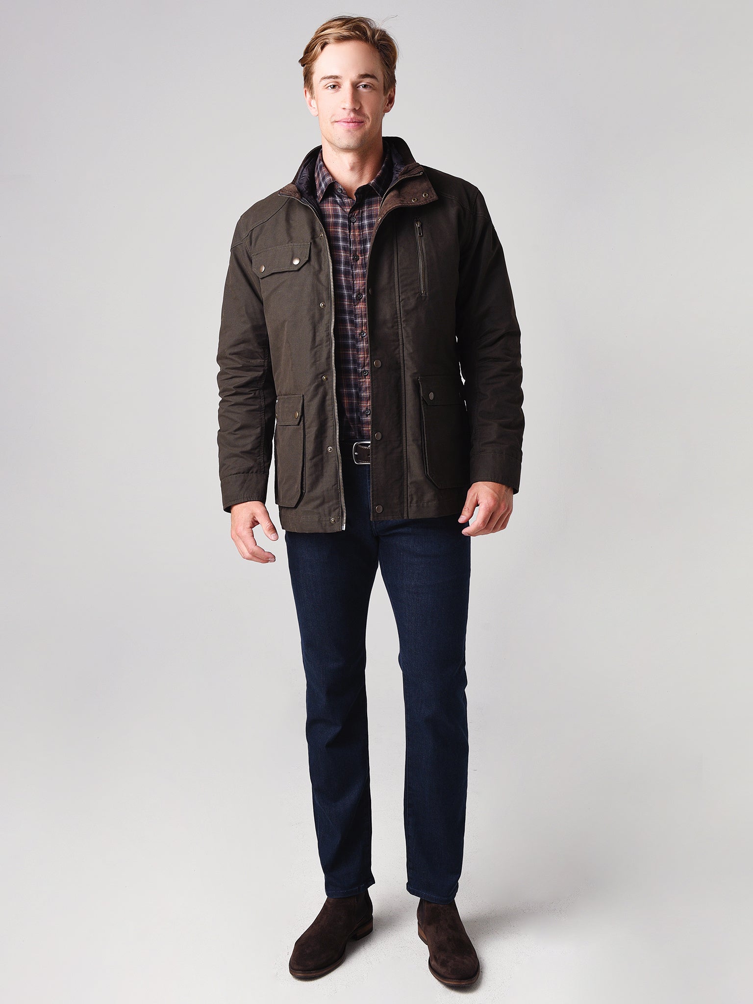 - 2 Front Welt Pockets, 2 Internal Chest Pockets