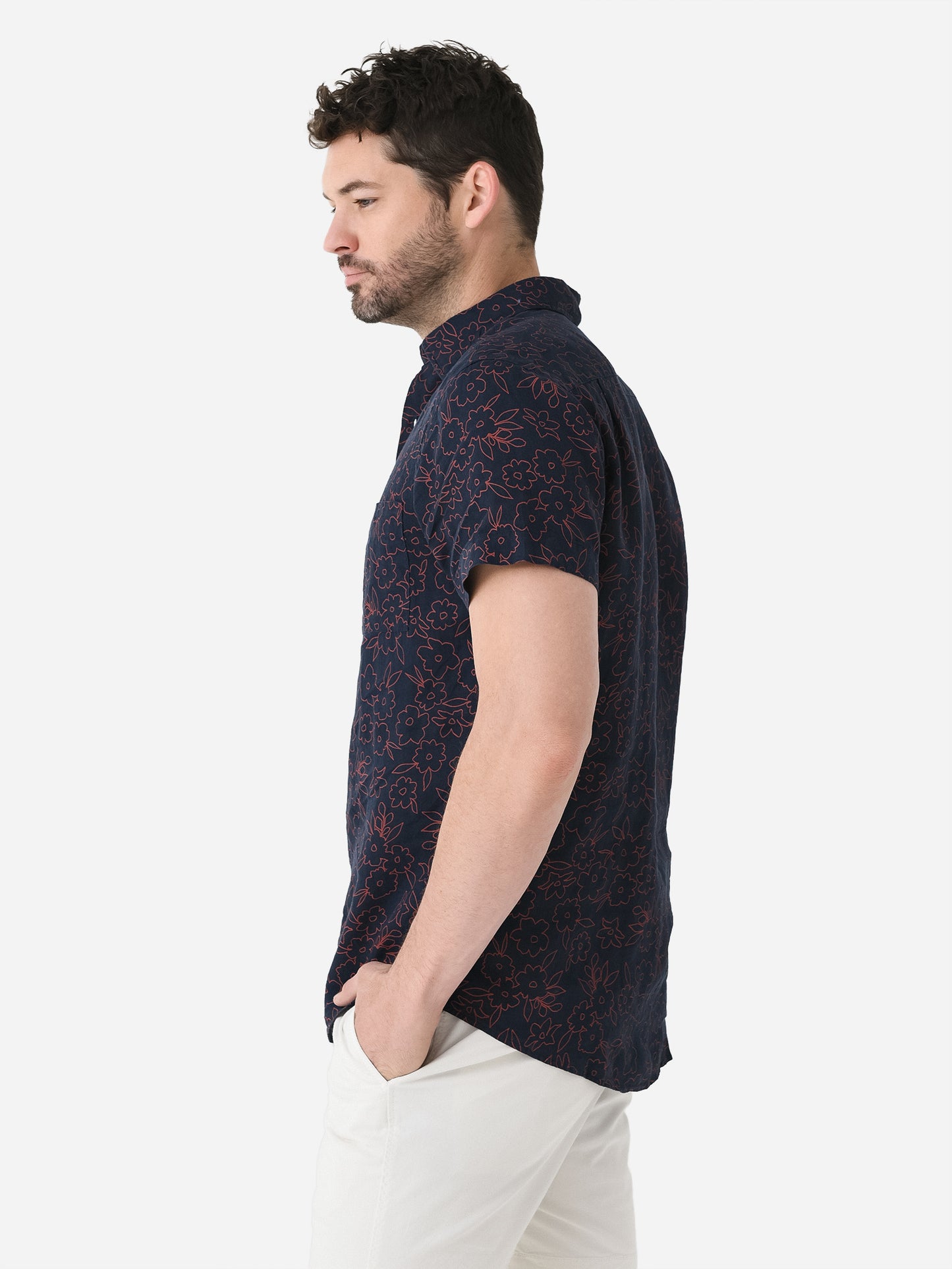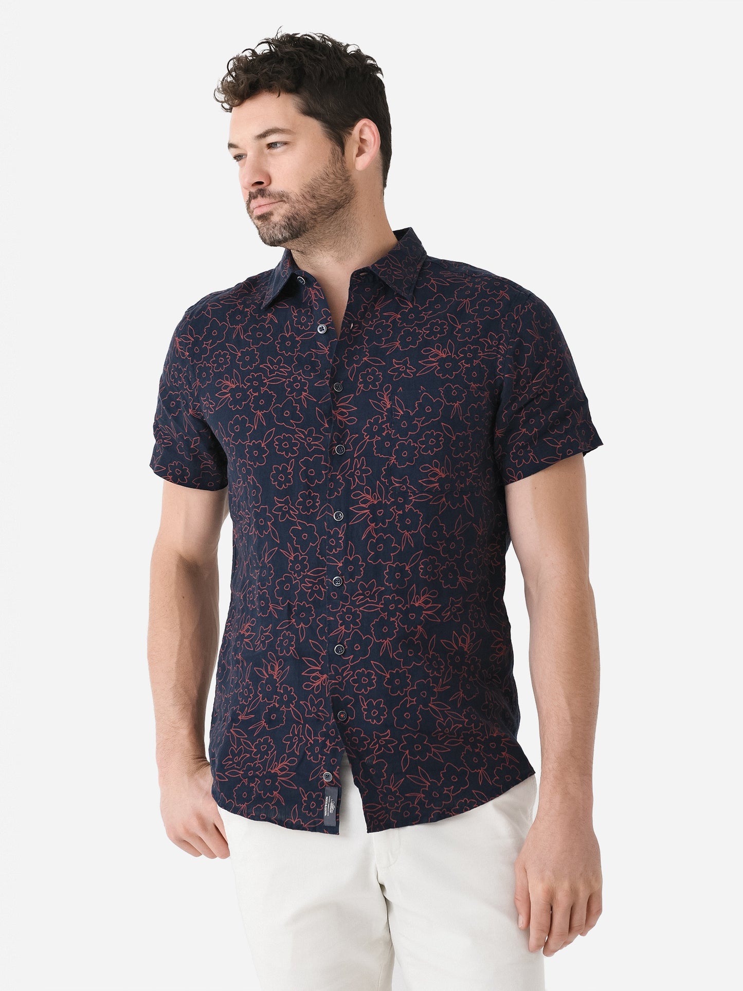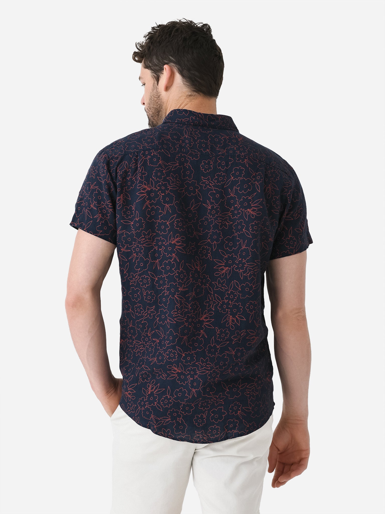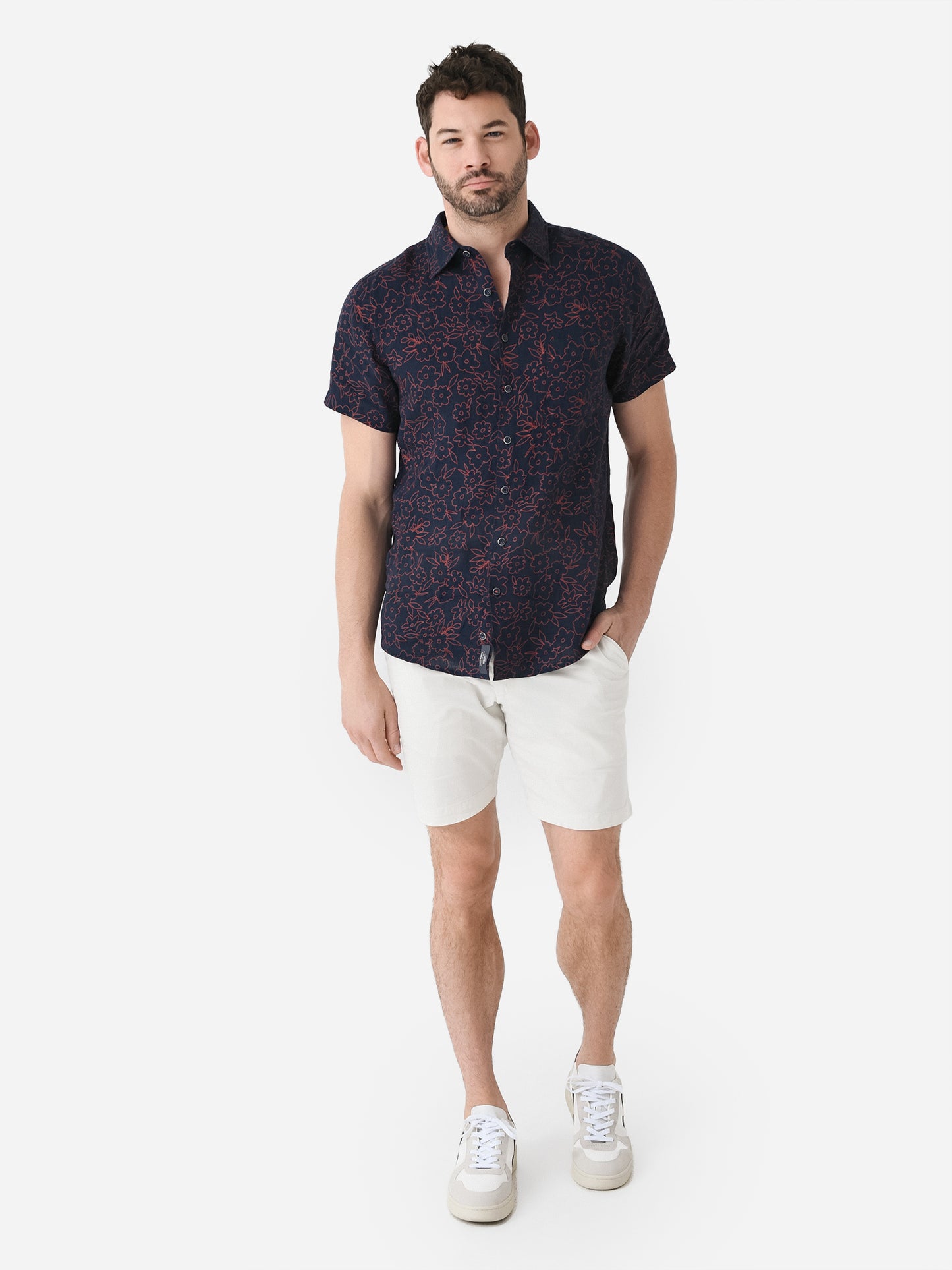 A sophisticated linen shirt complimented by a playful geo-floral print.