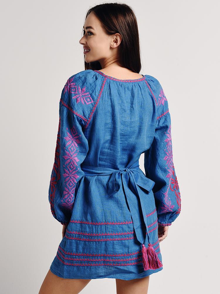 - Bohemian tunic dress with intricate embroidery and multiple tassel details