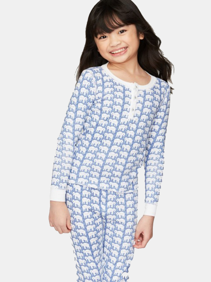 Two Piece Pajama Set Pullover Top Button Placket Wrist and Ankle Cuffs Snug Fit - Runs Small All Over Elephant Print Made in Peru 100% Pima Cotton