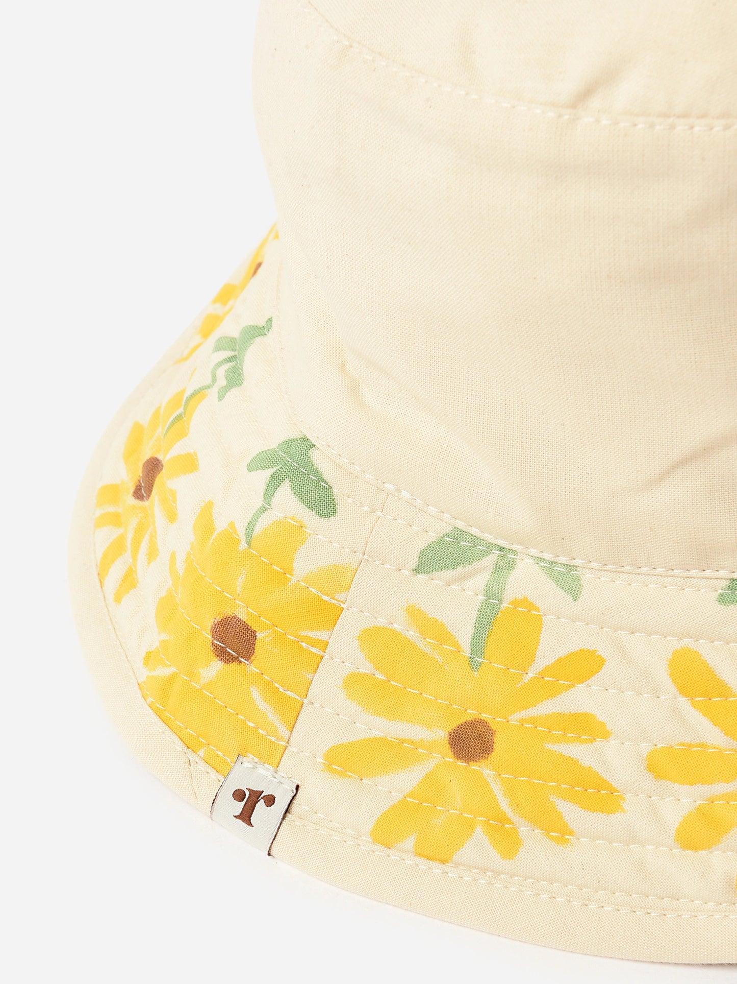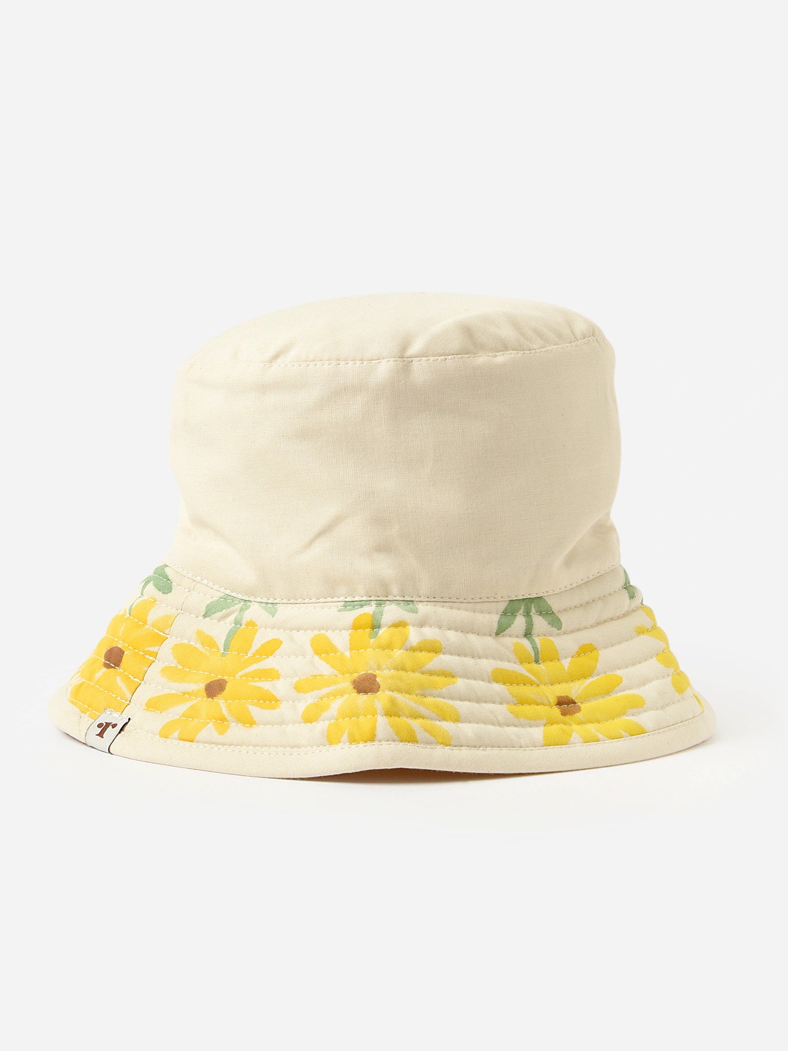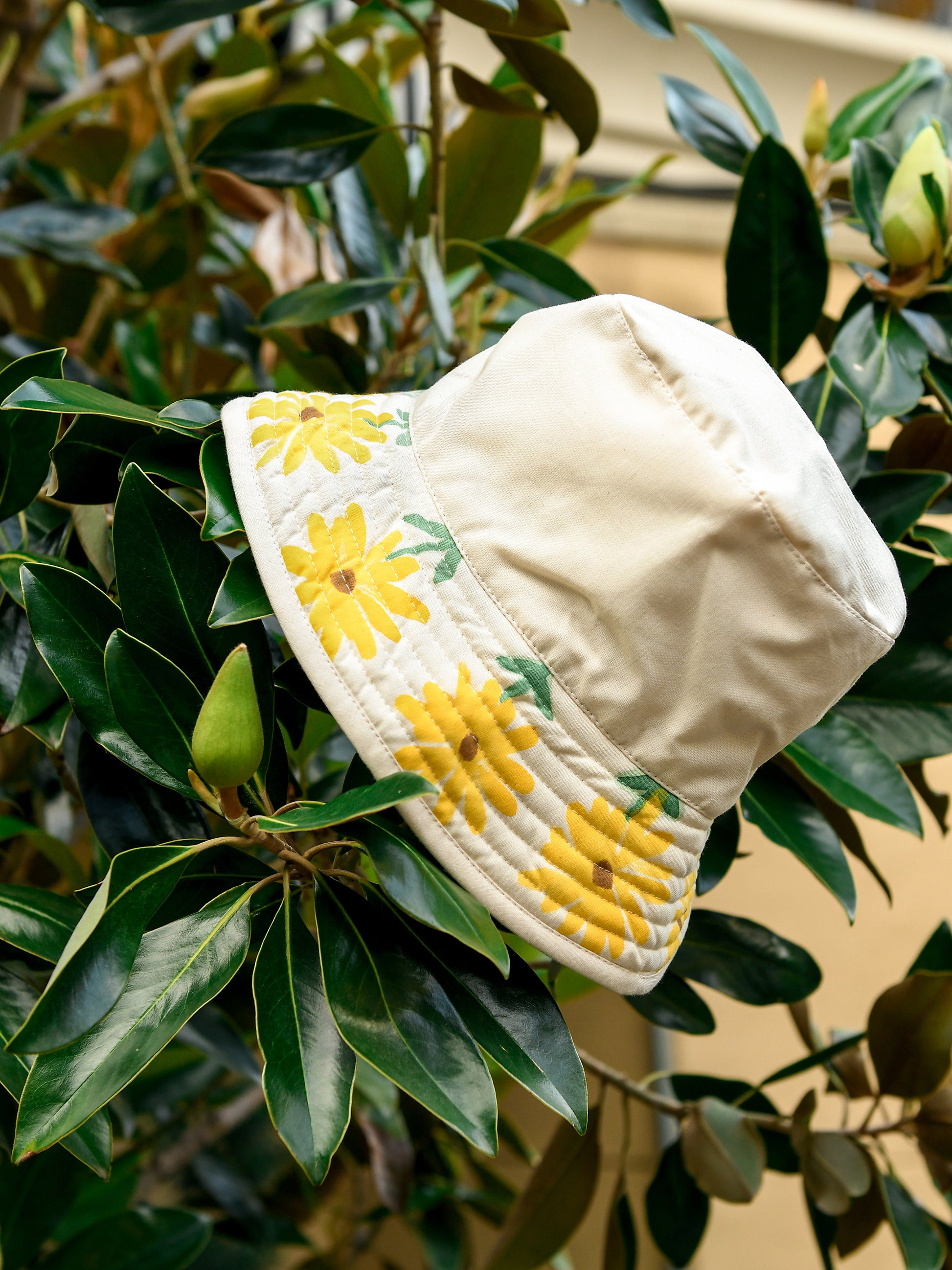 A fully reversible organic cotton bucket hat with hand-painted flowers.