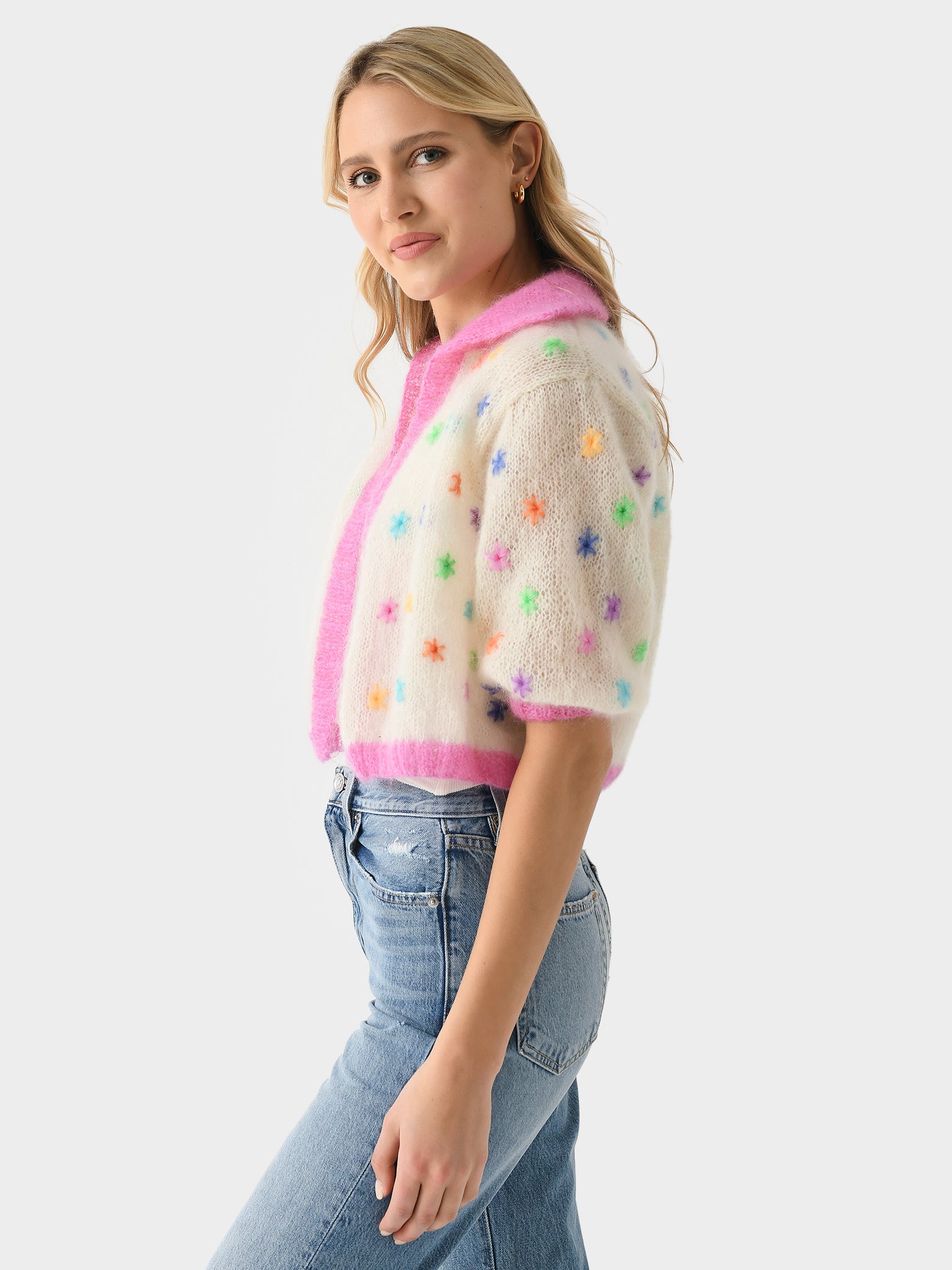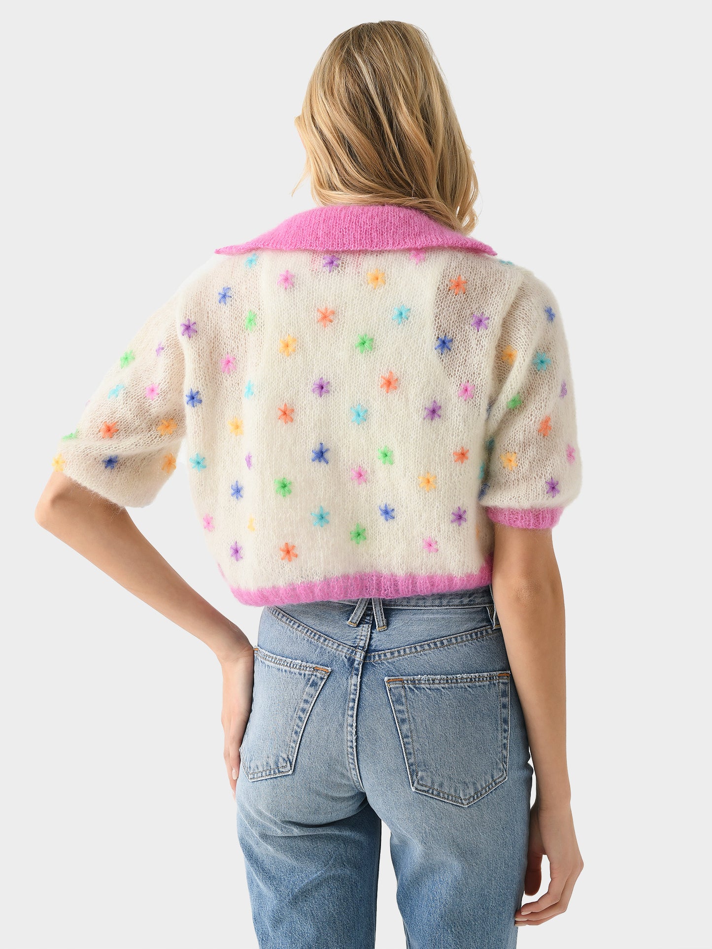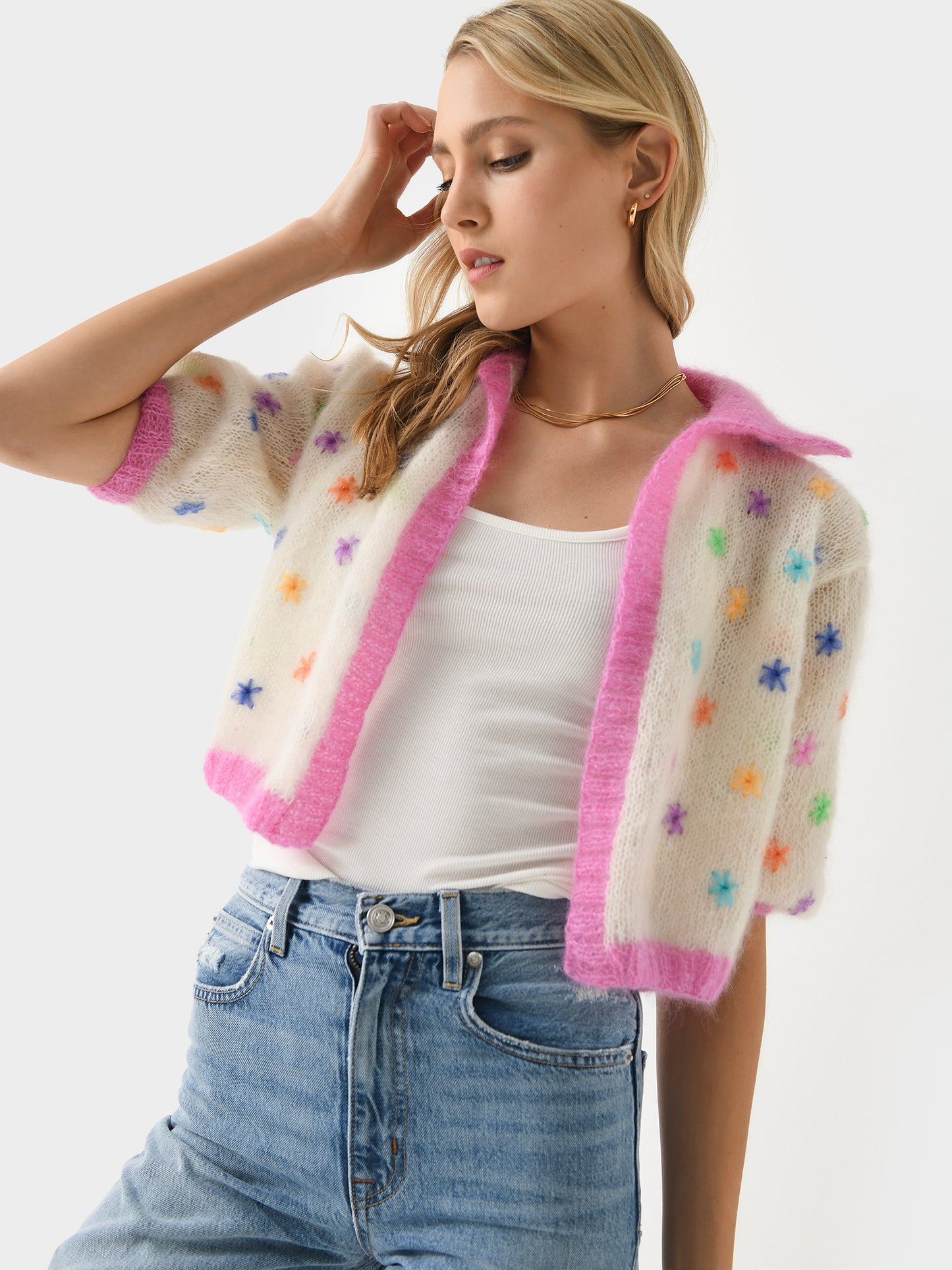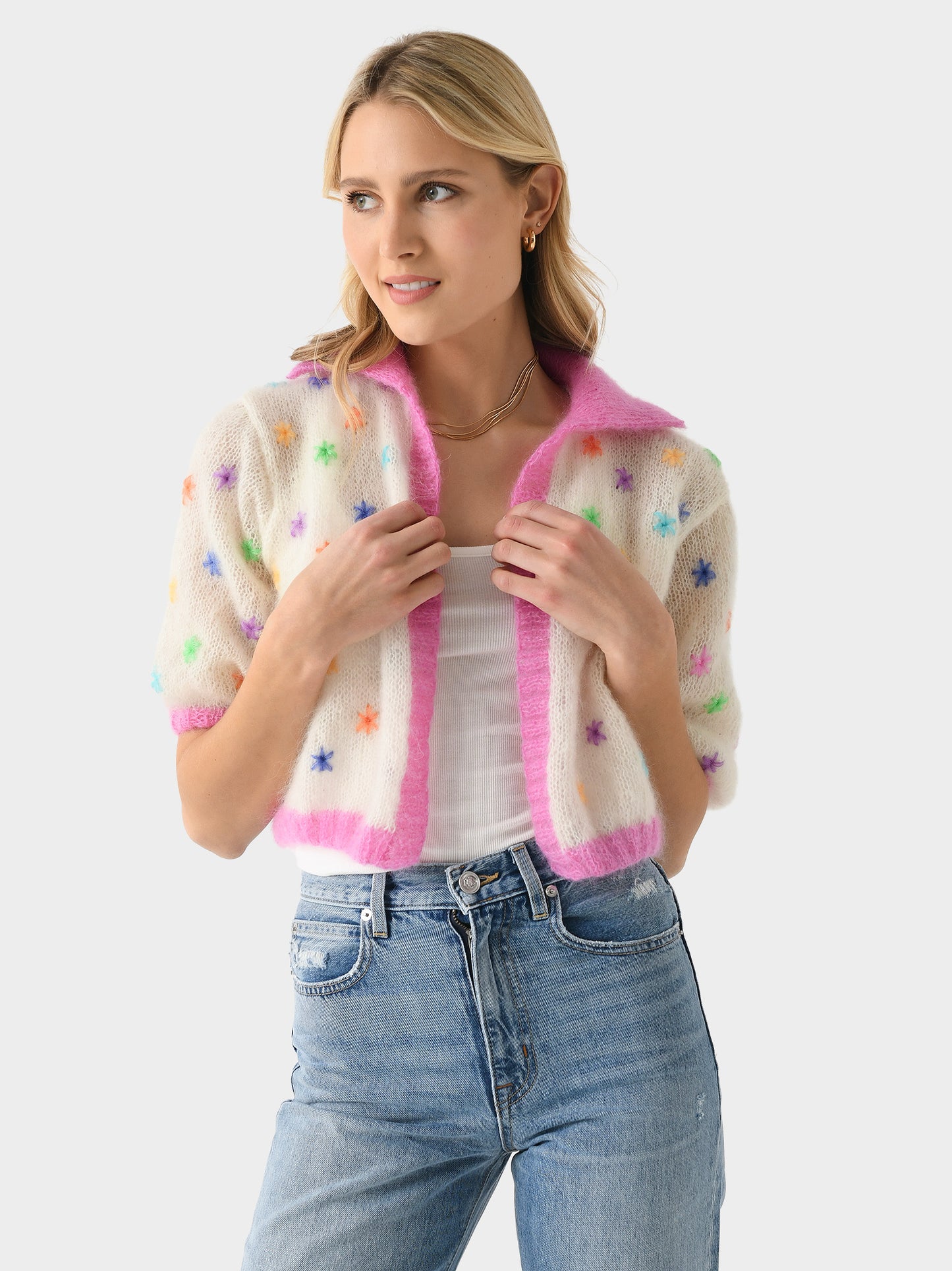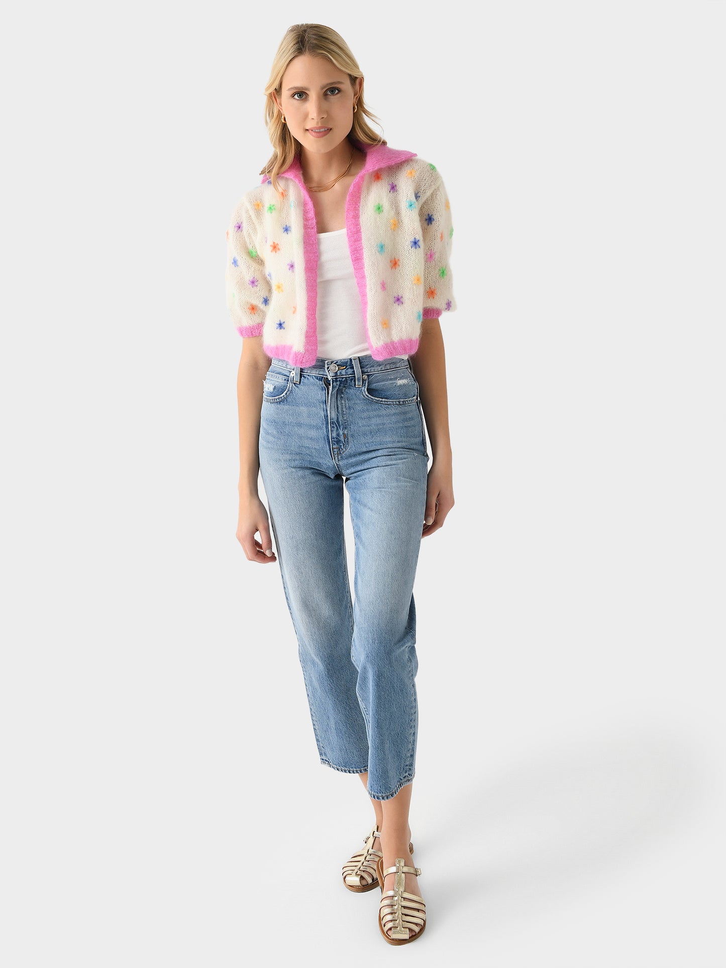 A hand-knit, open-front cardigan with balloon sleeves and colorful all-over knit stars.