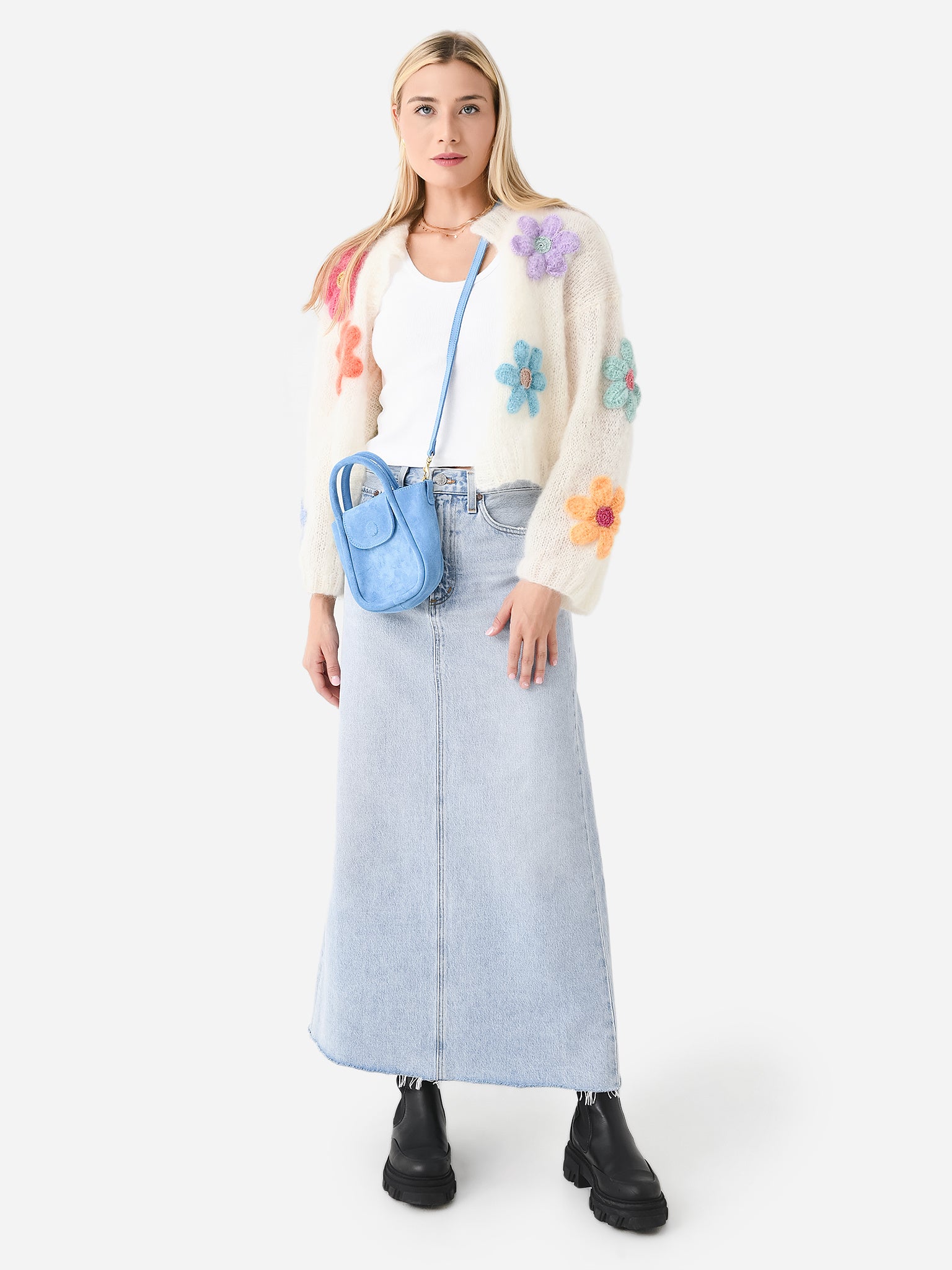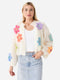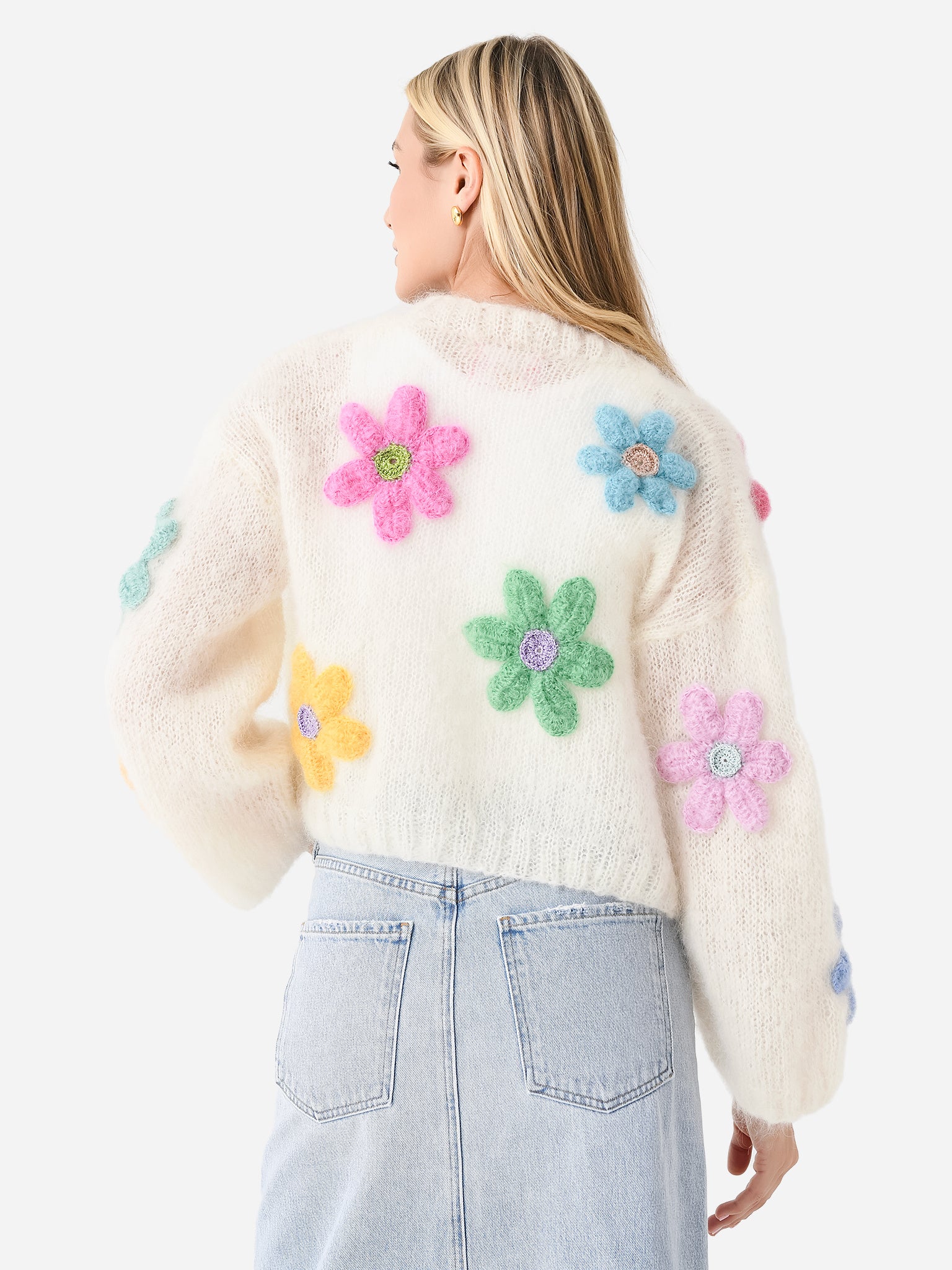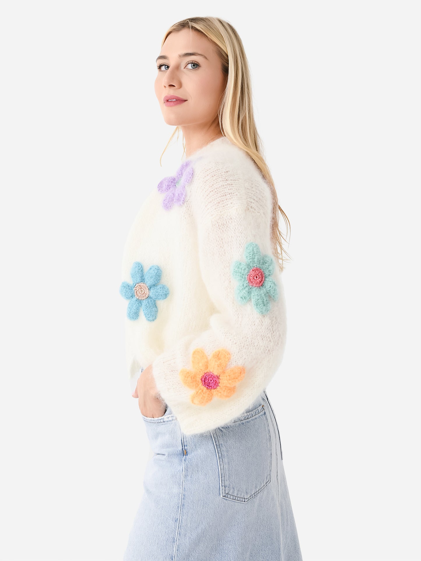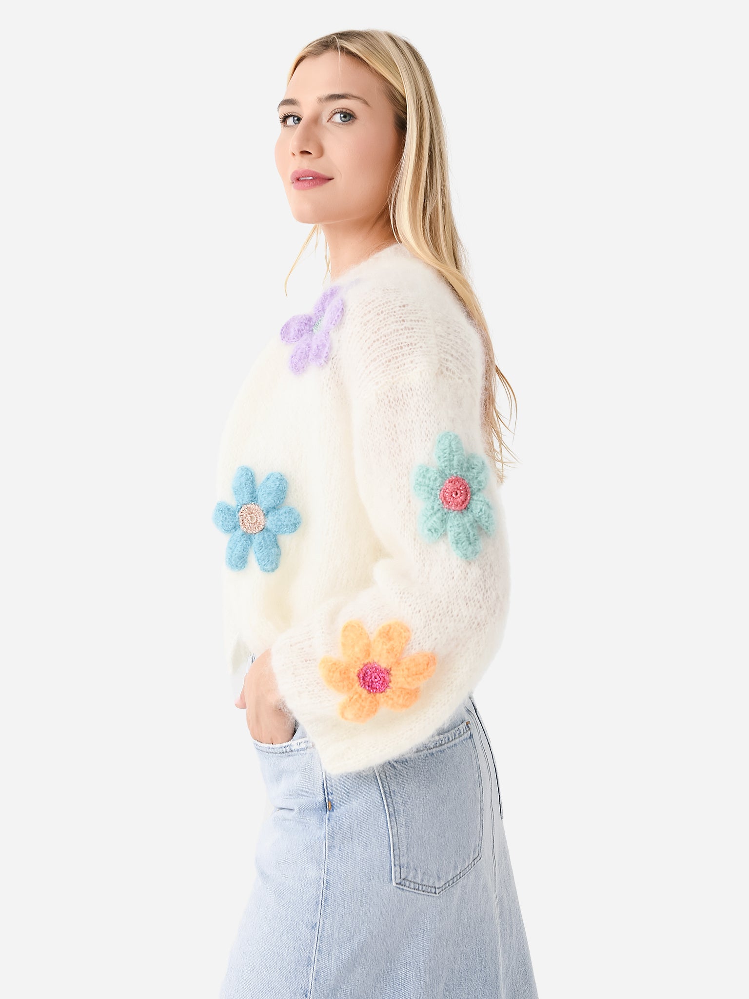 Hand-knitted open-front cardigan with colorful floral appliqués.