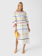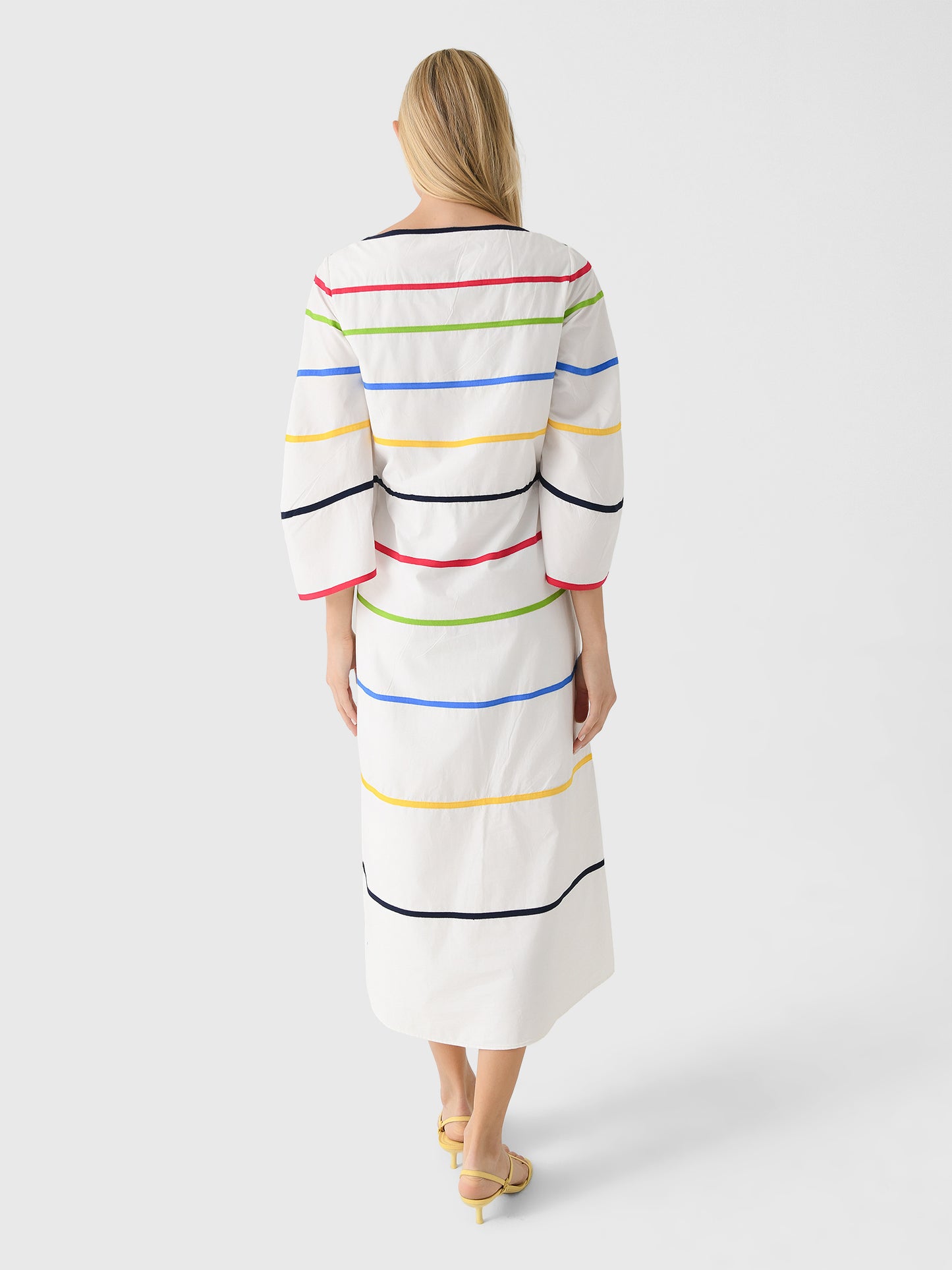 This lightweight midi dress with bold, multi-colored stripes offers a modern and playful look. It features wide, elbow-length sleeves and a drawstring waist.