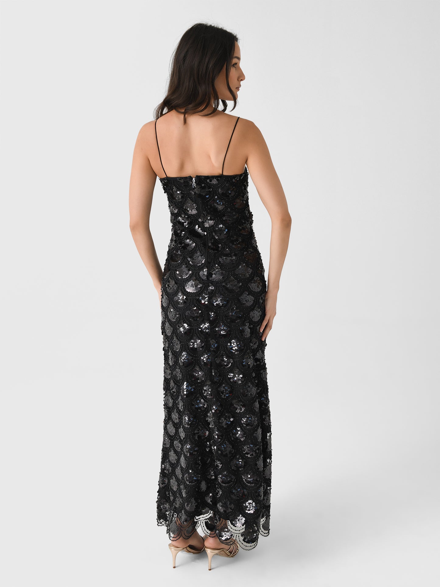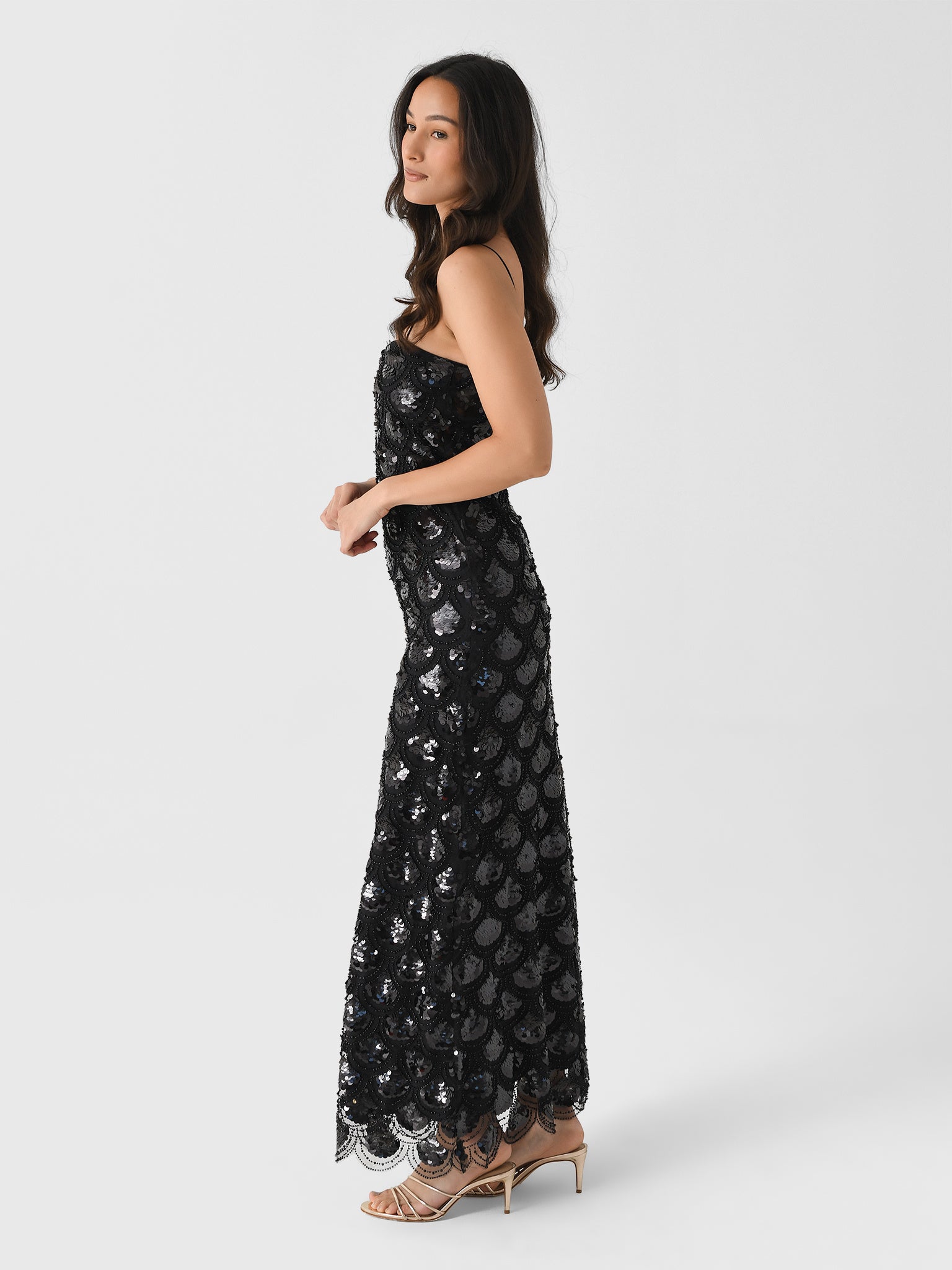 This fashionable maxi dress features a flattering slip design made from shimmering scalloped sequin fabric.