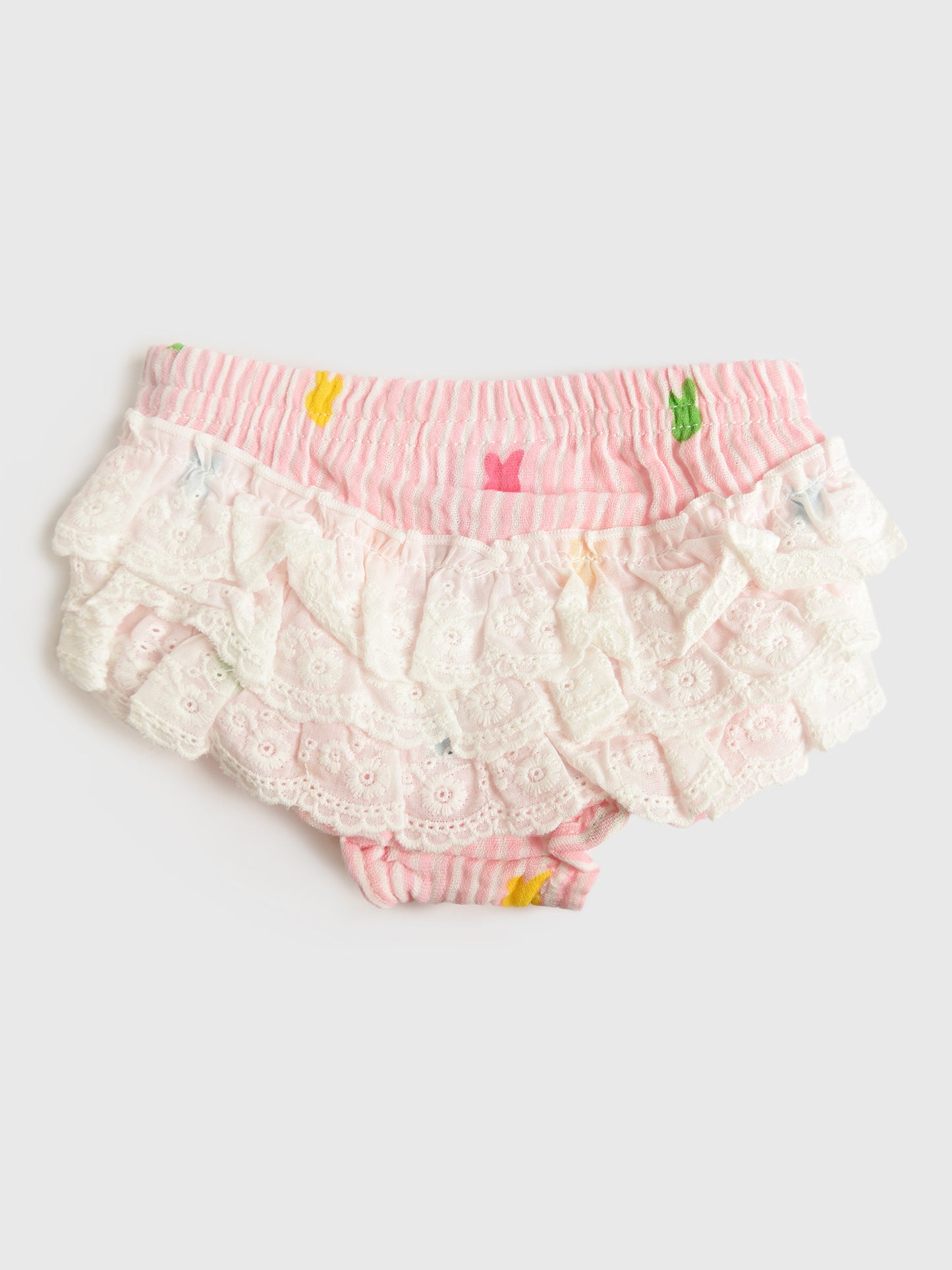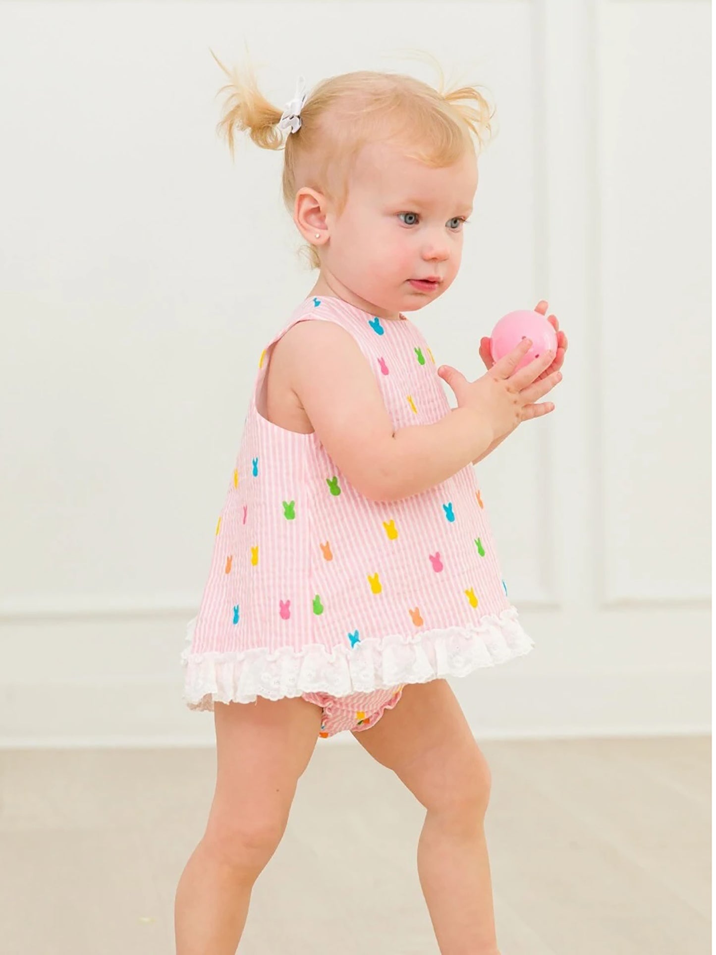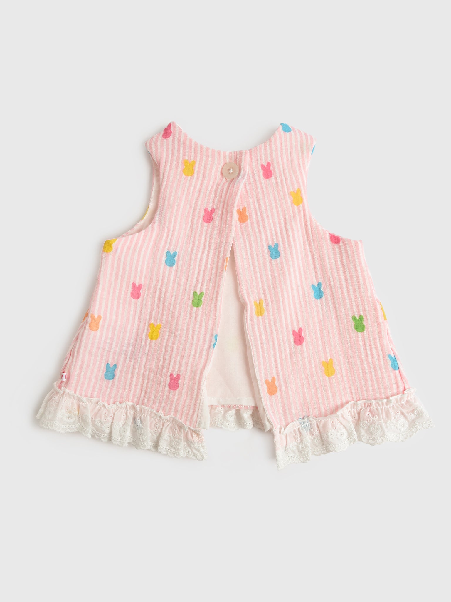 This top and bloomer set is made from lightweight cotton gauze with a custom stripe and bunny print.