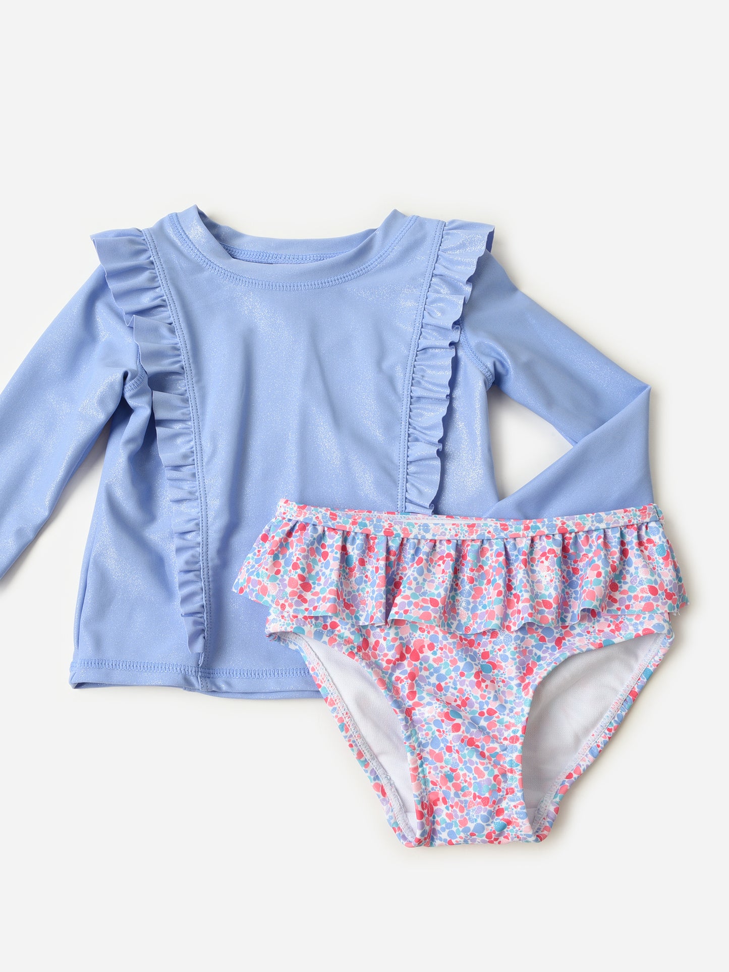 A two-piece rashguard swimsuit with ruffle details and sun protection technology.