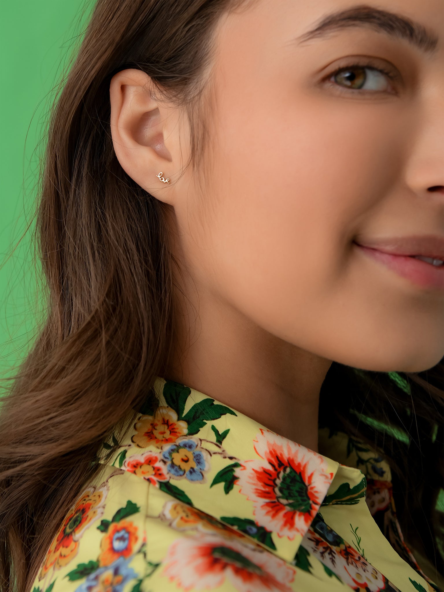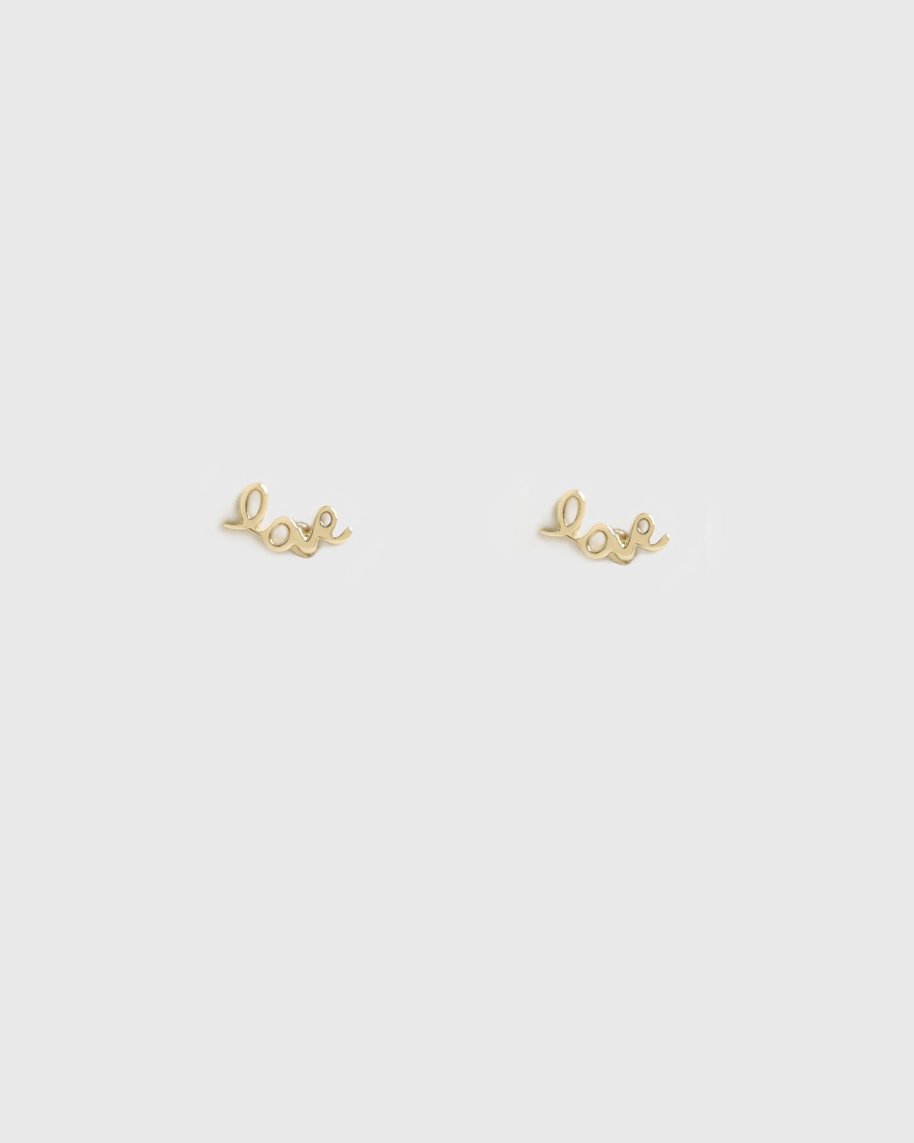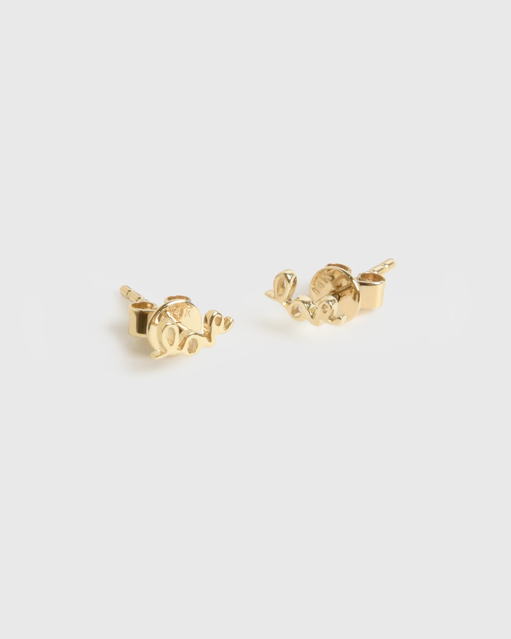 A pair of 14-karat yellow gold earrings with a cursive script design.