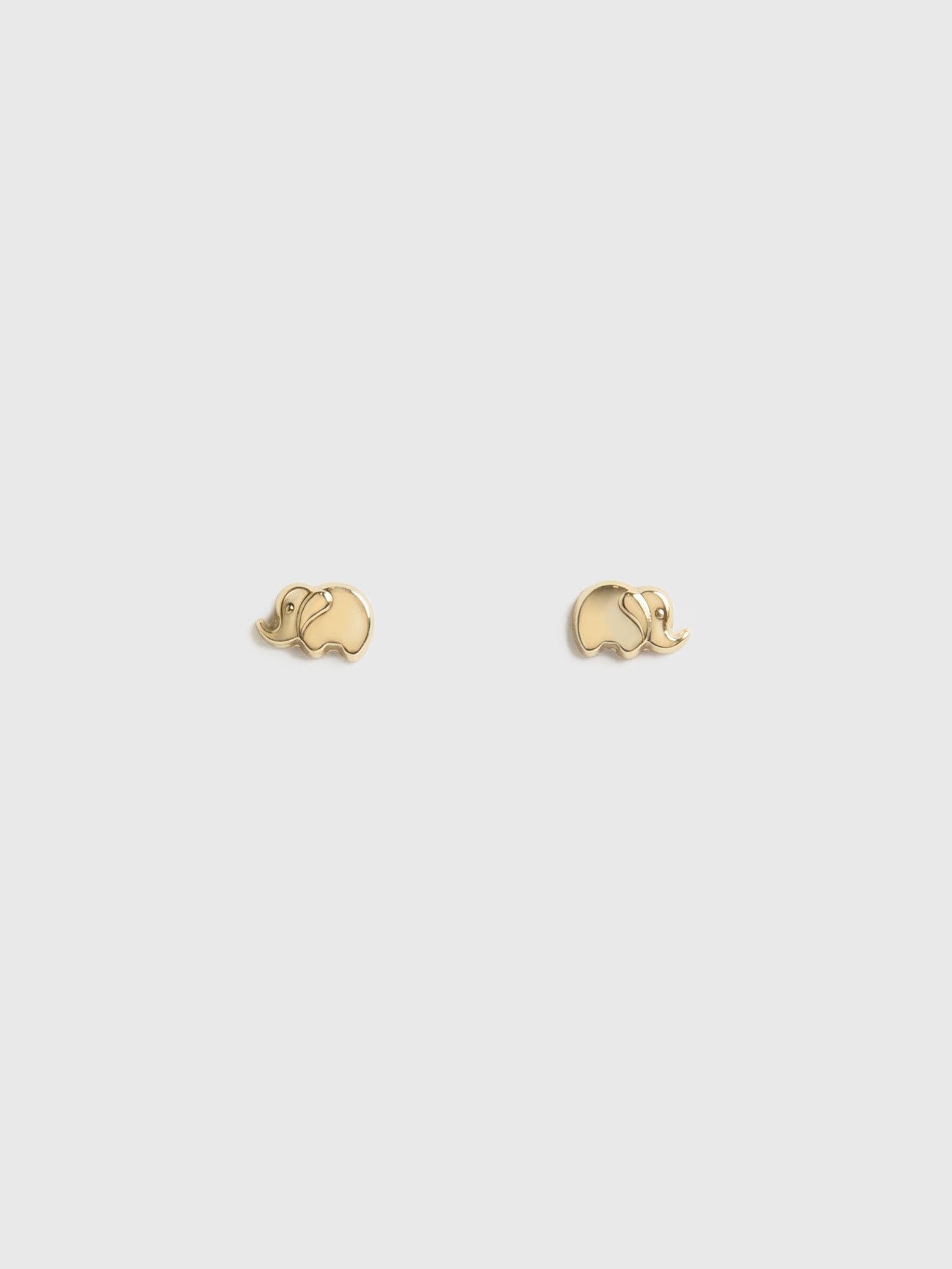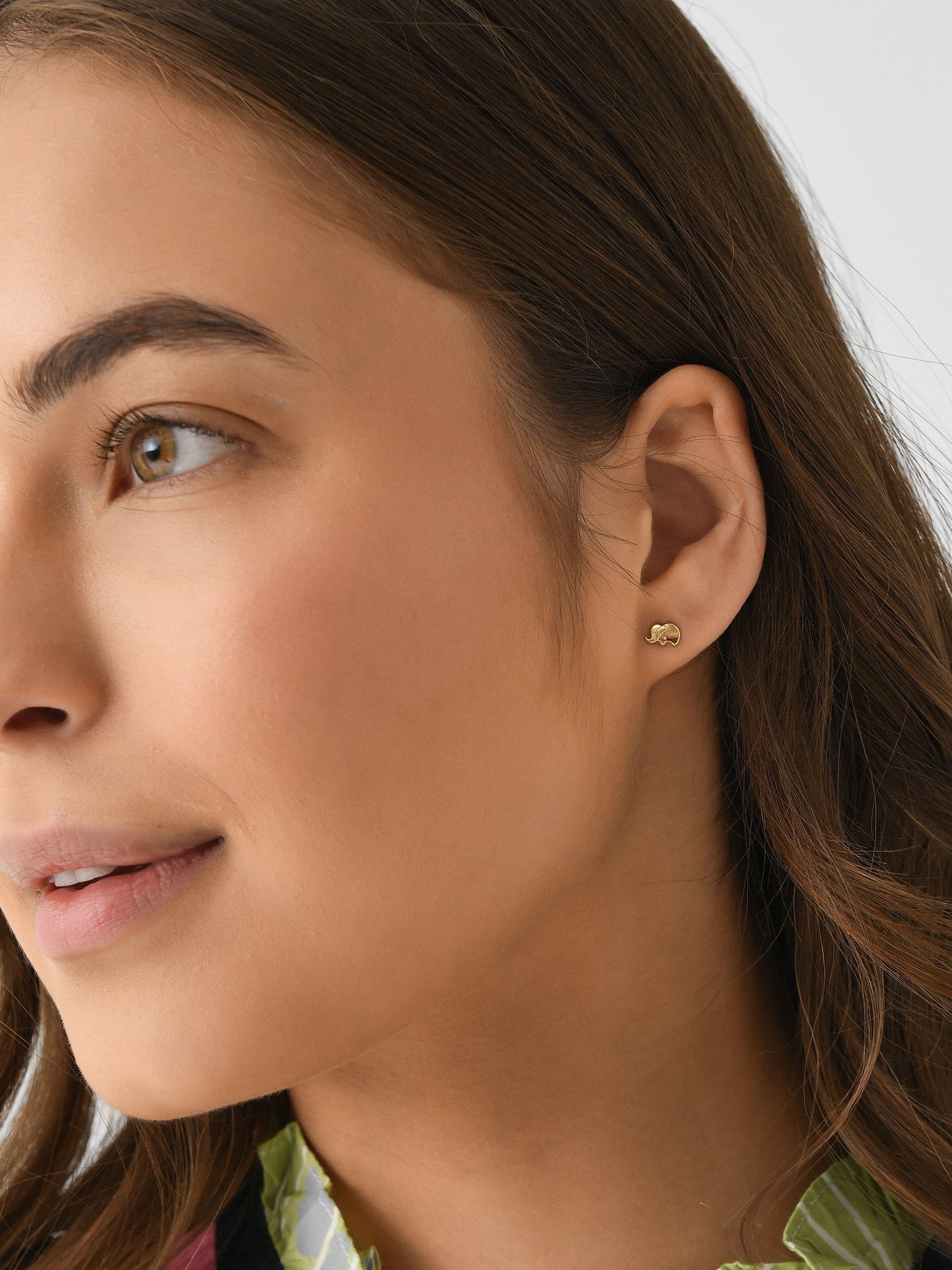 A pair of dainty elephant stud earrings made from 14-karat yellow gold.