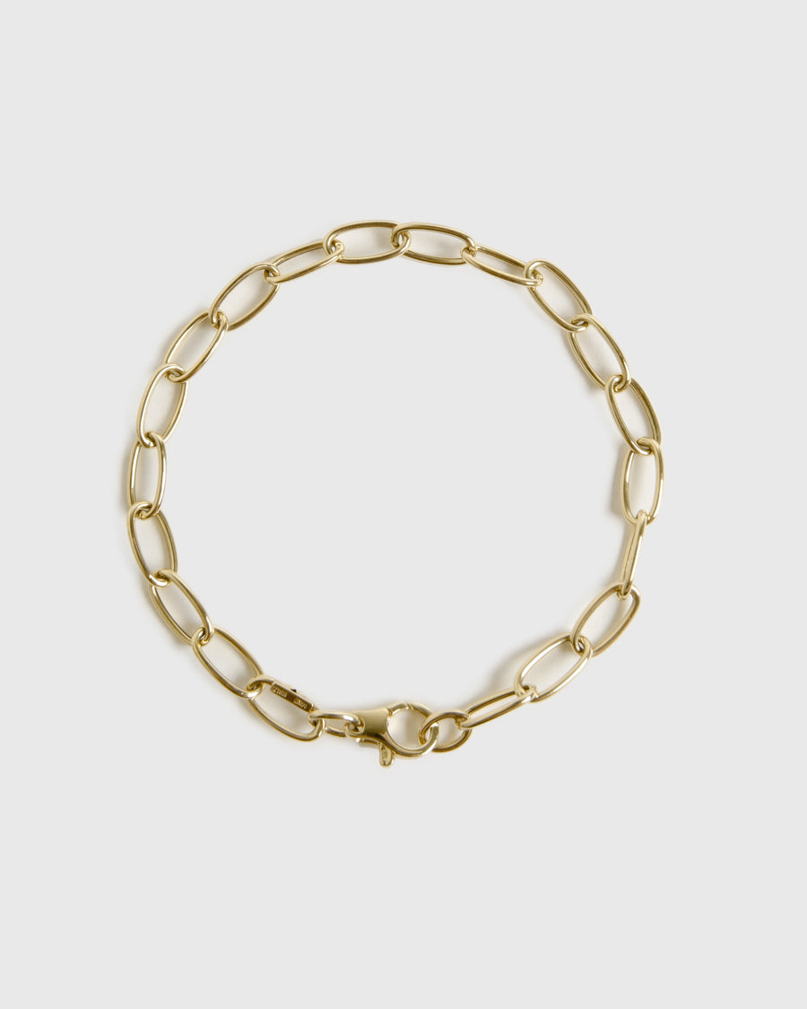 A high-shine 14-karat yellow gold chain bracelet featuring oval links and a lobster clasp.