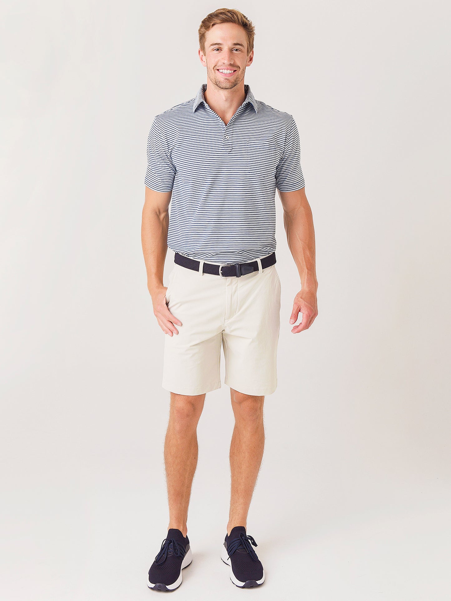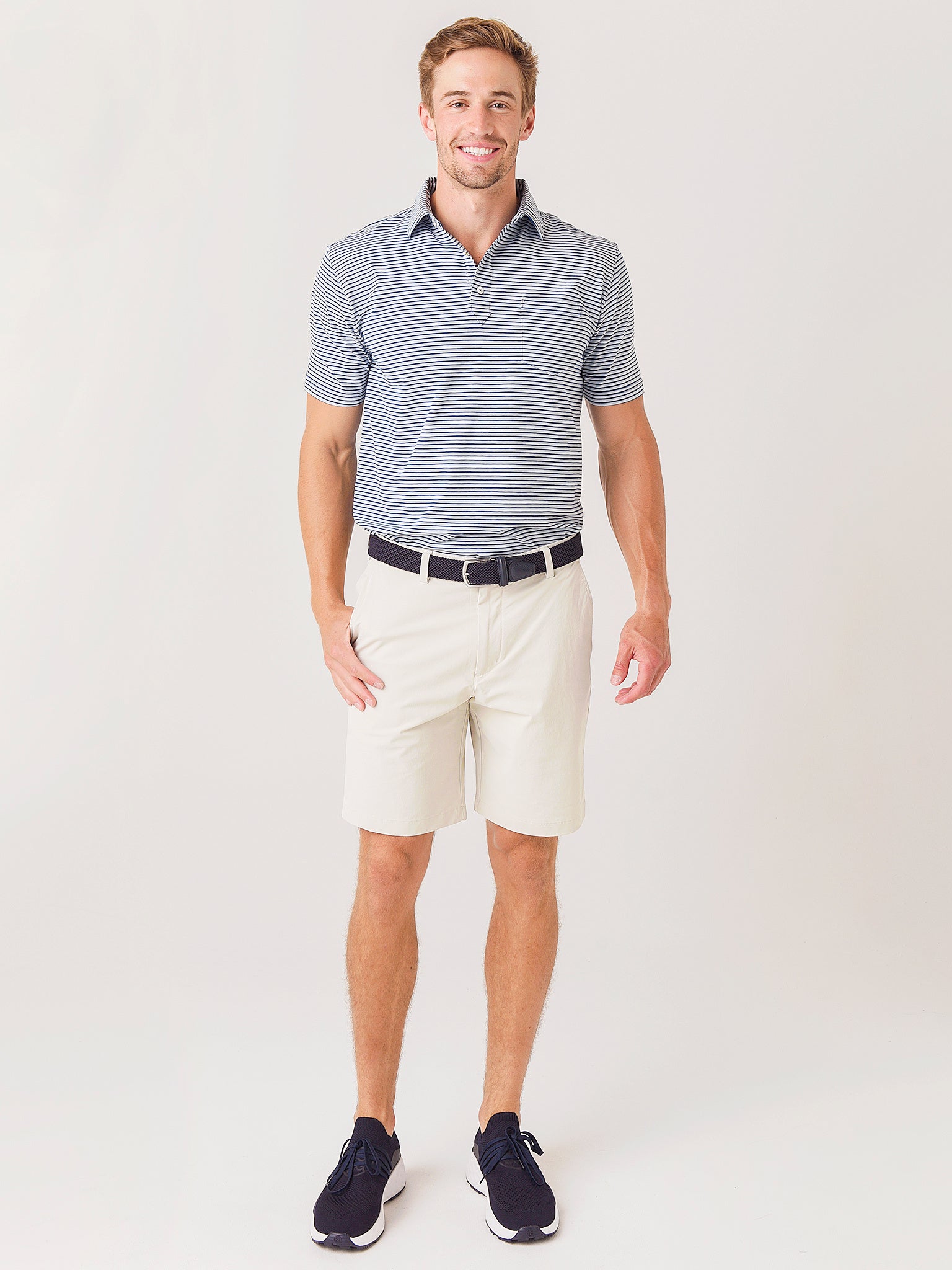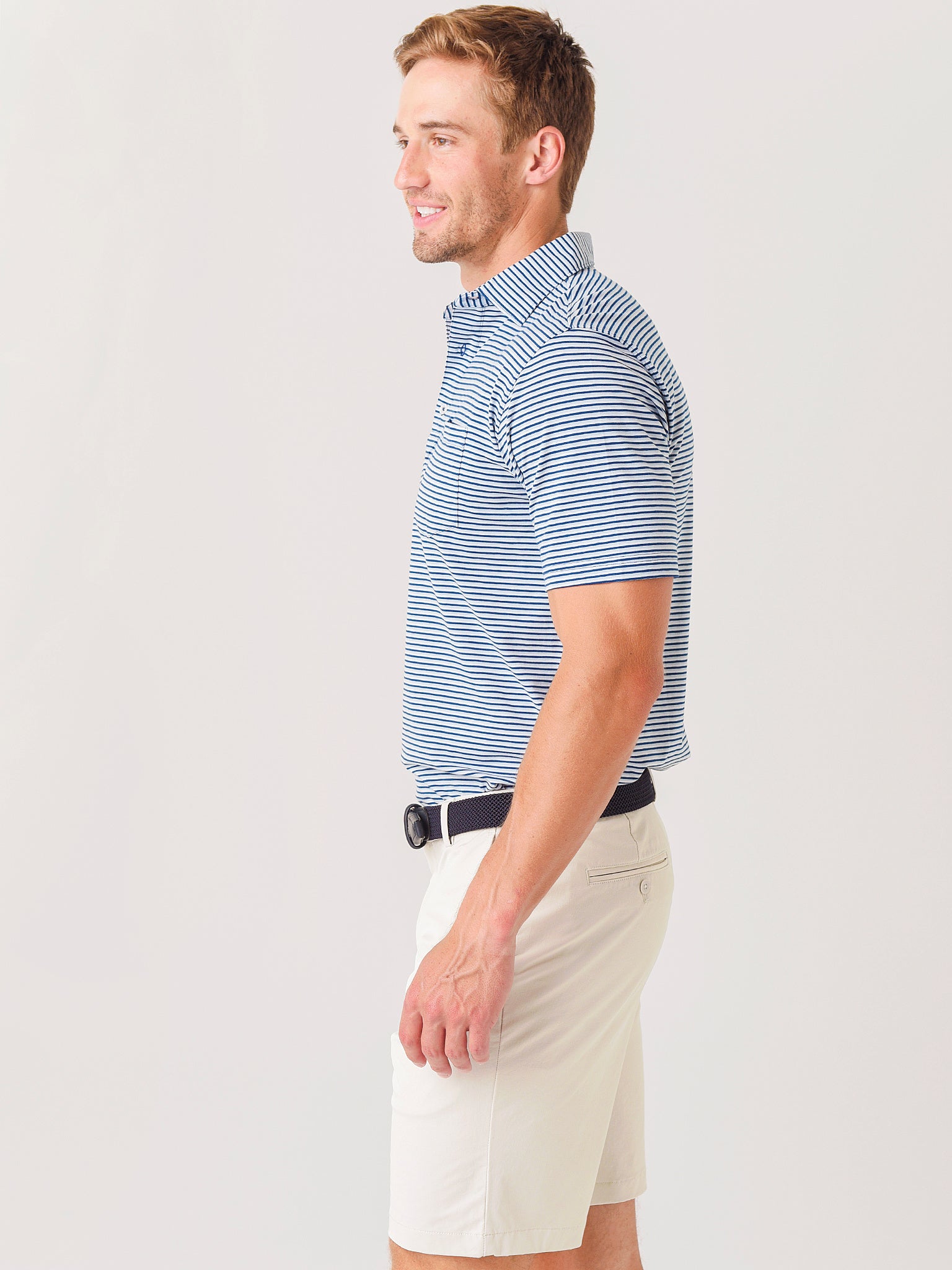 - Model is wearing size Medium polo.