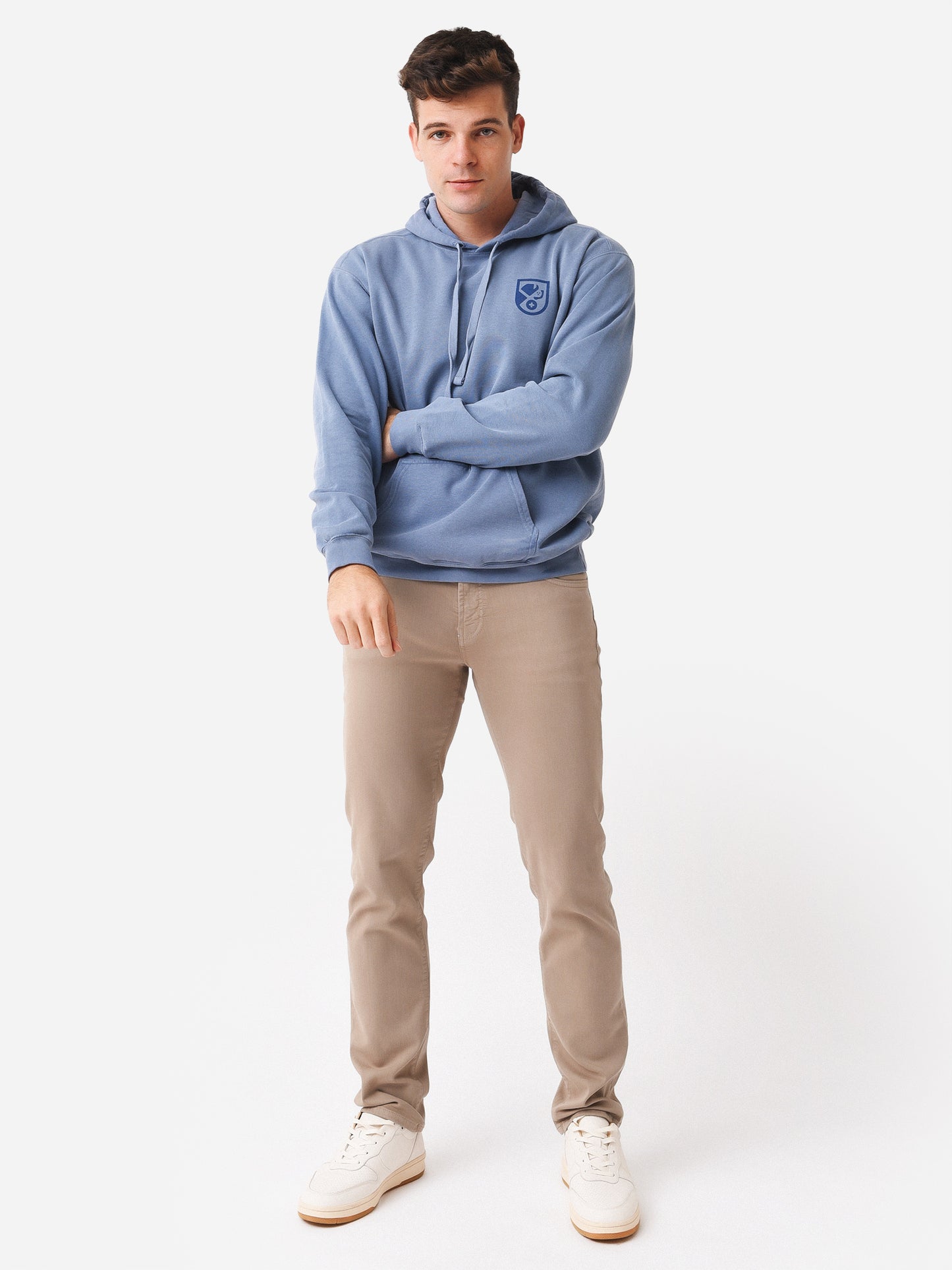 - Model is wearing size Medium hoodie.