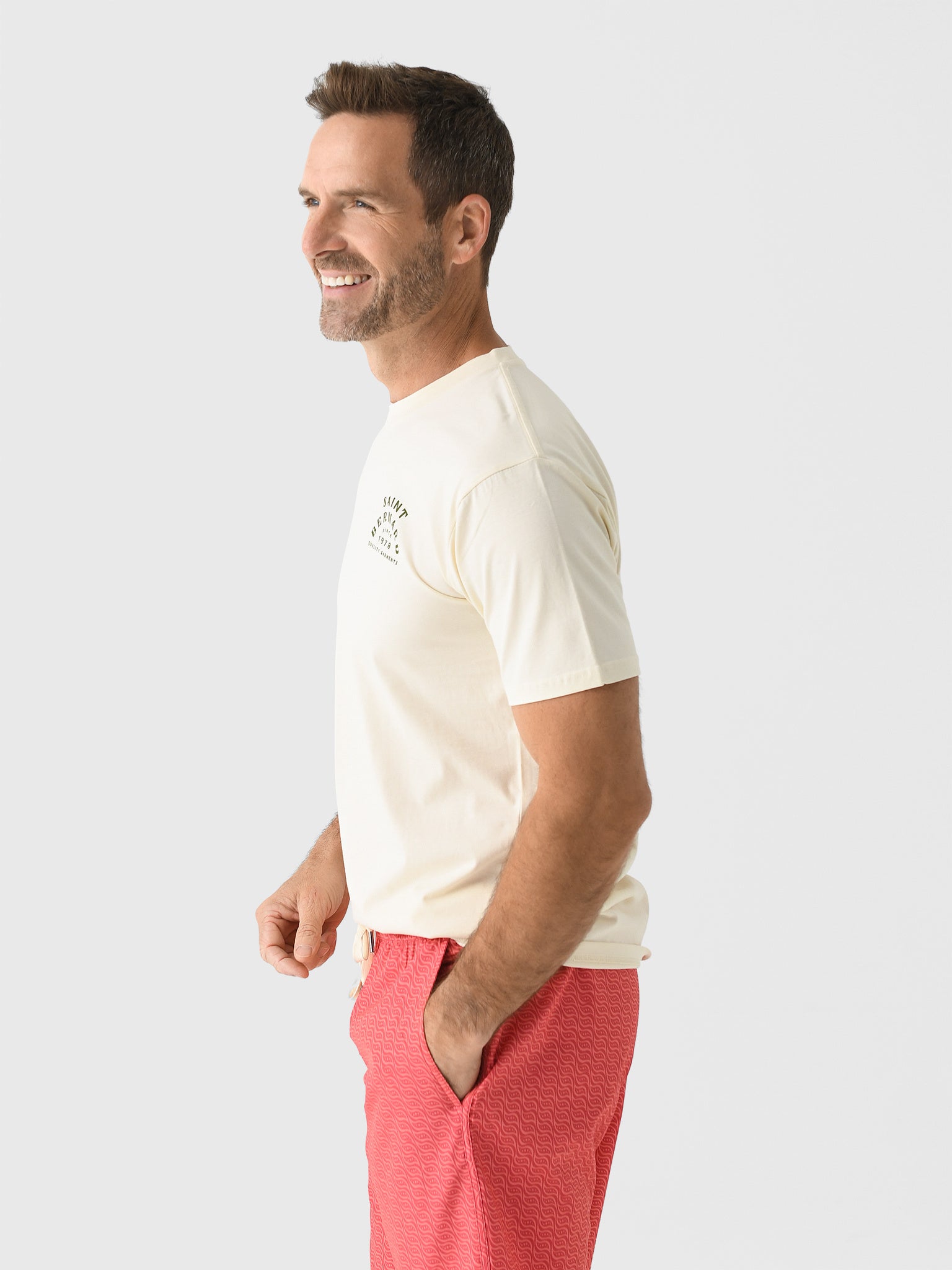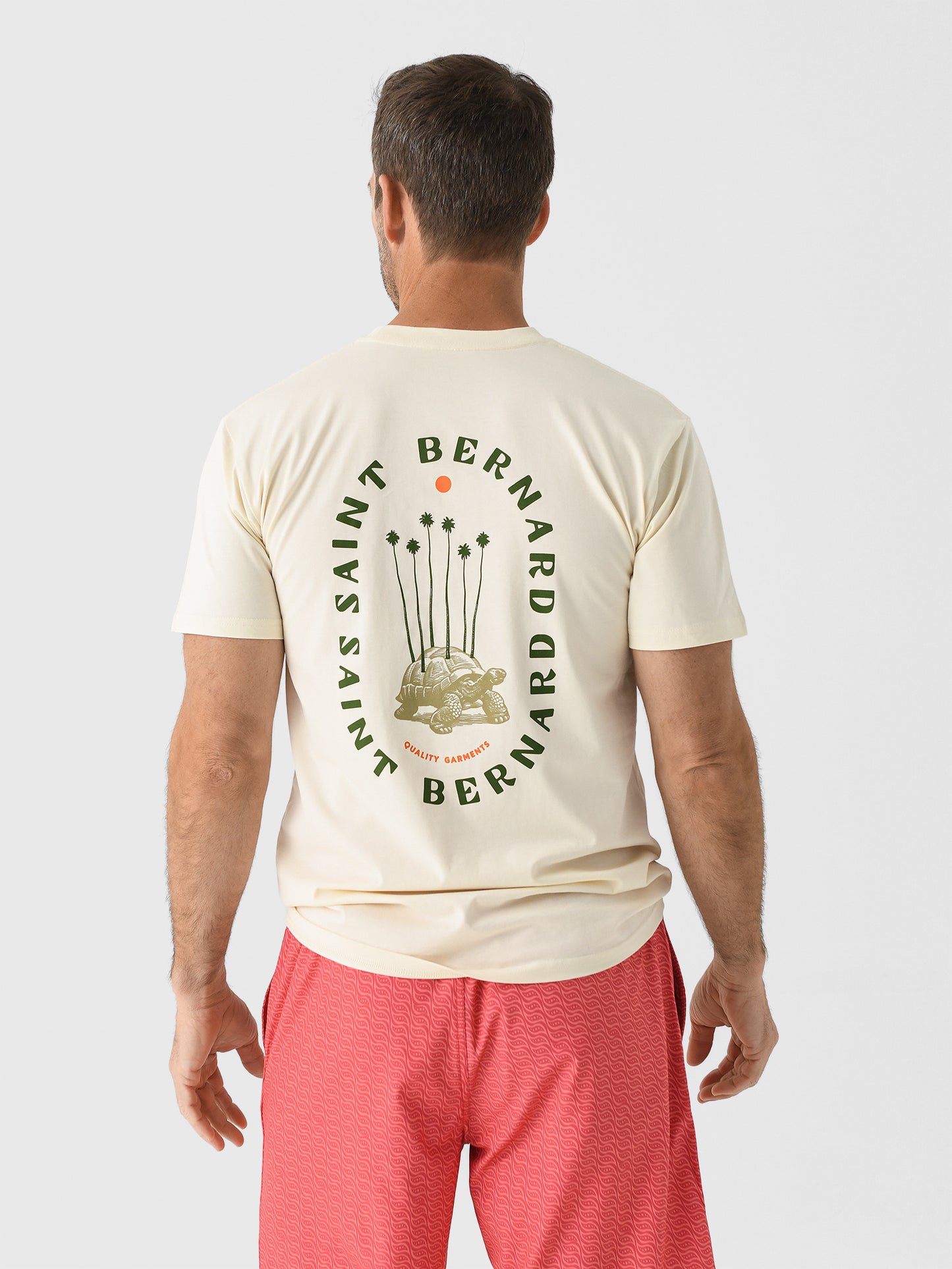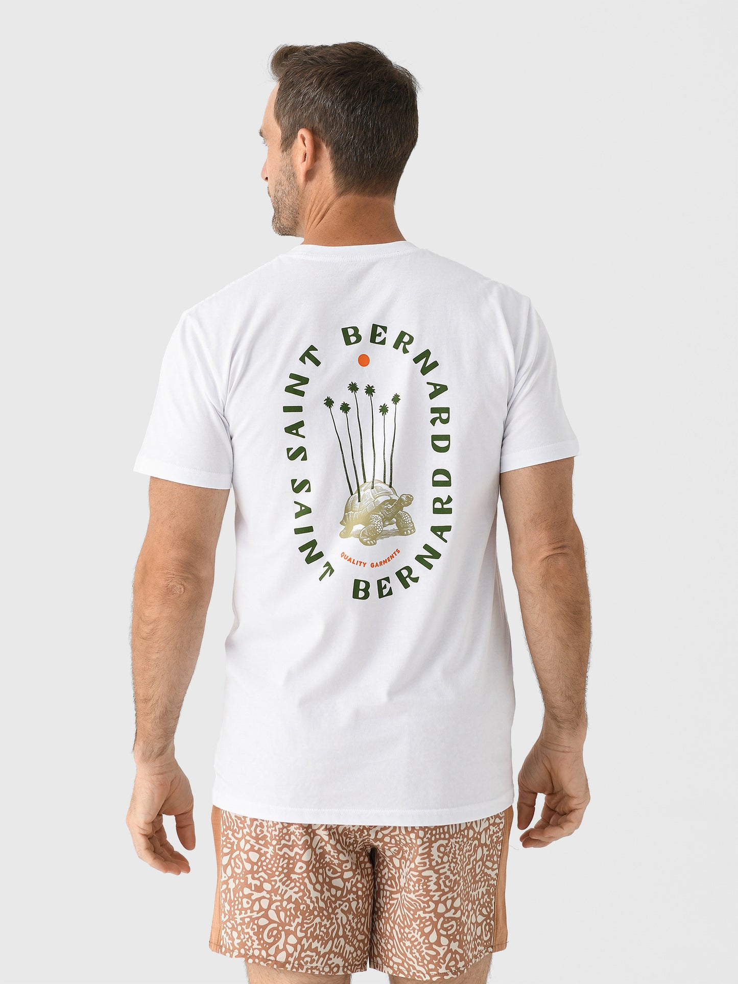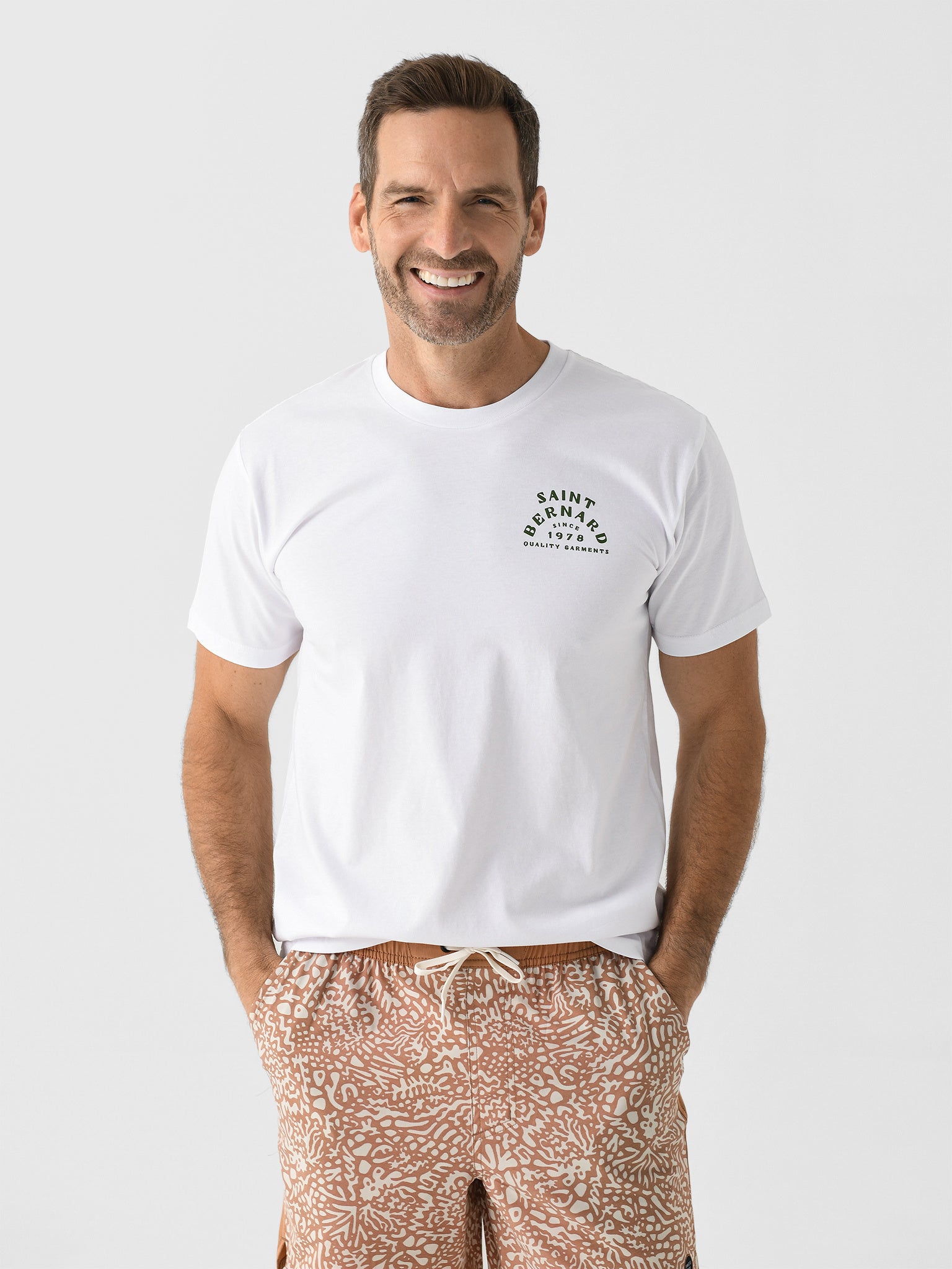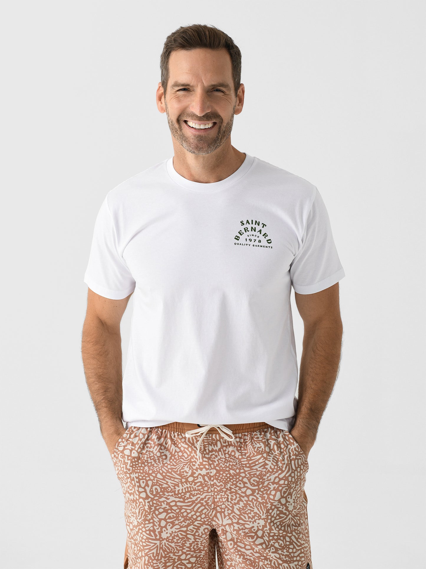 A classic crewneck tee made from soft cotton fabric featuring custom Saint Bernard graphics.