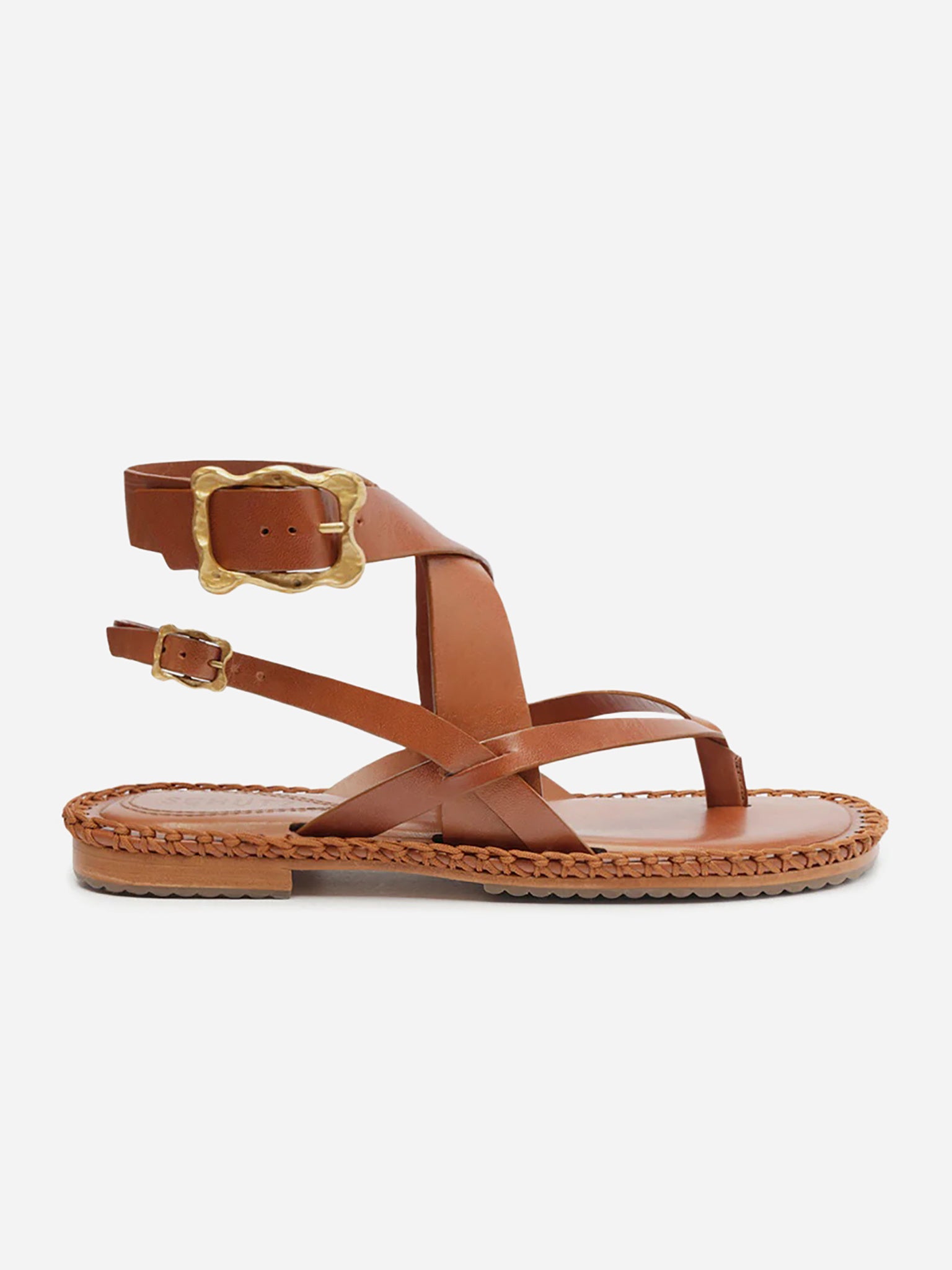 A gladiator-inspired leather sandal with an adjustable ankle buckle and low stacked heel.
