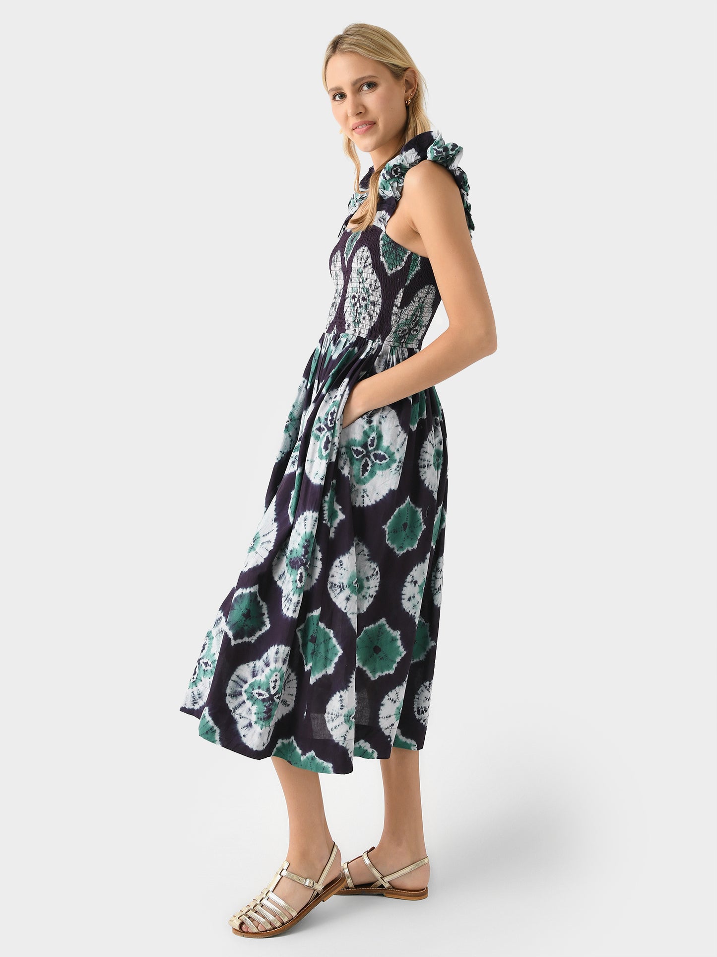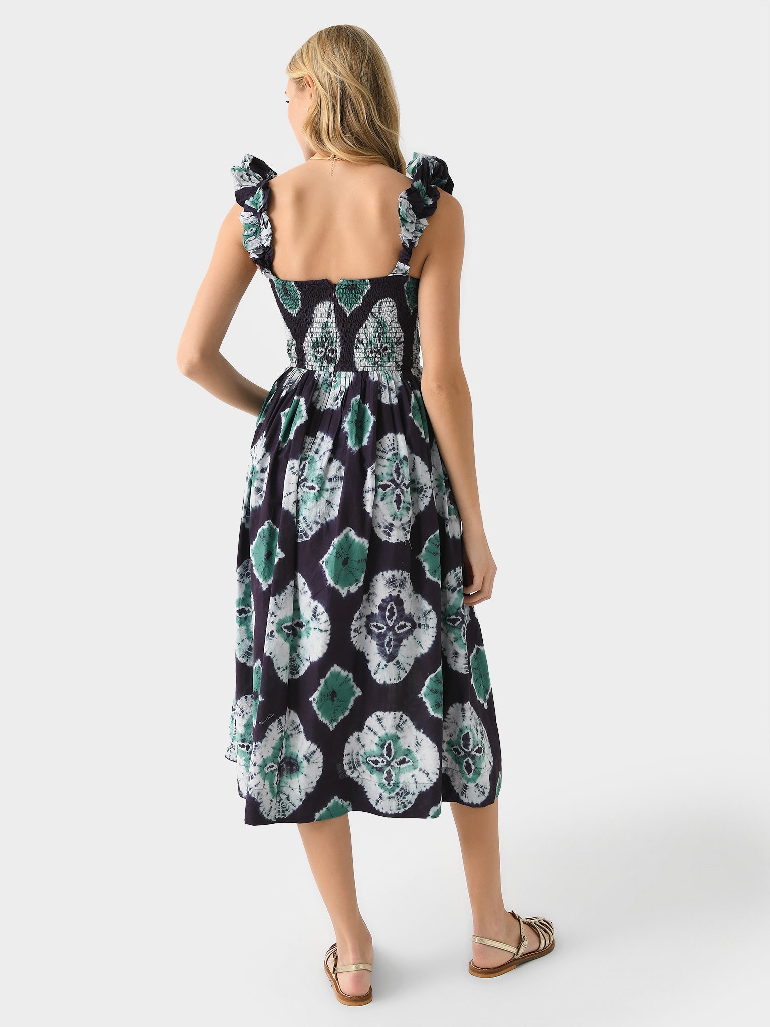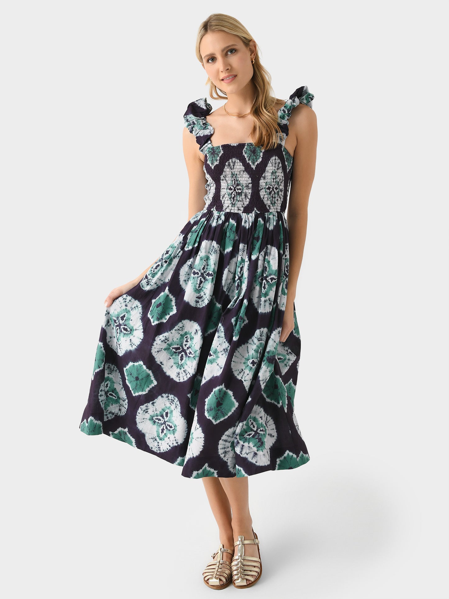 A tie-dye printed cotton dress with ruched straps and a smocked bodice.