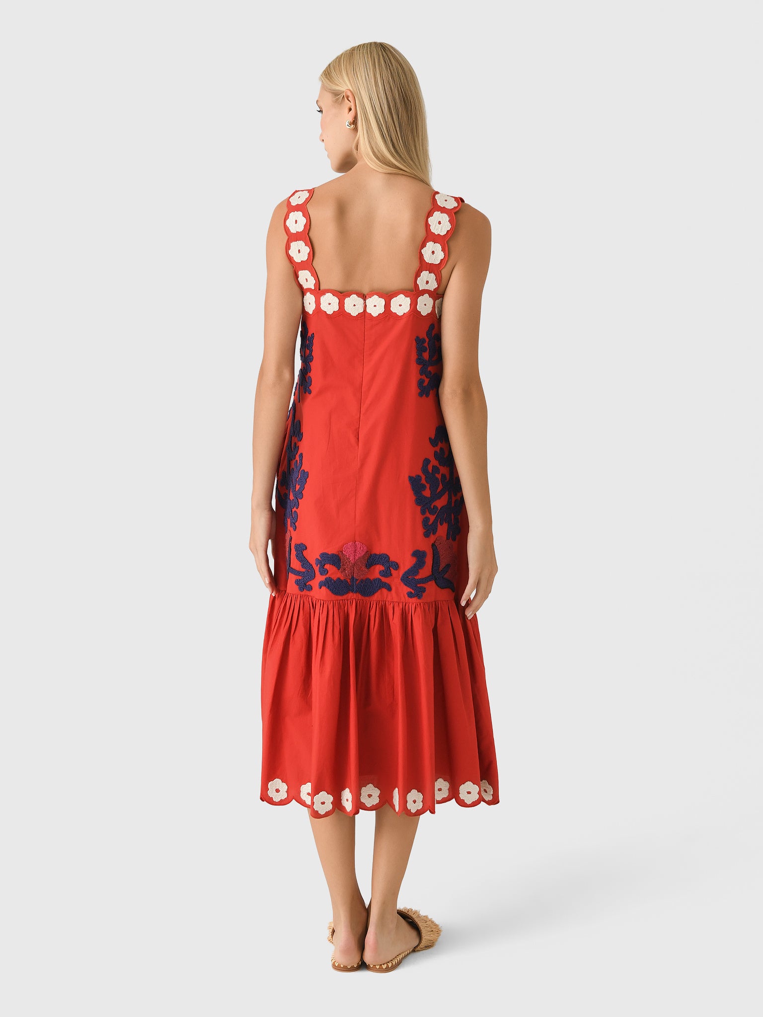 A flattering midi dress made from lightweight cotton featuring delicate floral embroidery throughout.