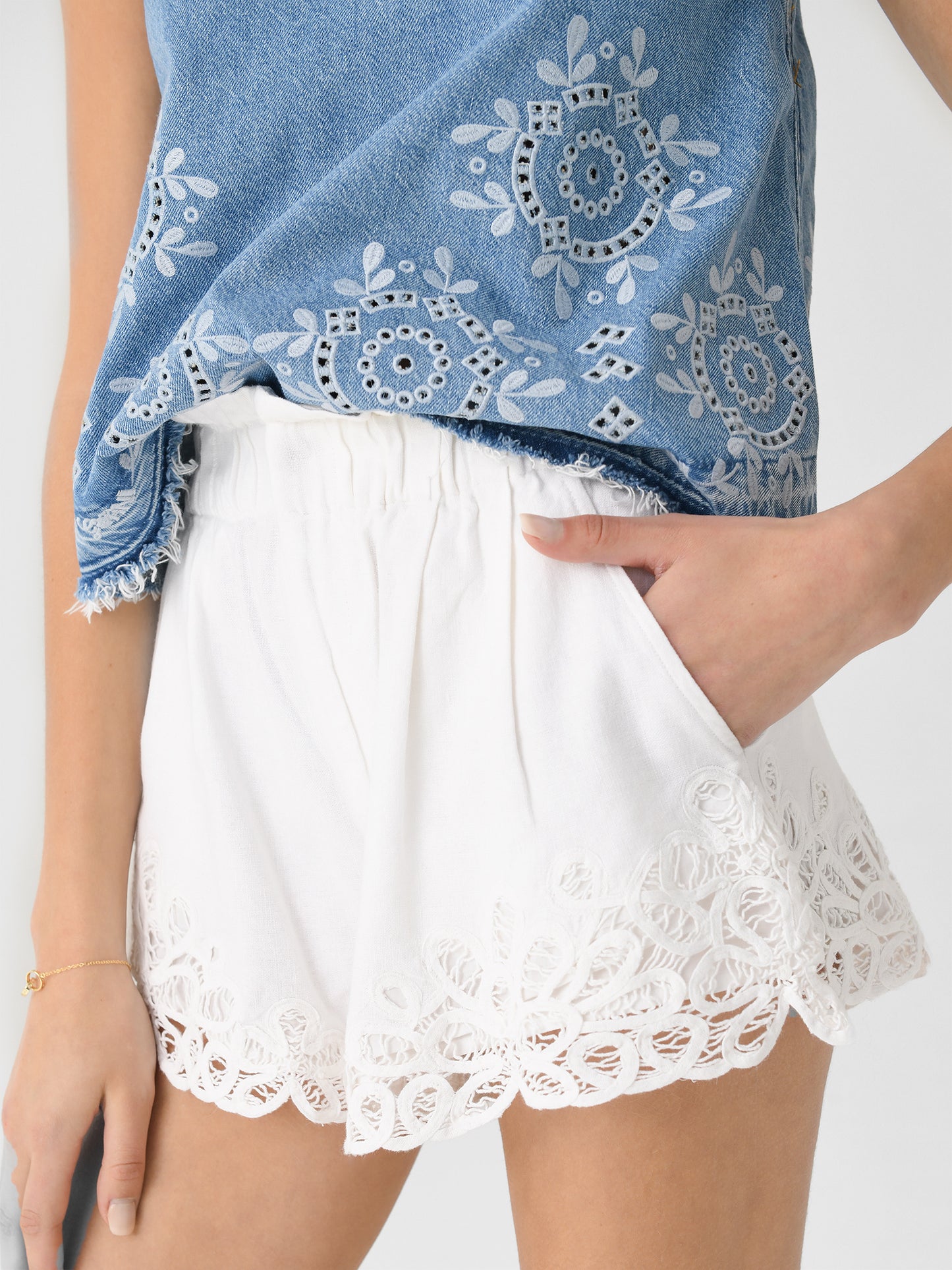 This chic short is made from lightweight cotton and linen and features intricate soutache embroidery along the hem. It is designed to be worn as a swim cover-up.
