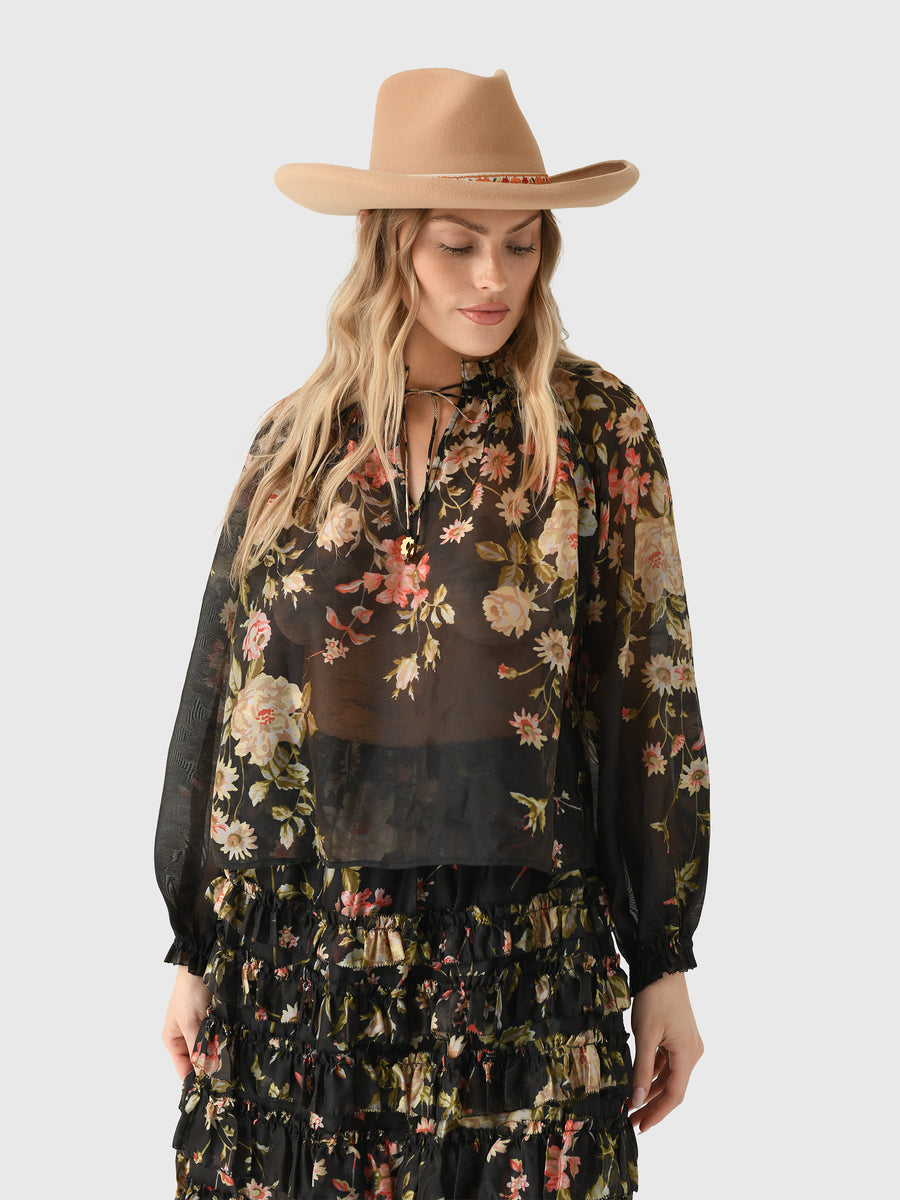 The Jolie floral print top strikes a beautiful balance between soft structure and subtle romance. It features an all-over floral motif and is elegantly finished with voluminous puff sleeves and refined tassel ties adorned with charming accents.