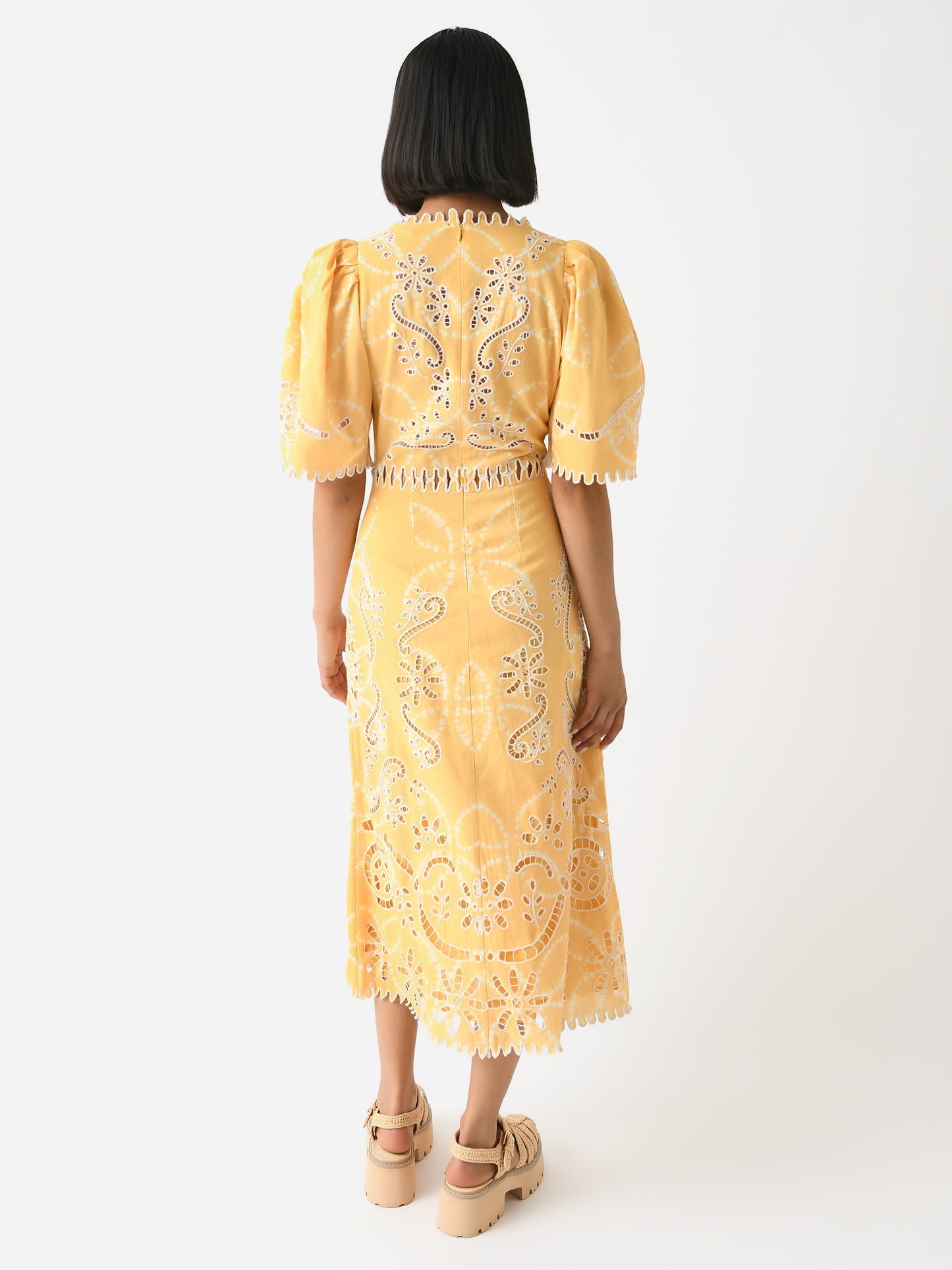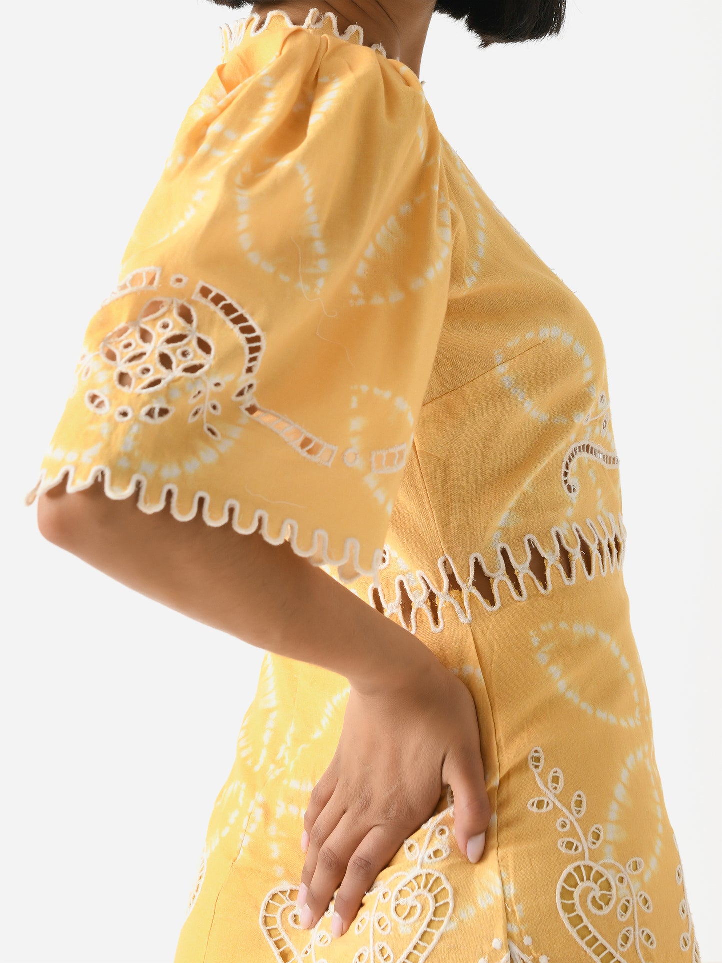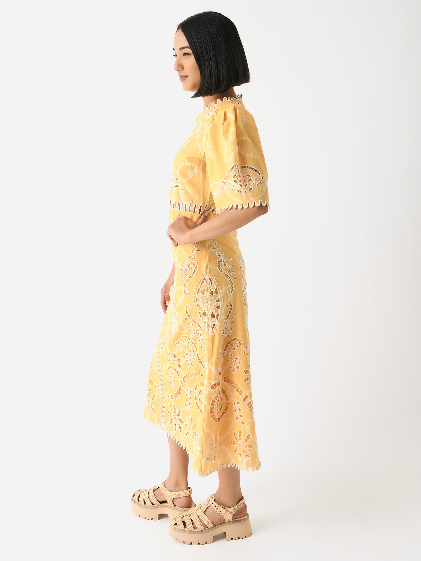 Slim-fitting cotton dress featuring delicate floral eyelet detailing with cutout accents and scalloped trims.