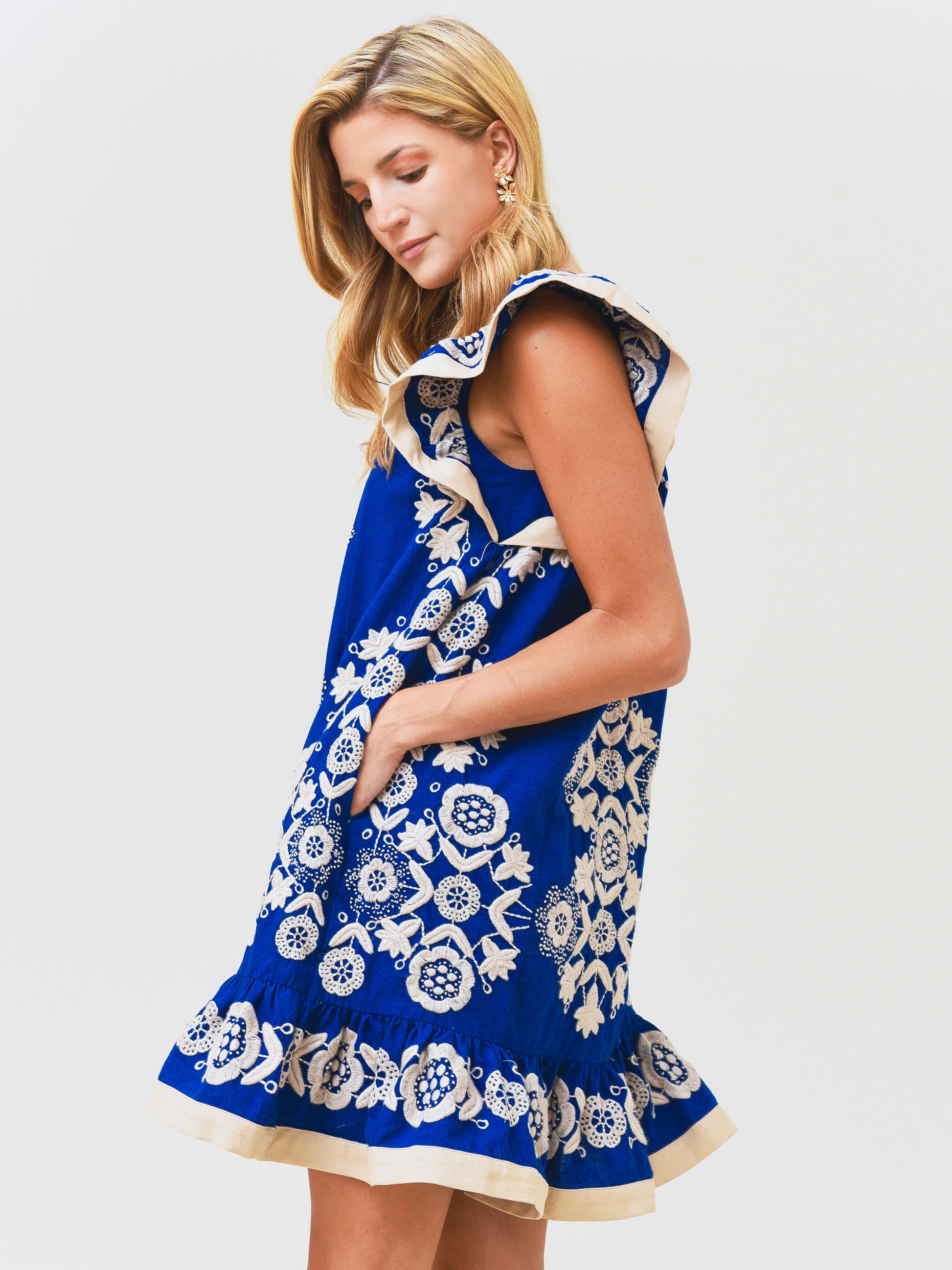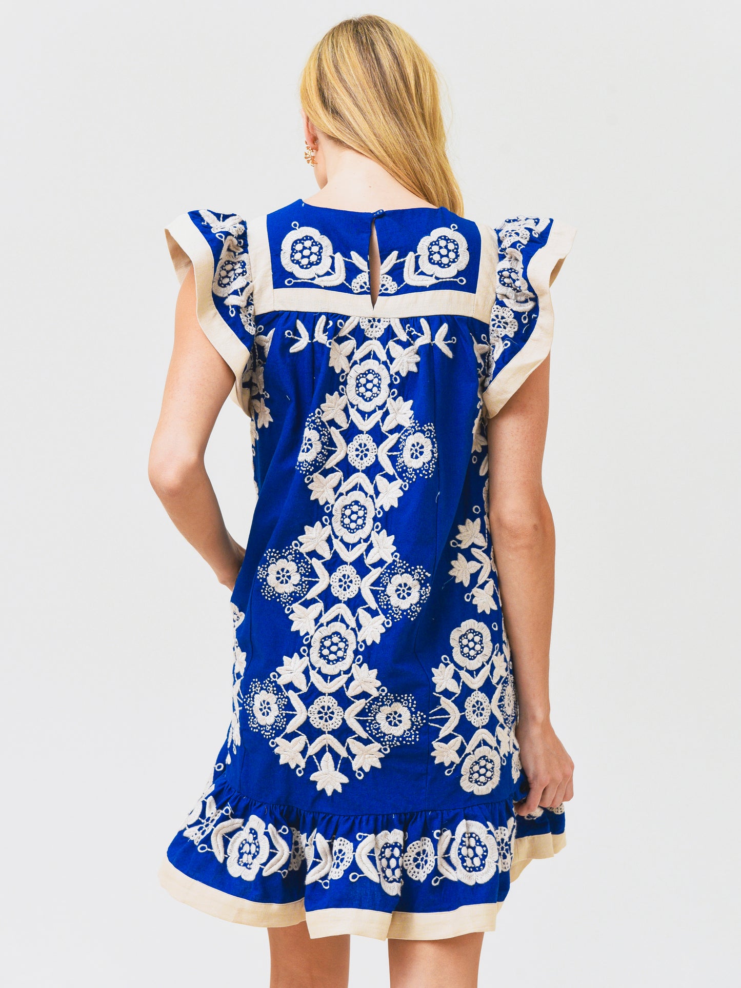 Embroidered mini dress with short flutter sleeves and a tiered hem.
