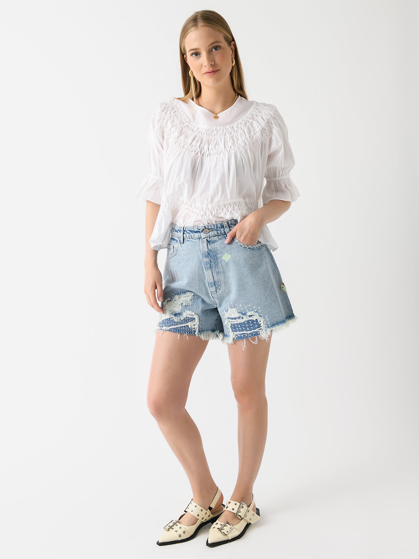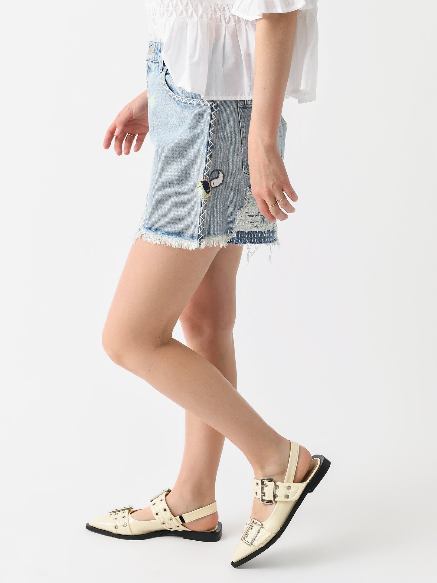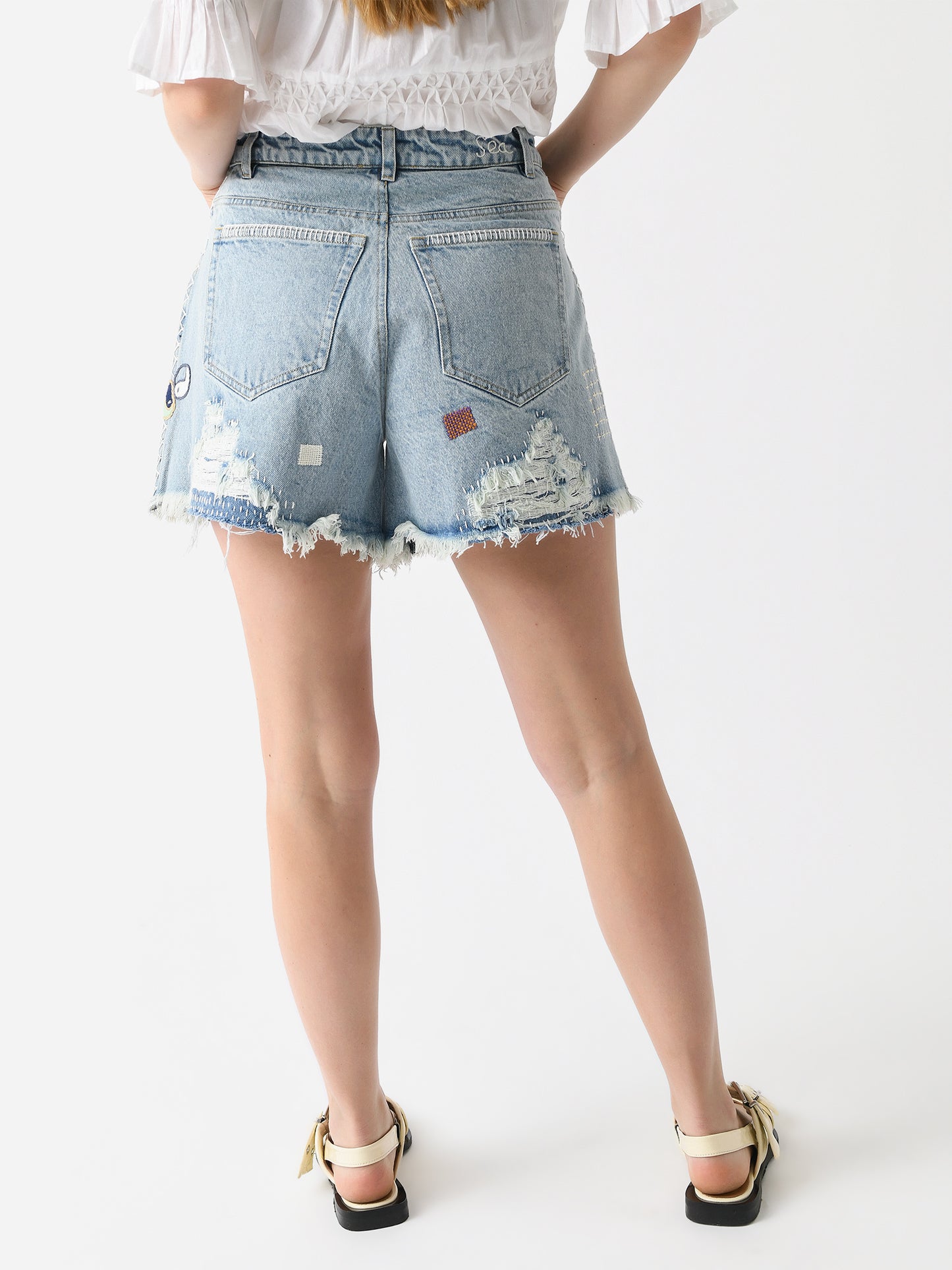 This unique denim short features an easy fit with a frayed hem and all-over embroidered detailing.