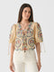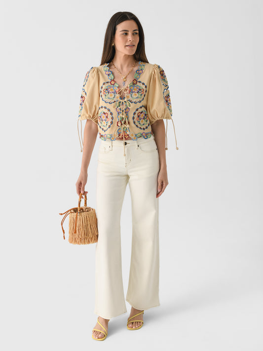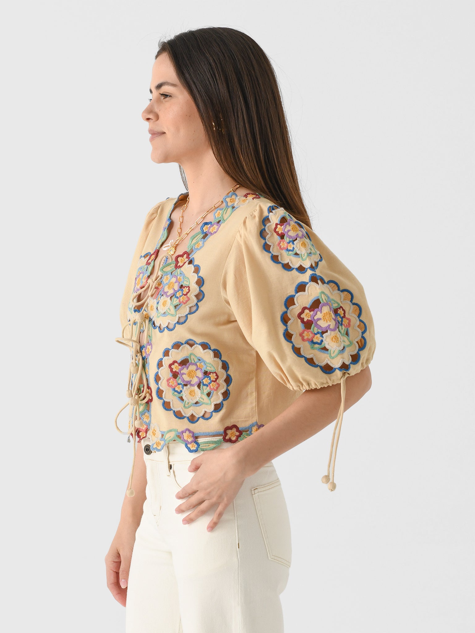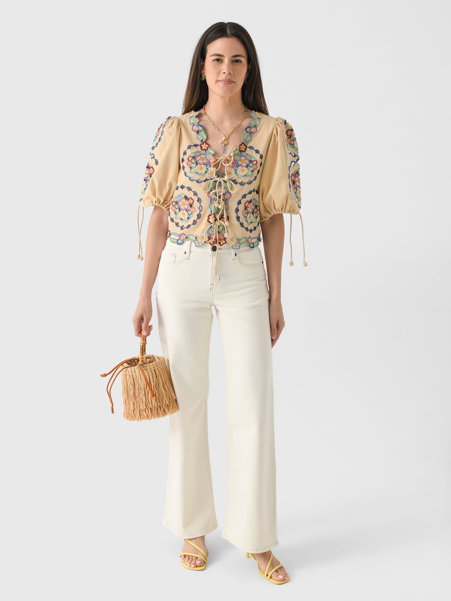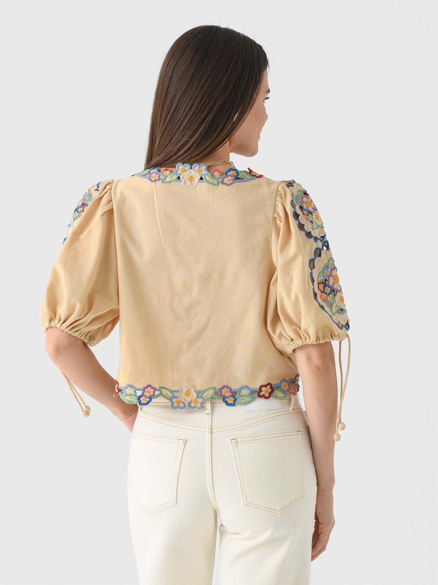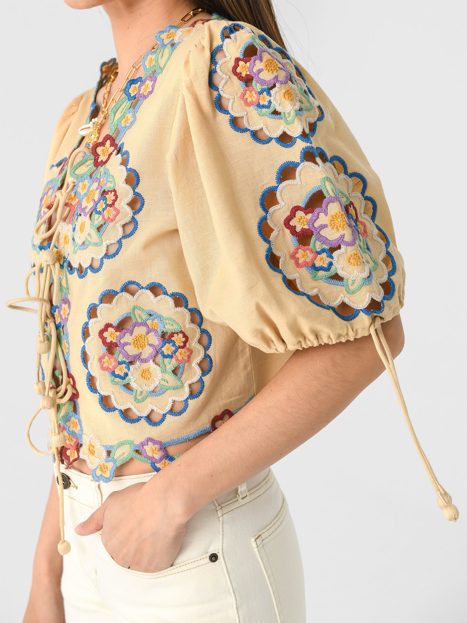 This airy blouse features a colorful embroidered design, puff sleeves, and an open front with self-ties.