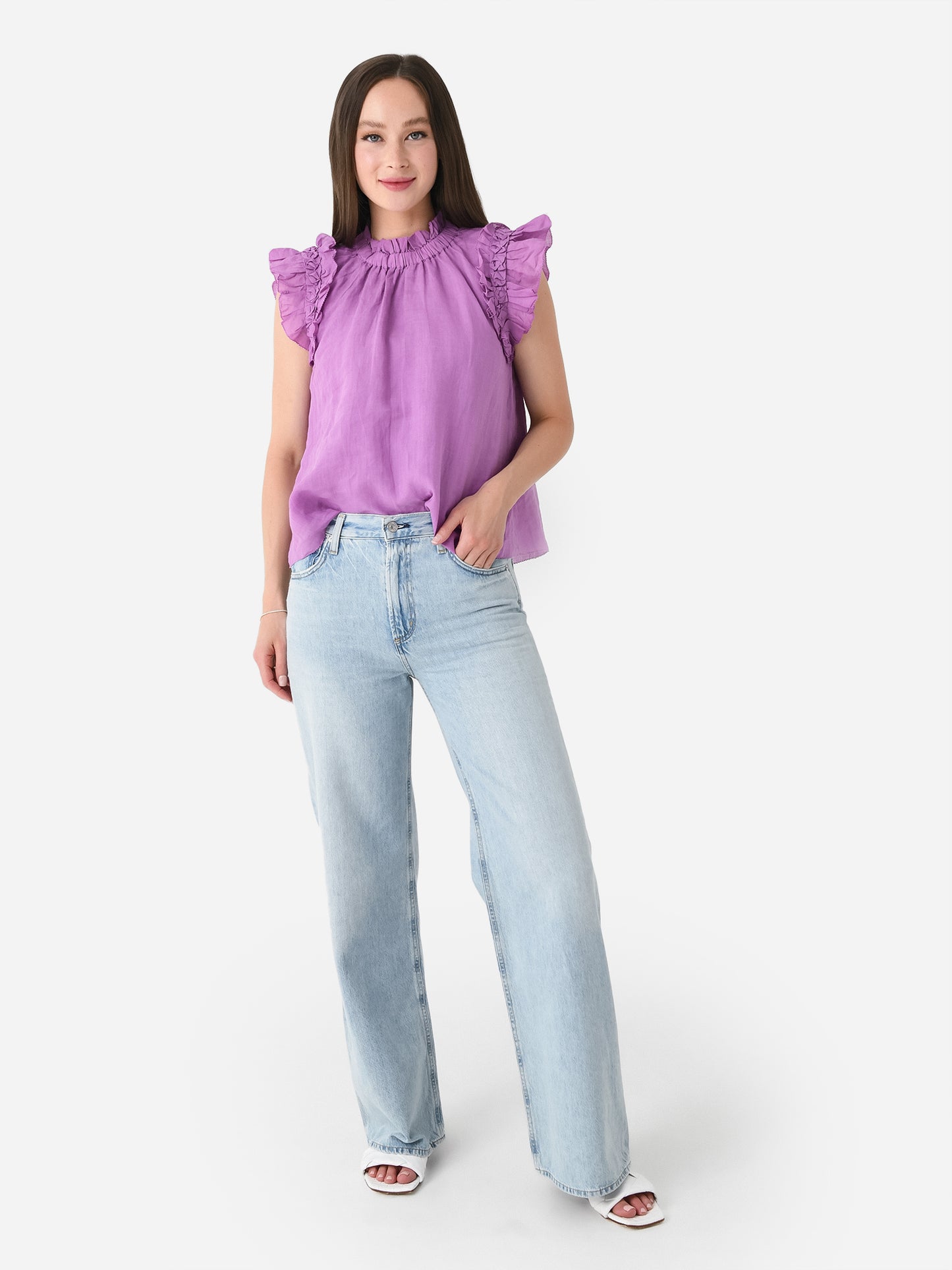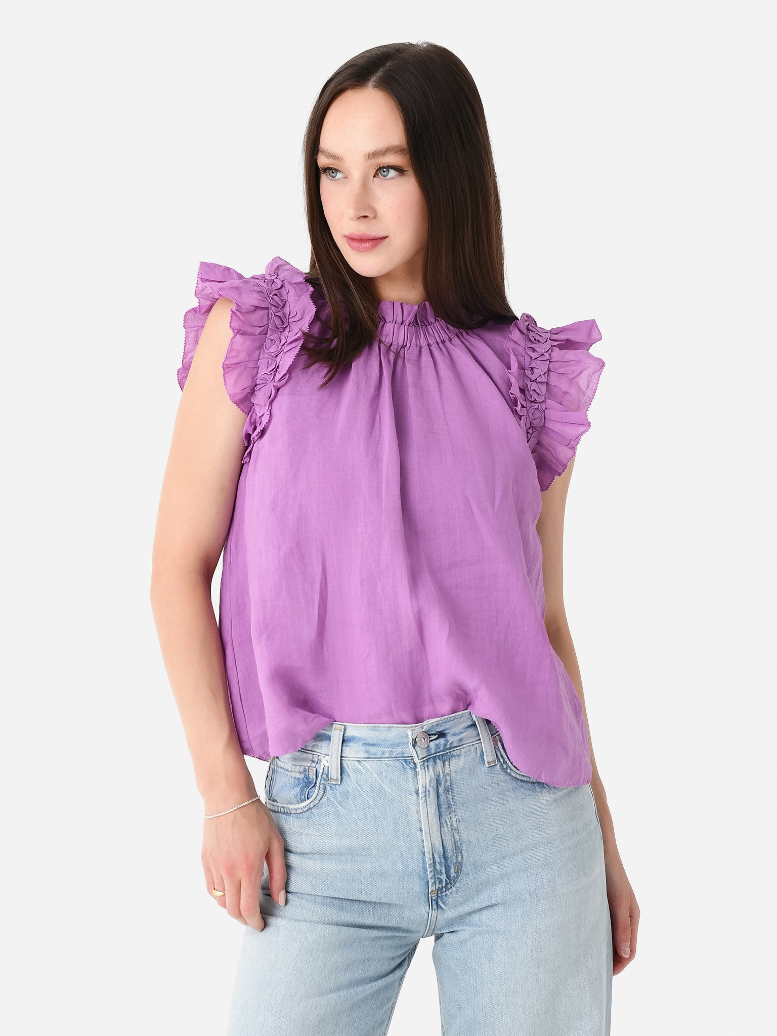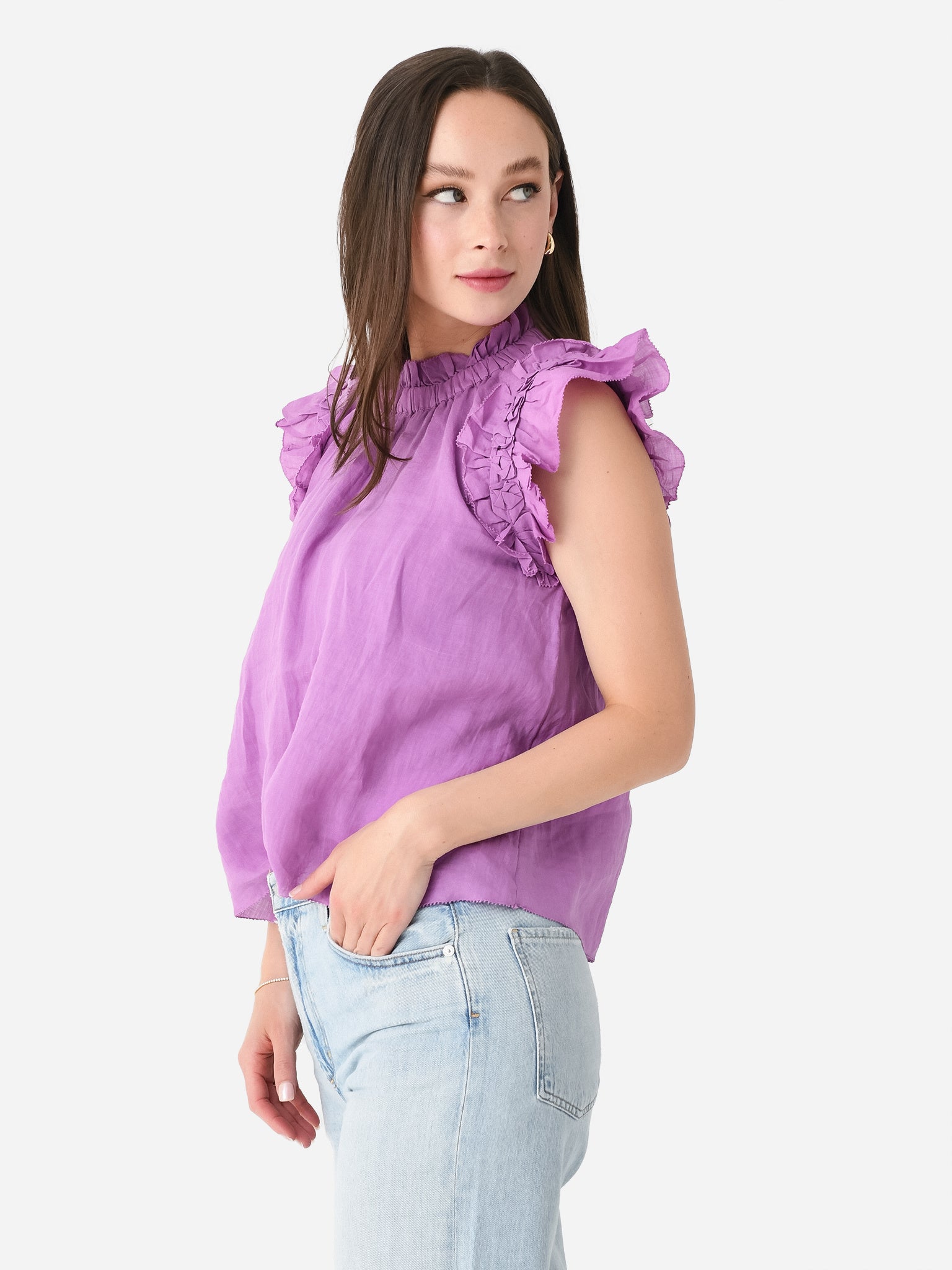 Lightweight top with a high ruffle neckline and short ruffle sleeves.