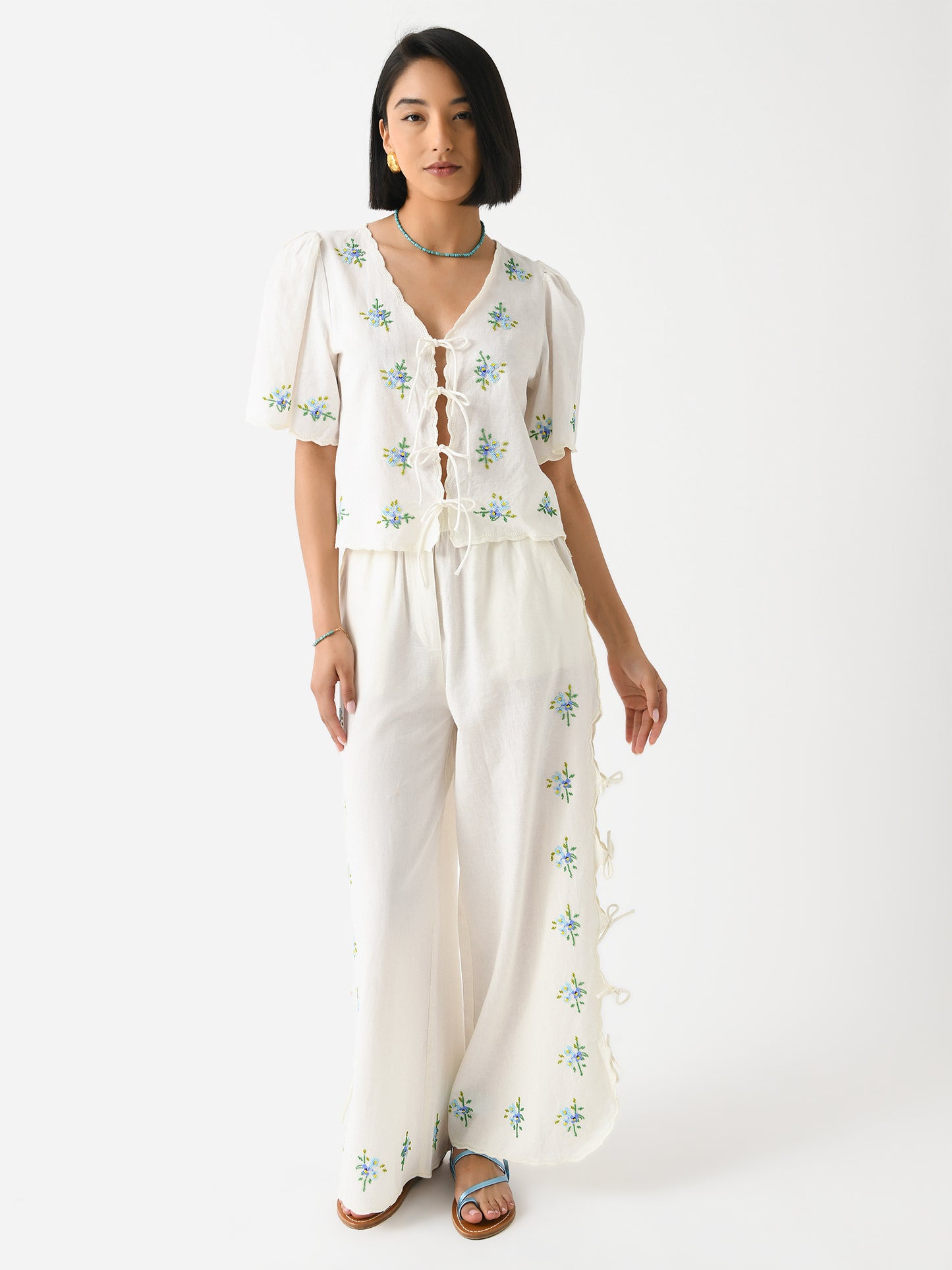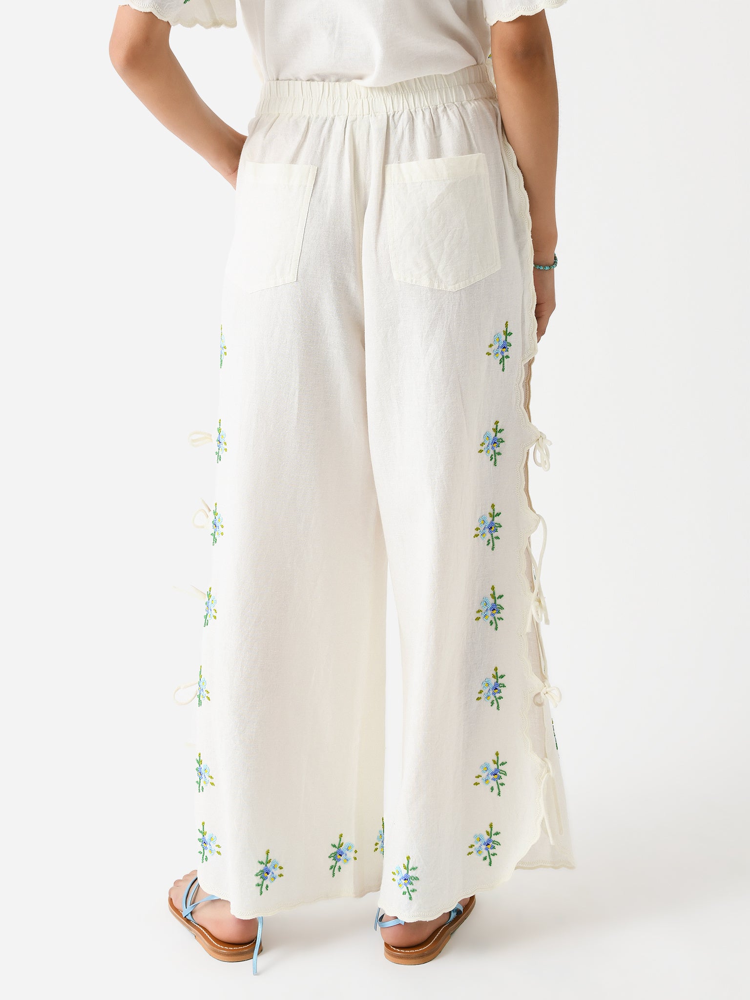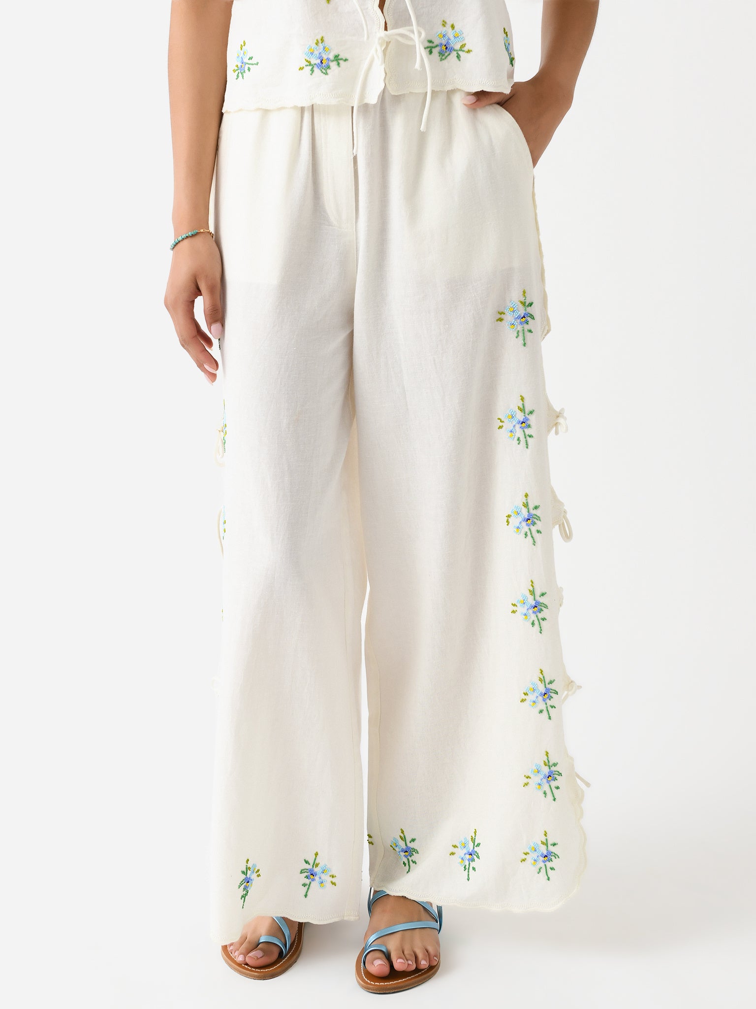 A lightweight pull-on pant with a relaxed, straight leg and intricate floral bead detailing.