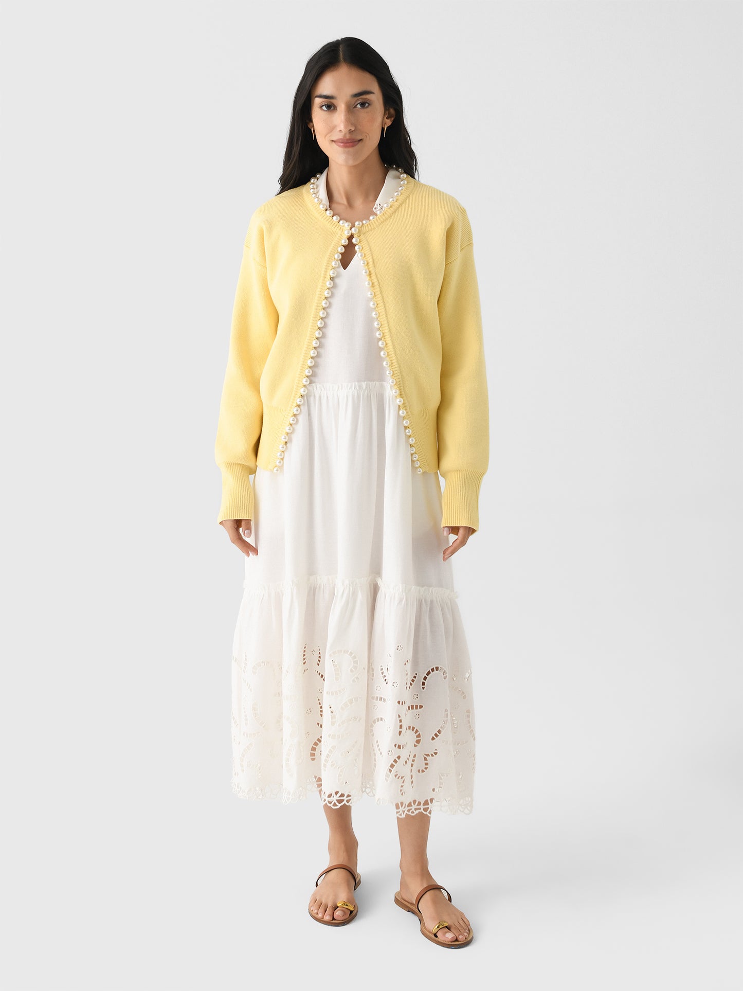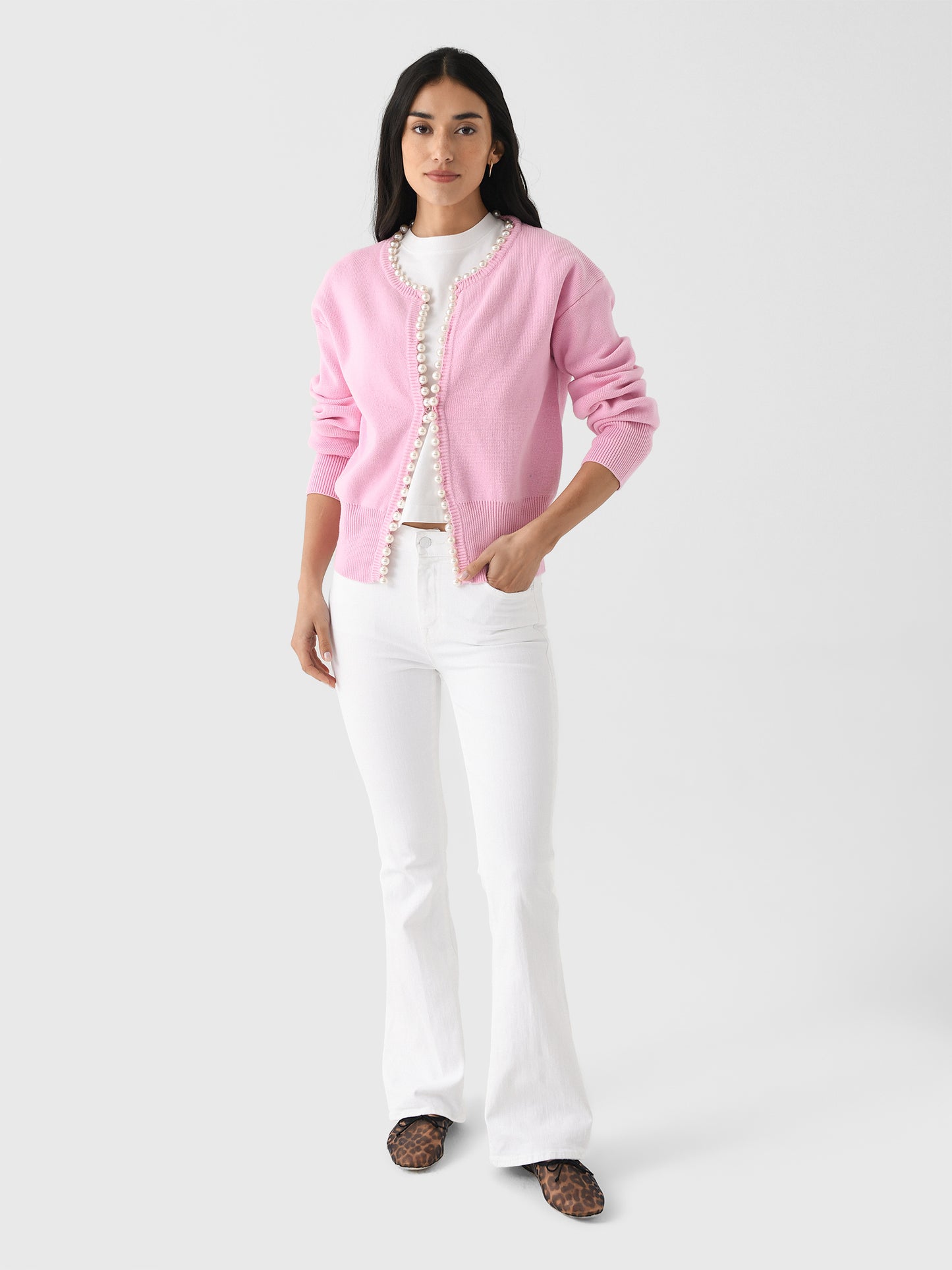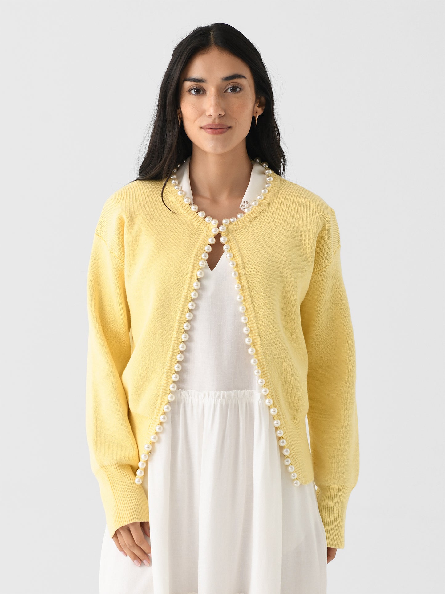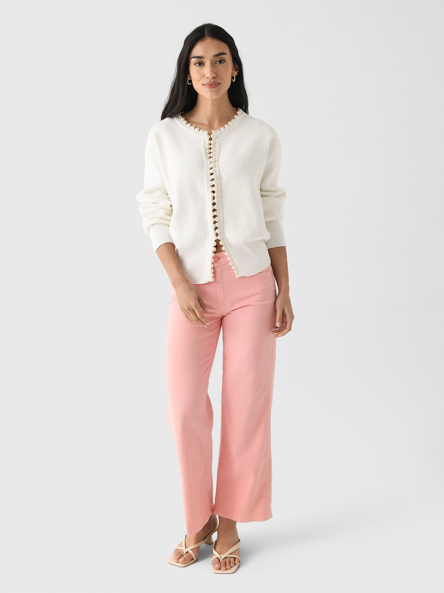 This sophisticated sweater is made from a soft organic cotton blend and features an elegant pearl trim.
