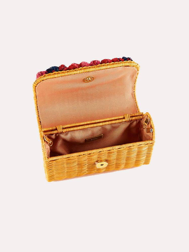 Light Honey Braided Wicker Clutch. Detail of gray and beige raffia pompom. Polyester lining. Magnetic button closing. It comes with removable handle in caramel leather and silk tassel.