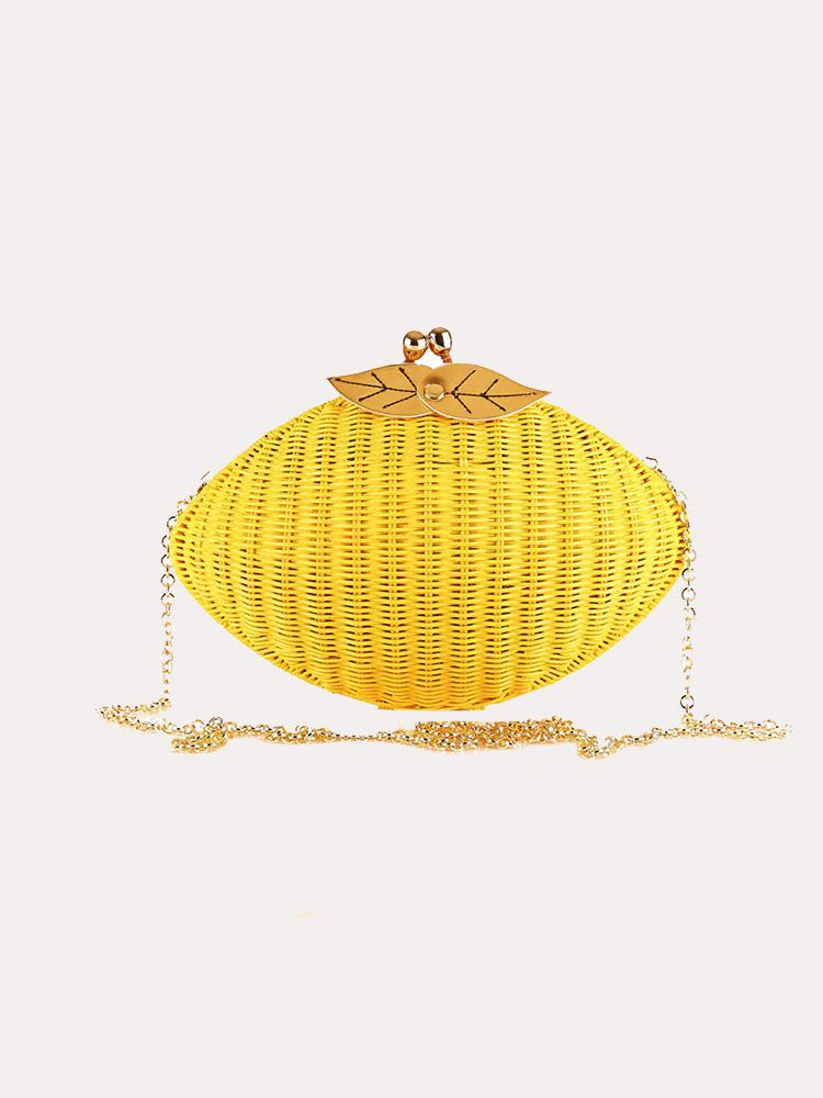 Clutch of braided wicker in Sicilian lemon format. Polyester lining and gold leaf detail at the top. Magnetic button closing. Comes with chain handle.