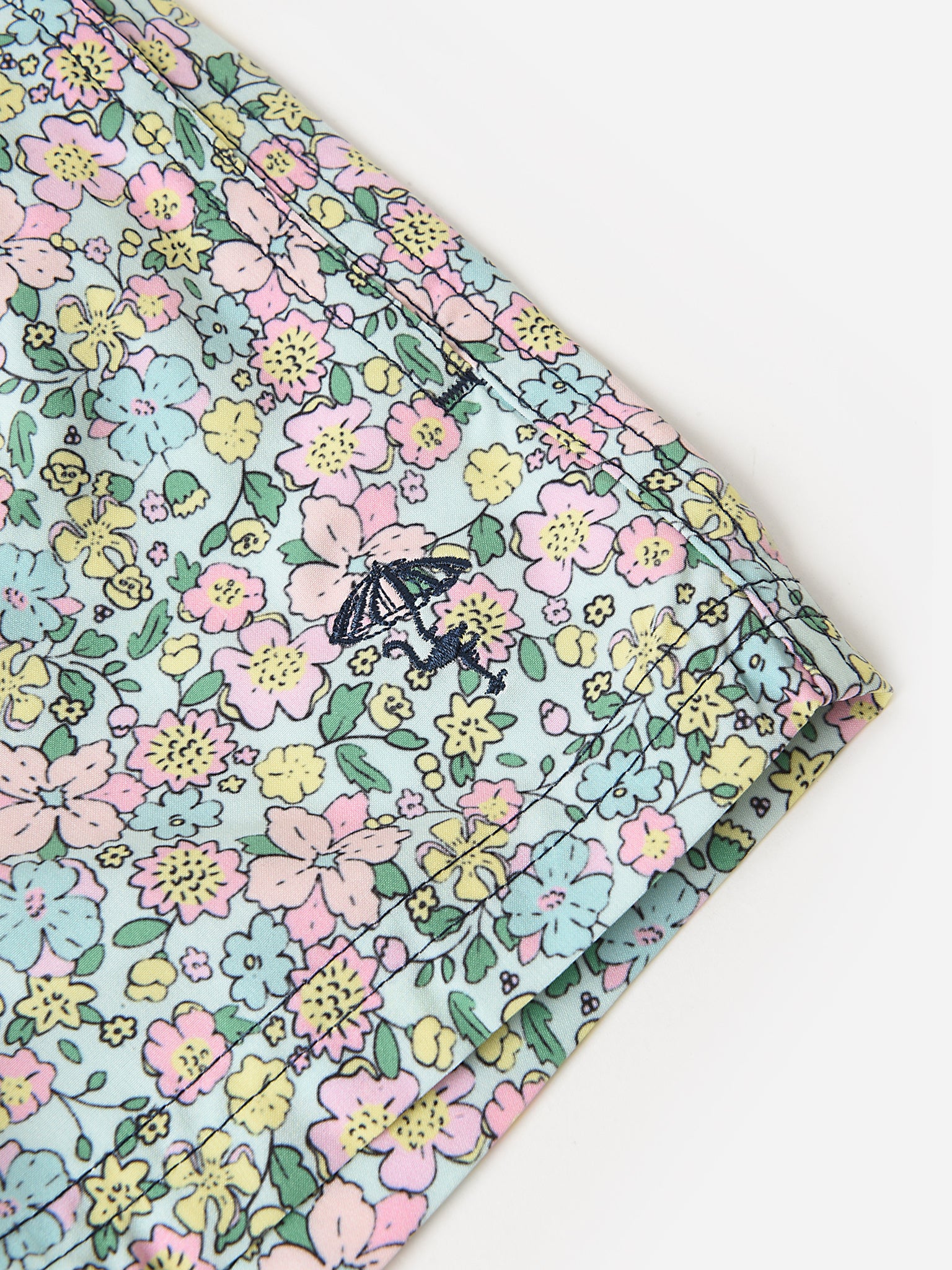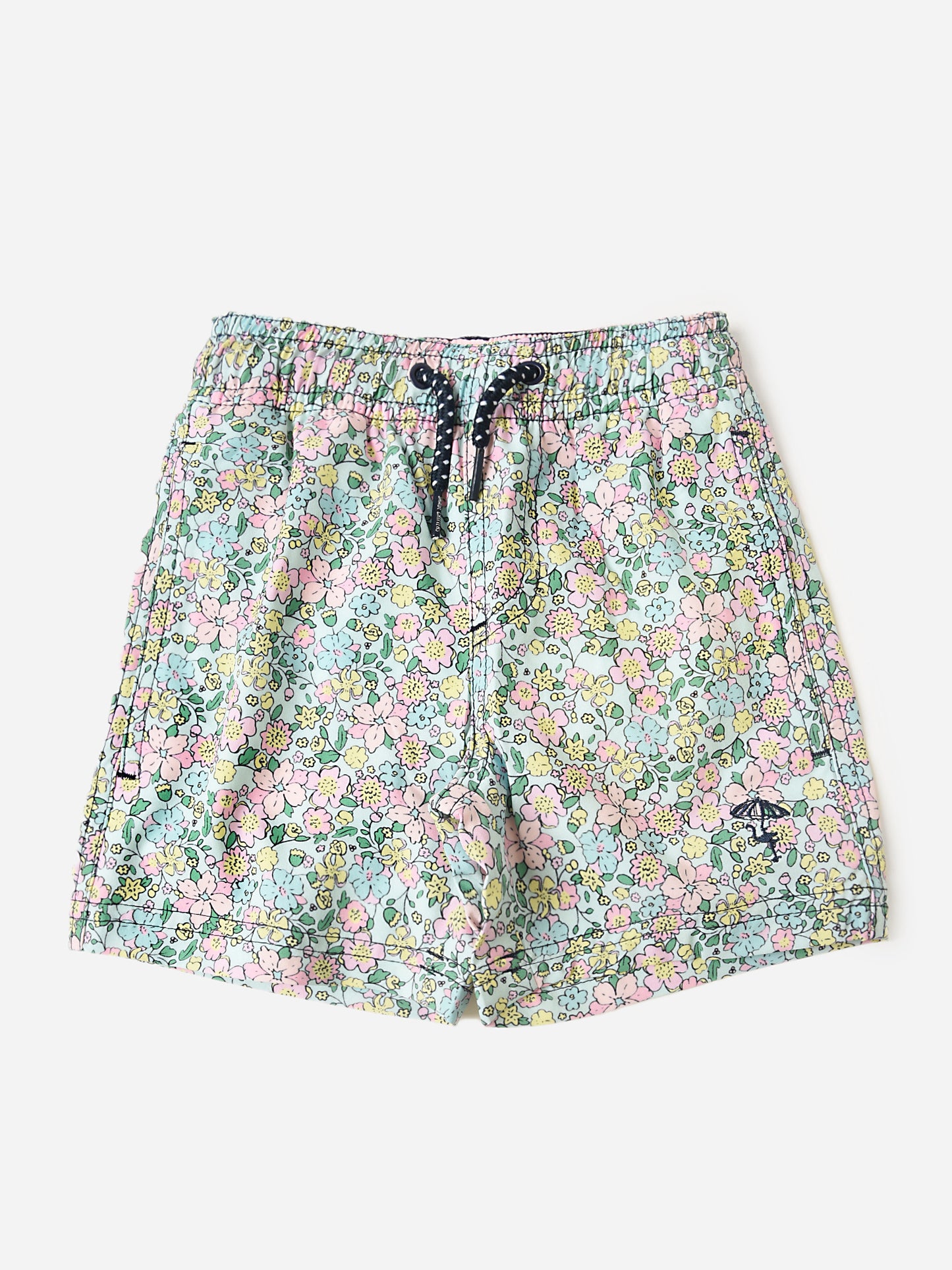 A floral-printed swim trunk with comfortable four-way stretch and sun protection technology.