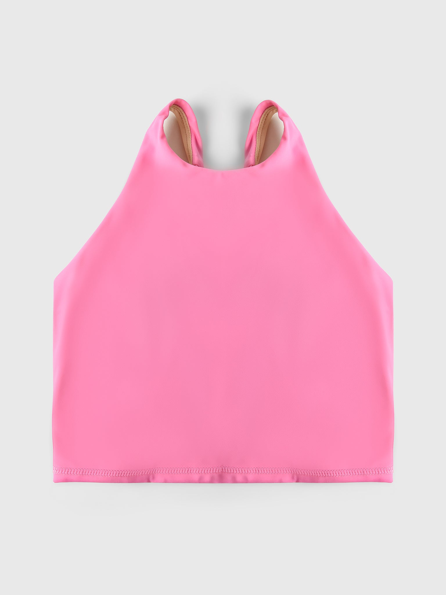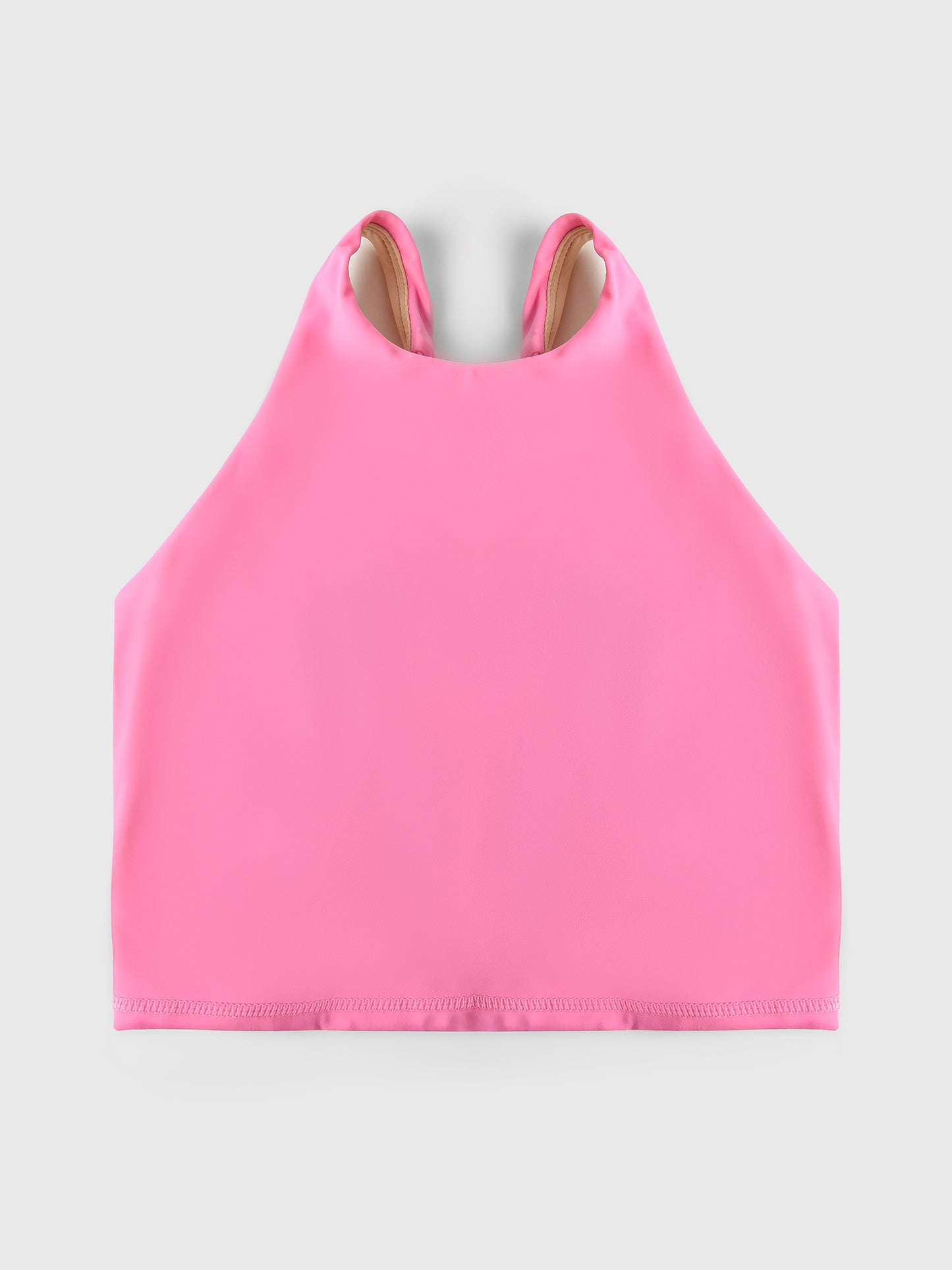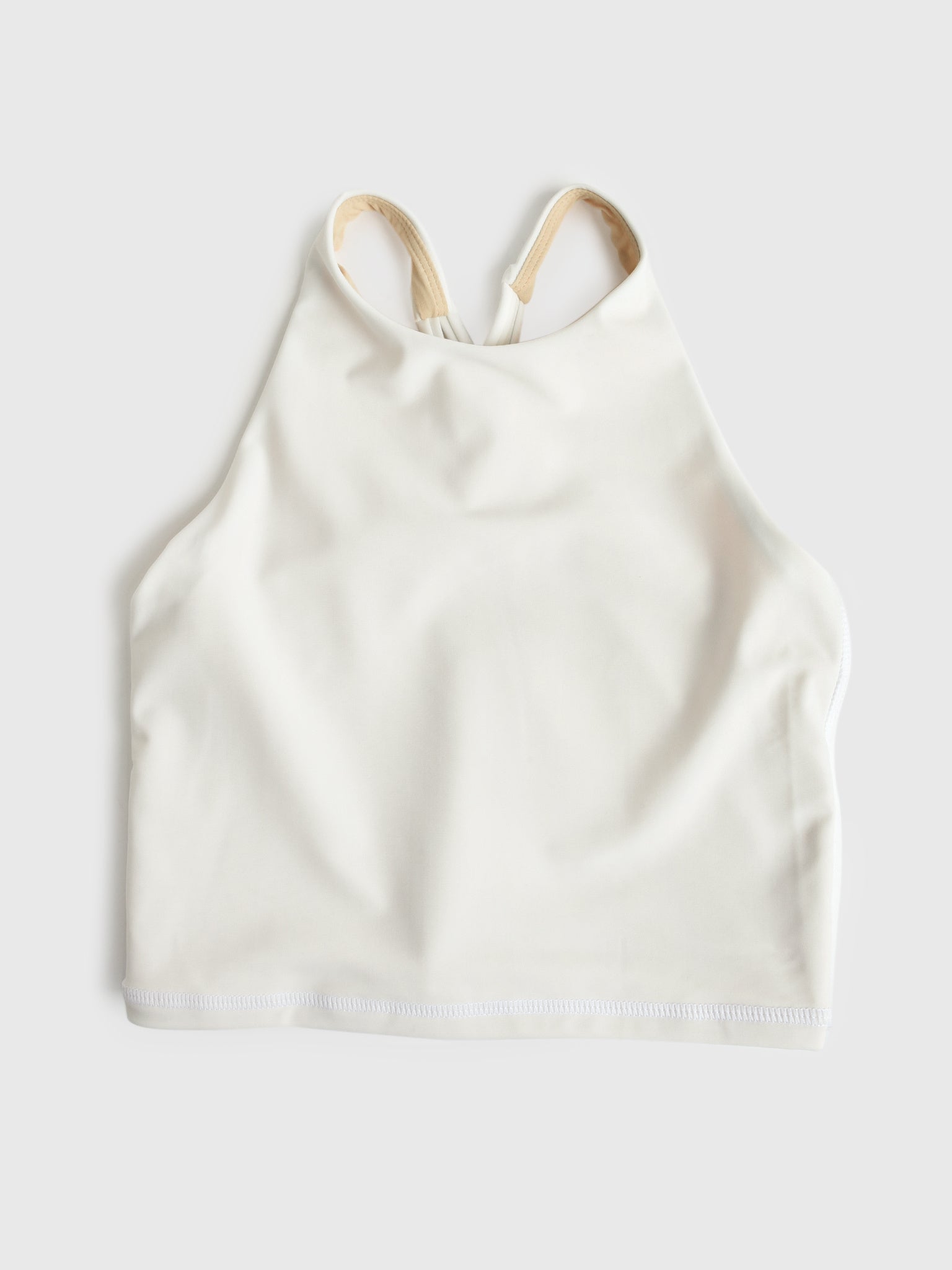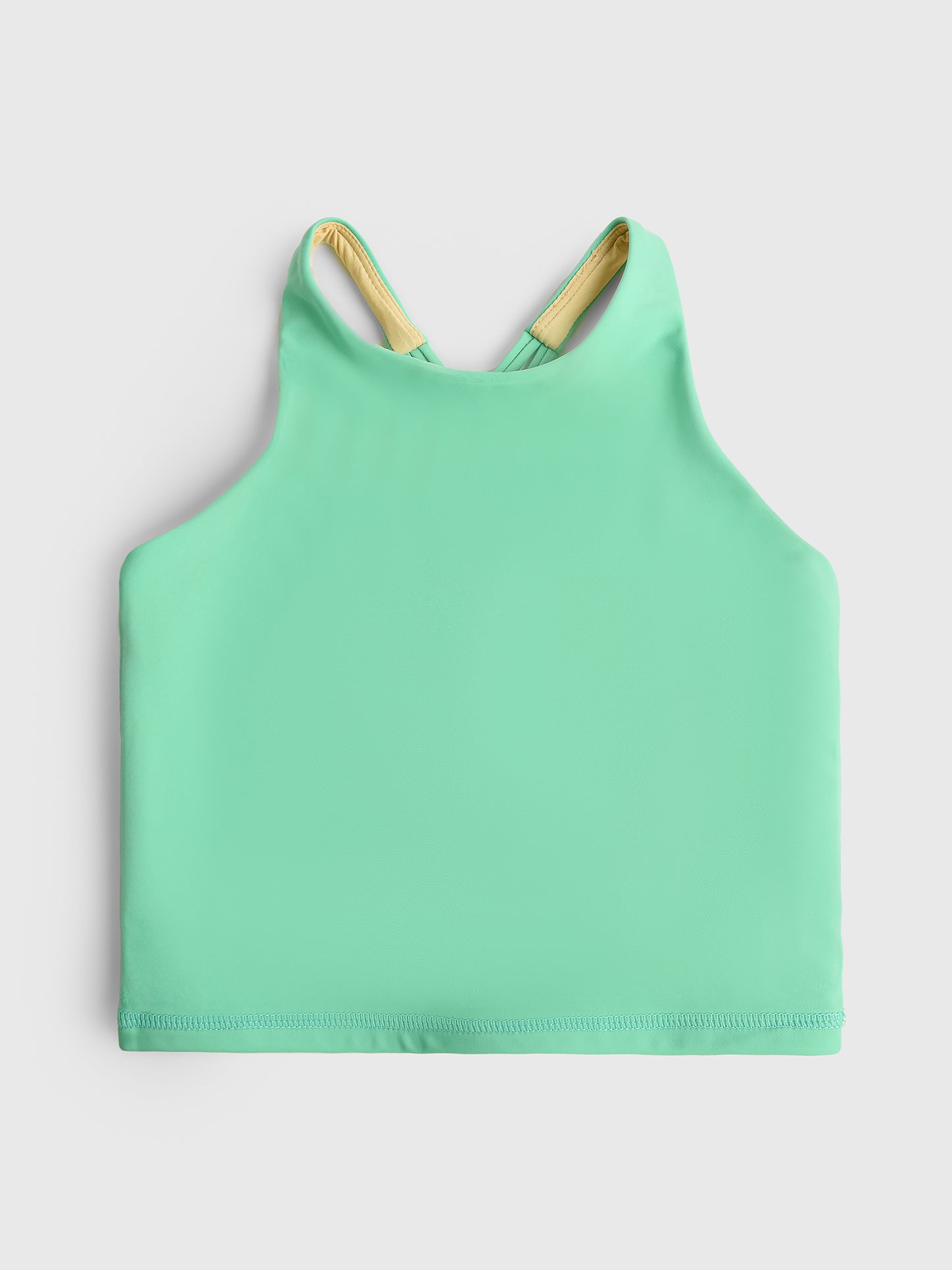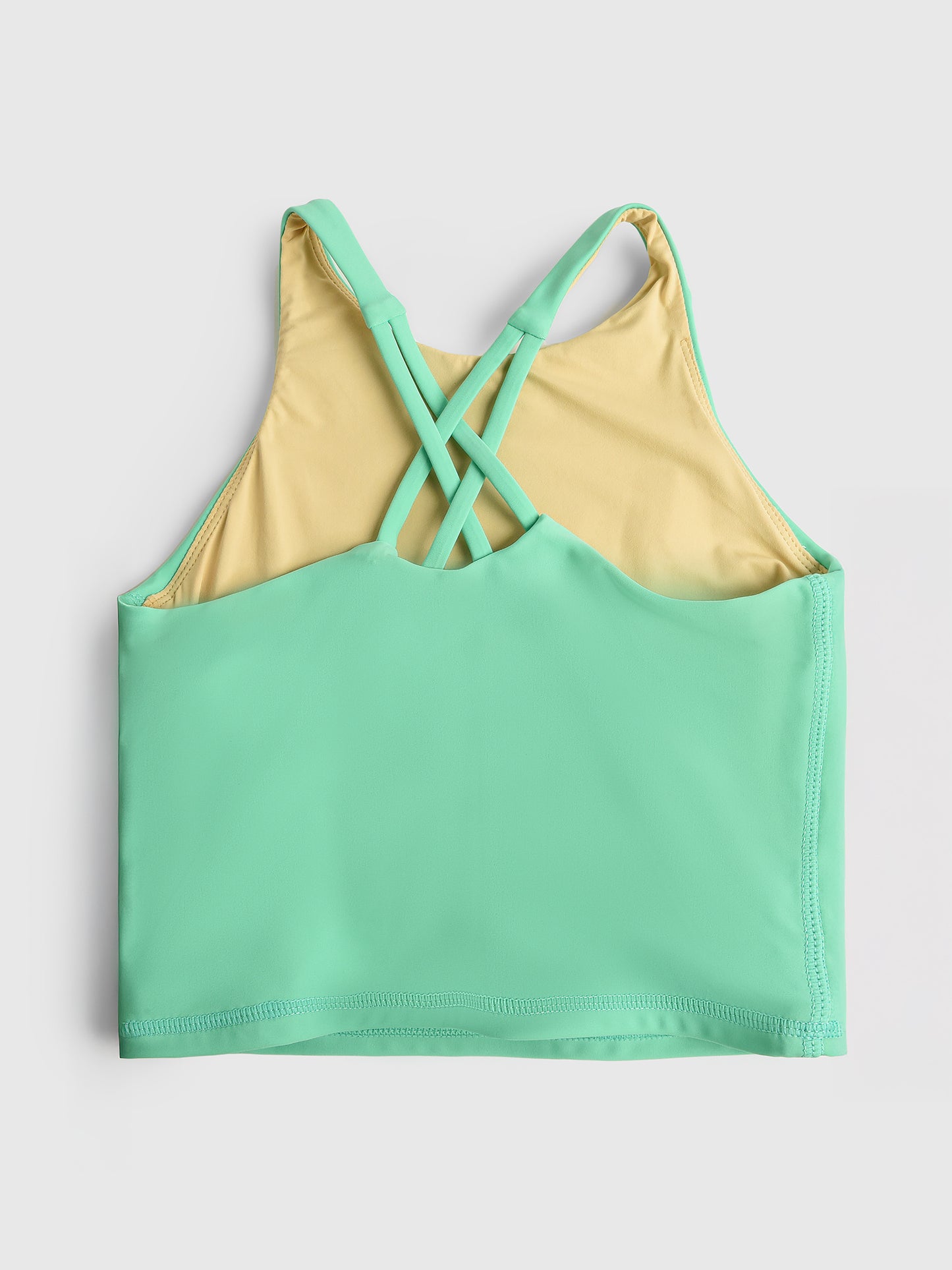 This comfortable active tank top features a full-cut design with criss-cross straps and added sun protection technology.