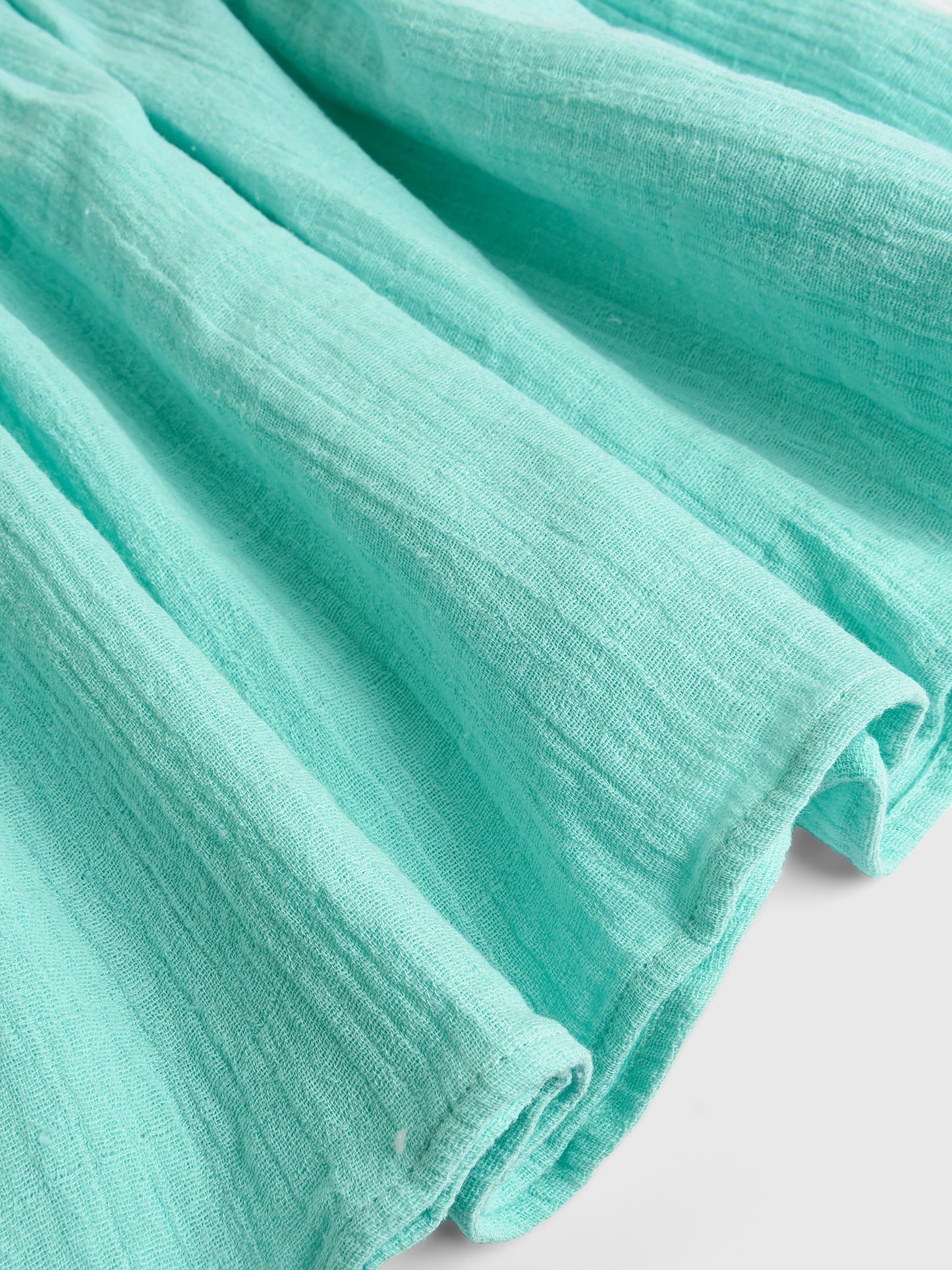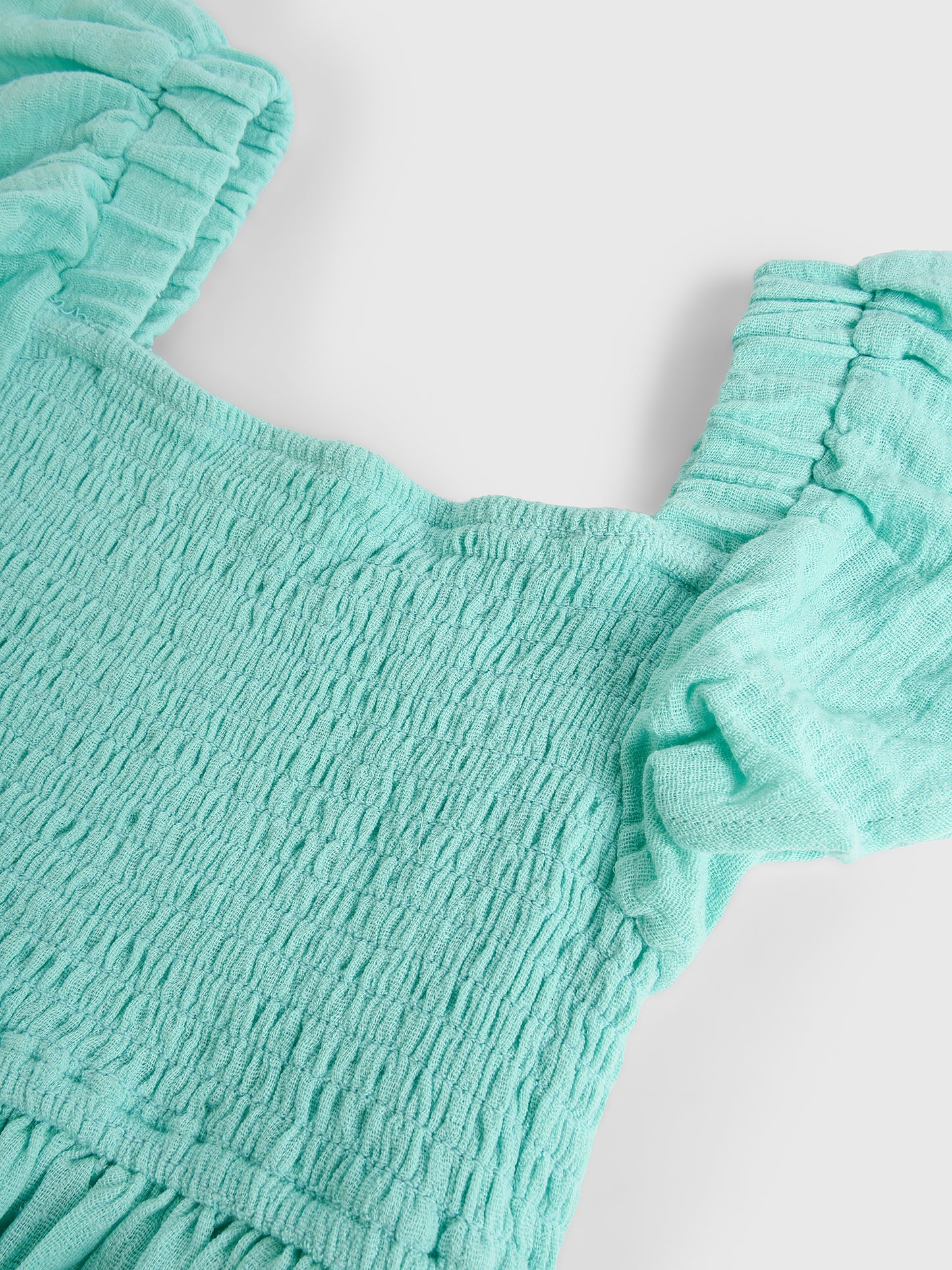 A comfortable smocked dress made from lightweight cotton gauze and finished with flutter sleeves.
