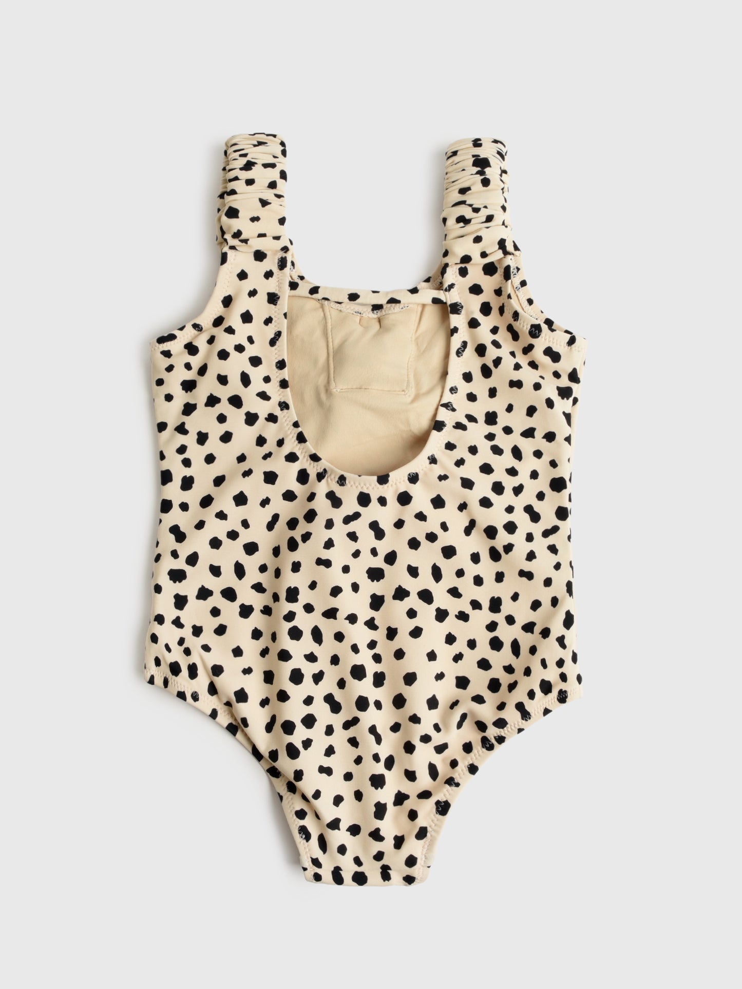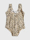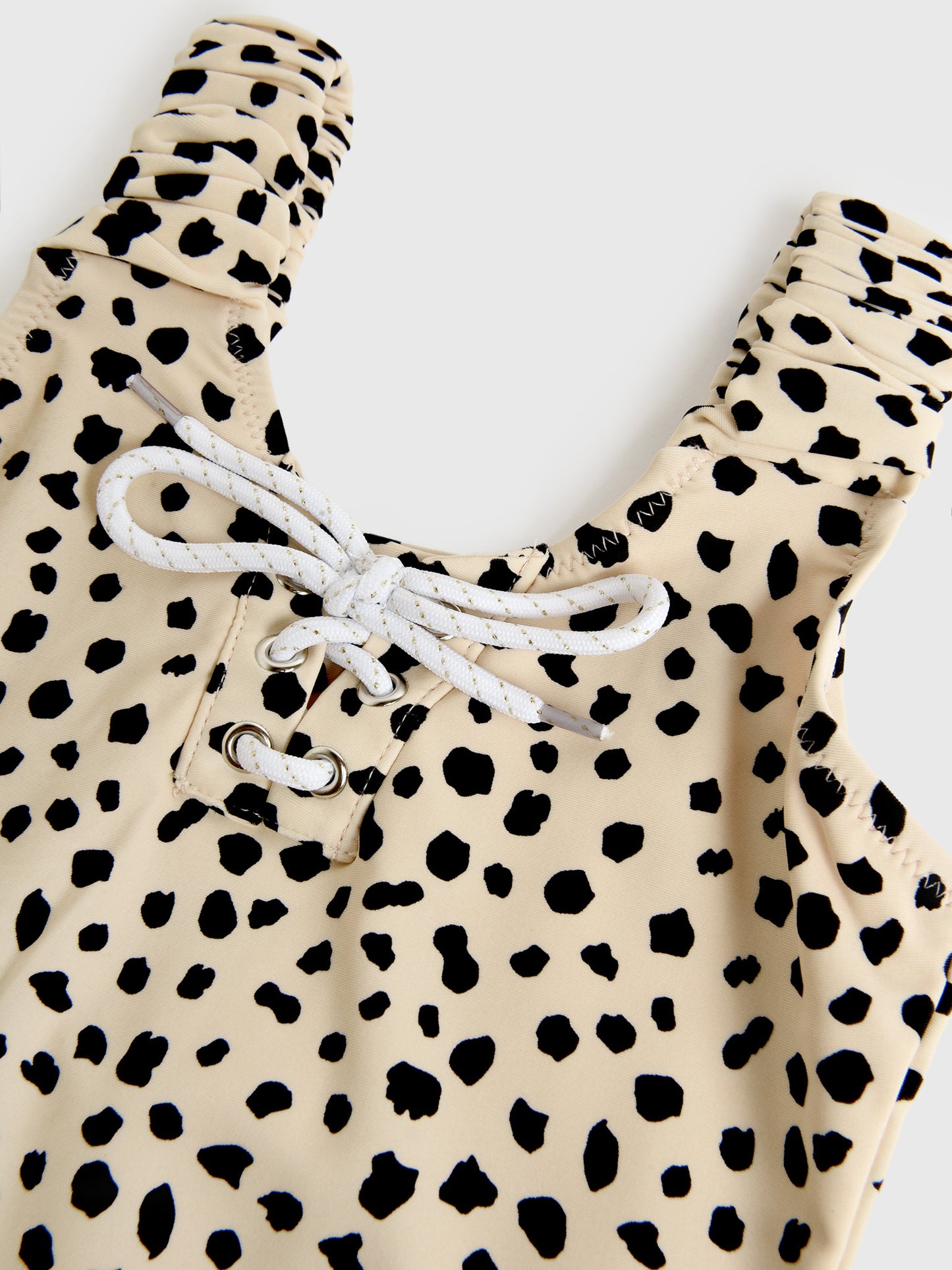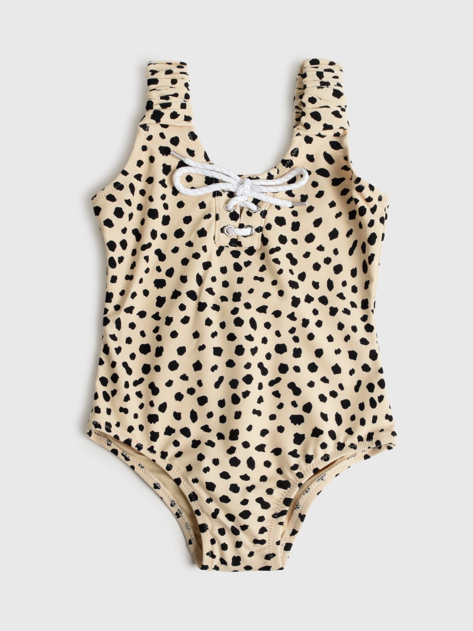 A one-piece swimsuit featuring ruched straps, a lace-up detail, and a leopard print.