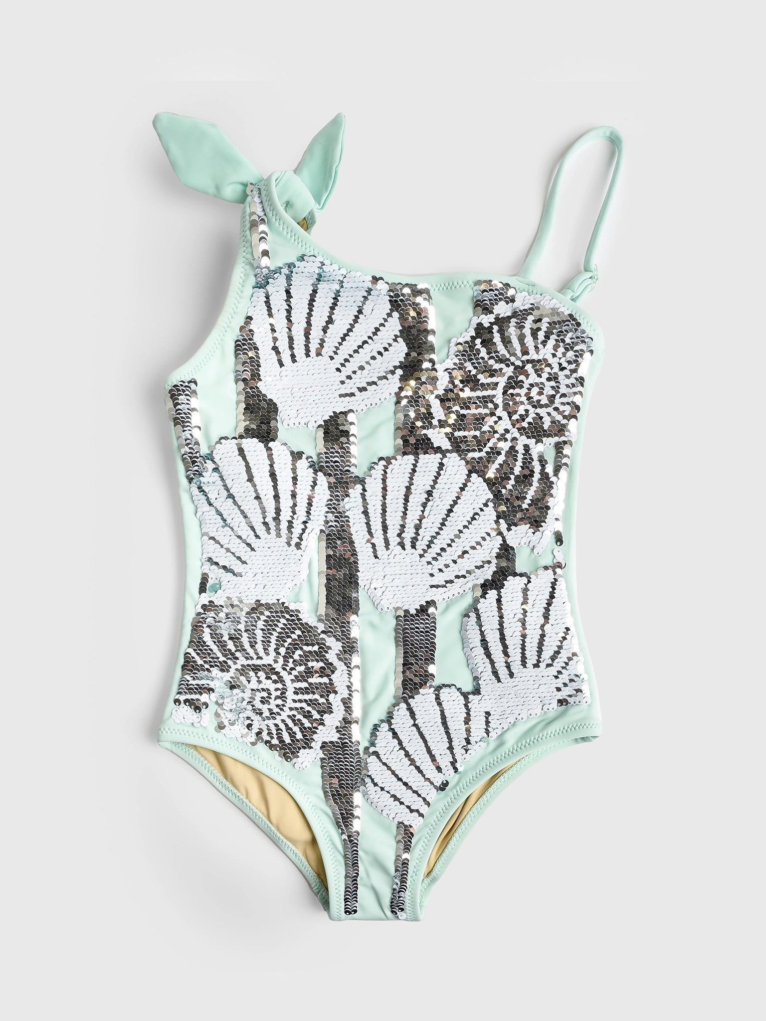 A full-coverage one-shoulder swimsuit featuring a charming seaside flip sequin design.