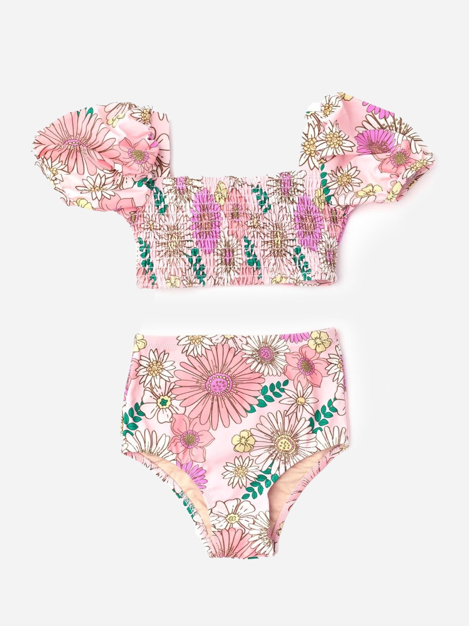 A two-piece floral-printed bikini set with a smocked, puff sleeve top and a matching high-waisted bottom.