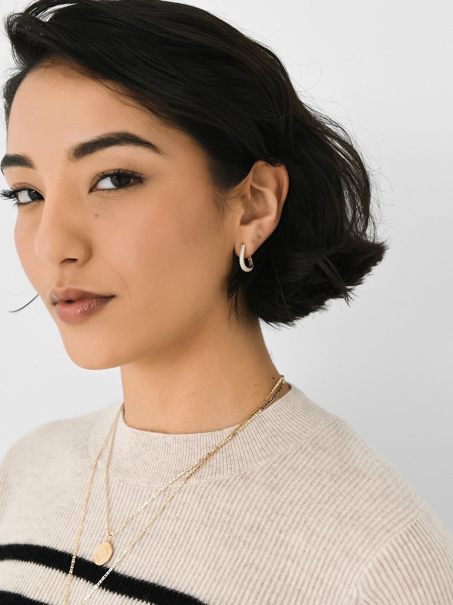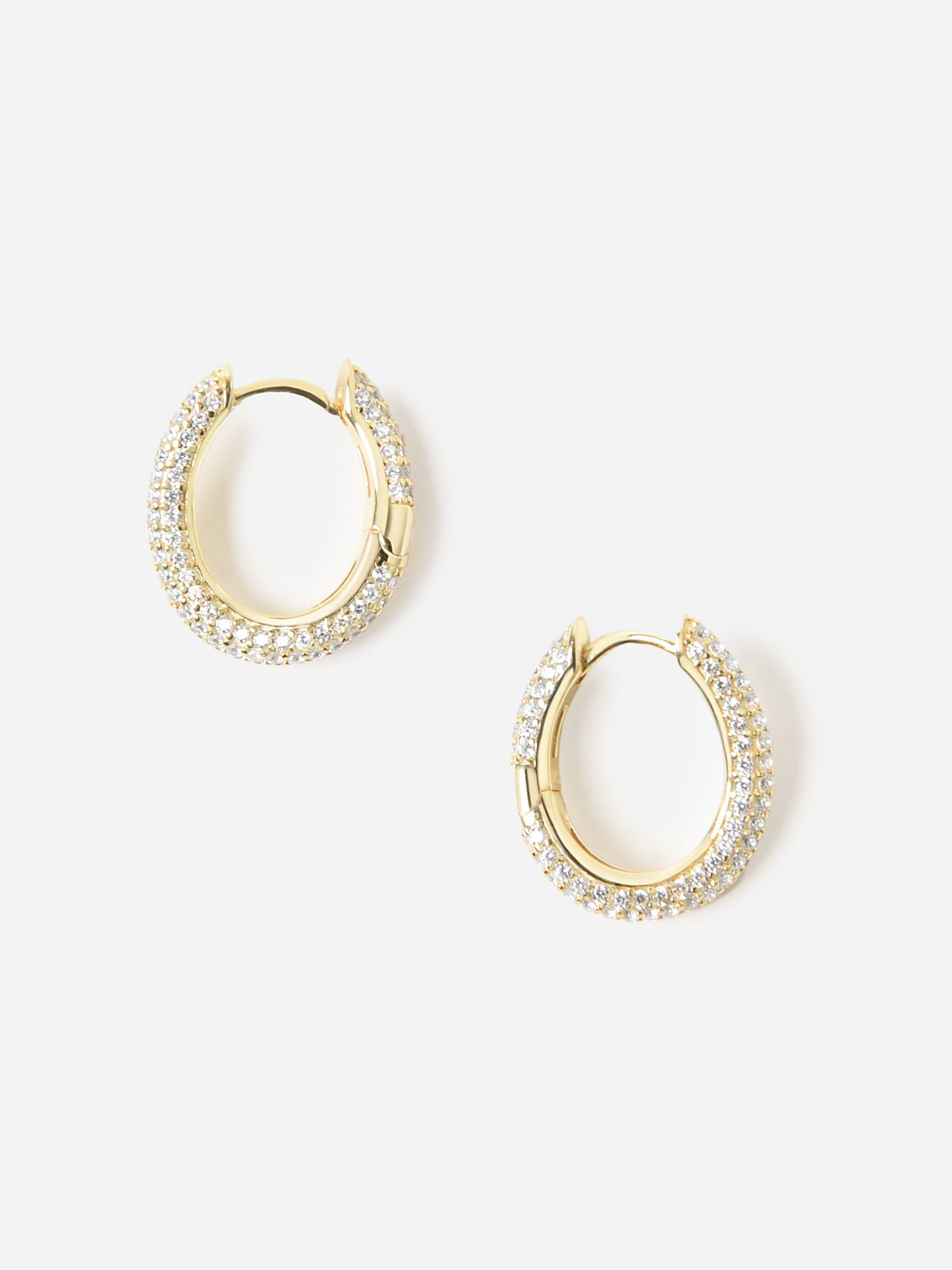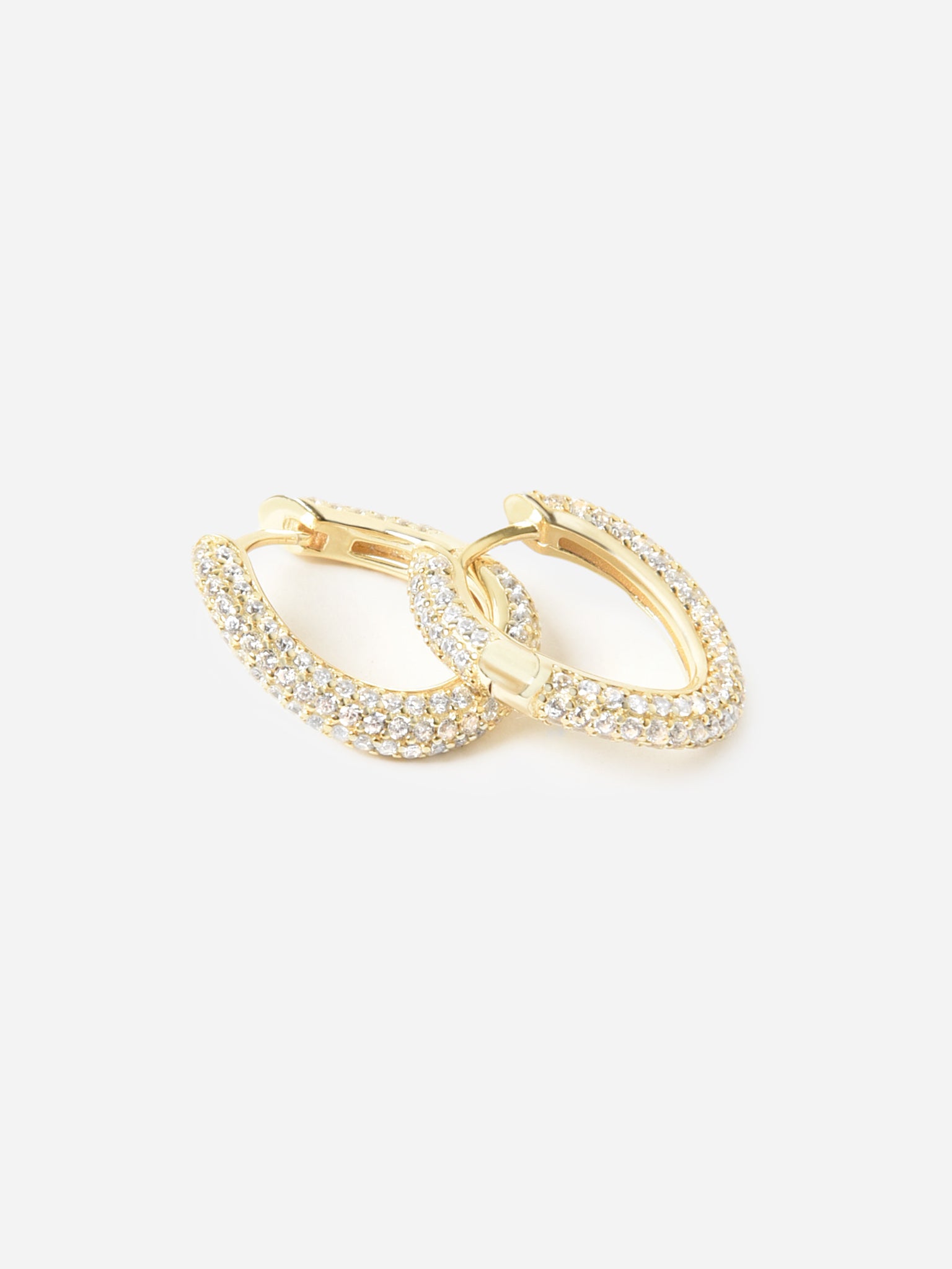 A dainty pair of huggie earrings covered in pavé cubic zirconia stones.