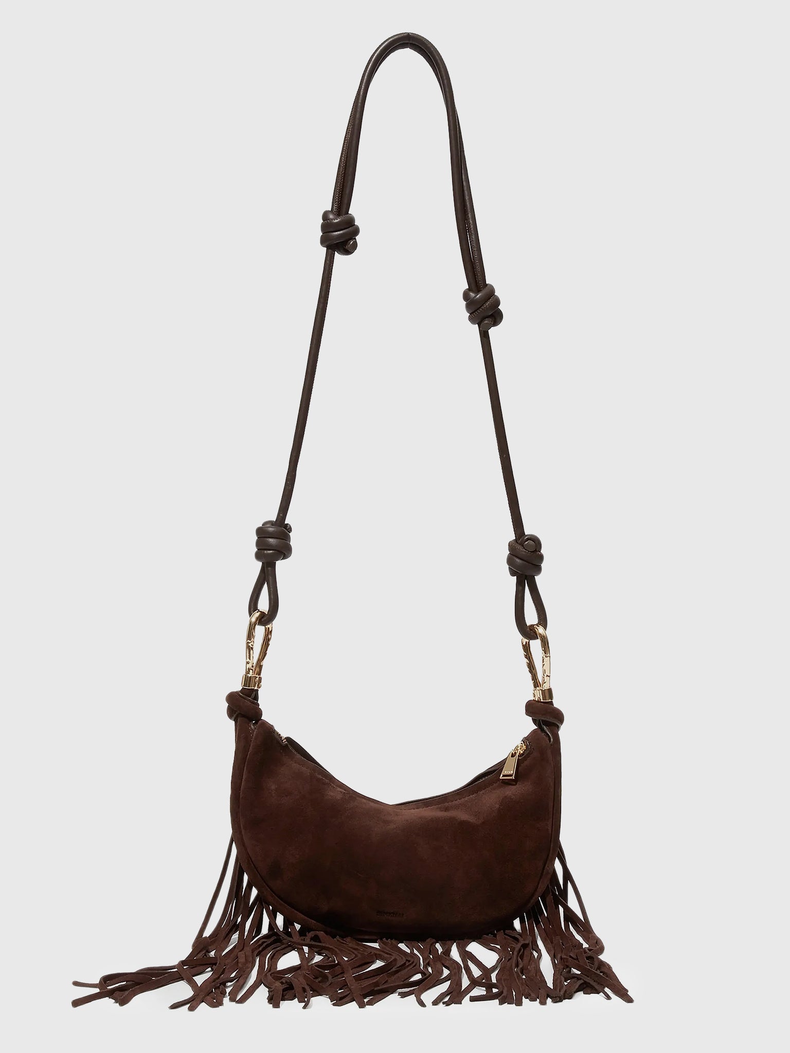 The Avery Fringe Suede Crossbody Bag is a stylish accessory crafted from sumptuously soft suede. This distinct design is finished with a playful fringed trim and features a chic removable knotted strap, allowing you to easily convert your look from a shoulder bag to a clutch.
