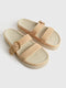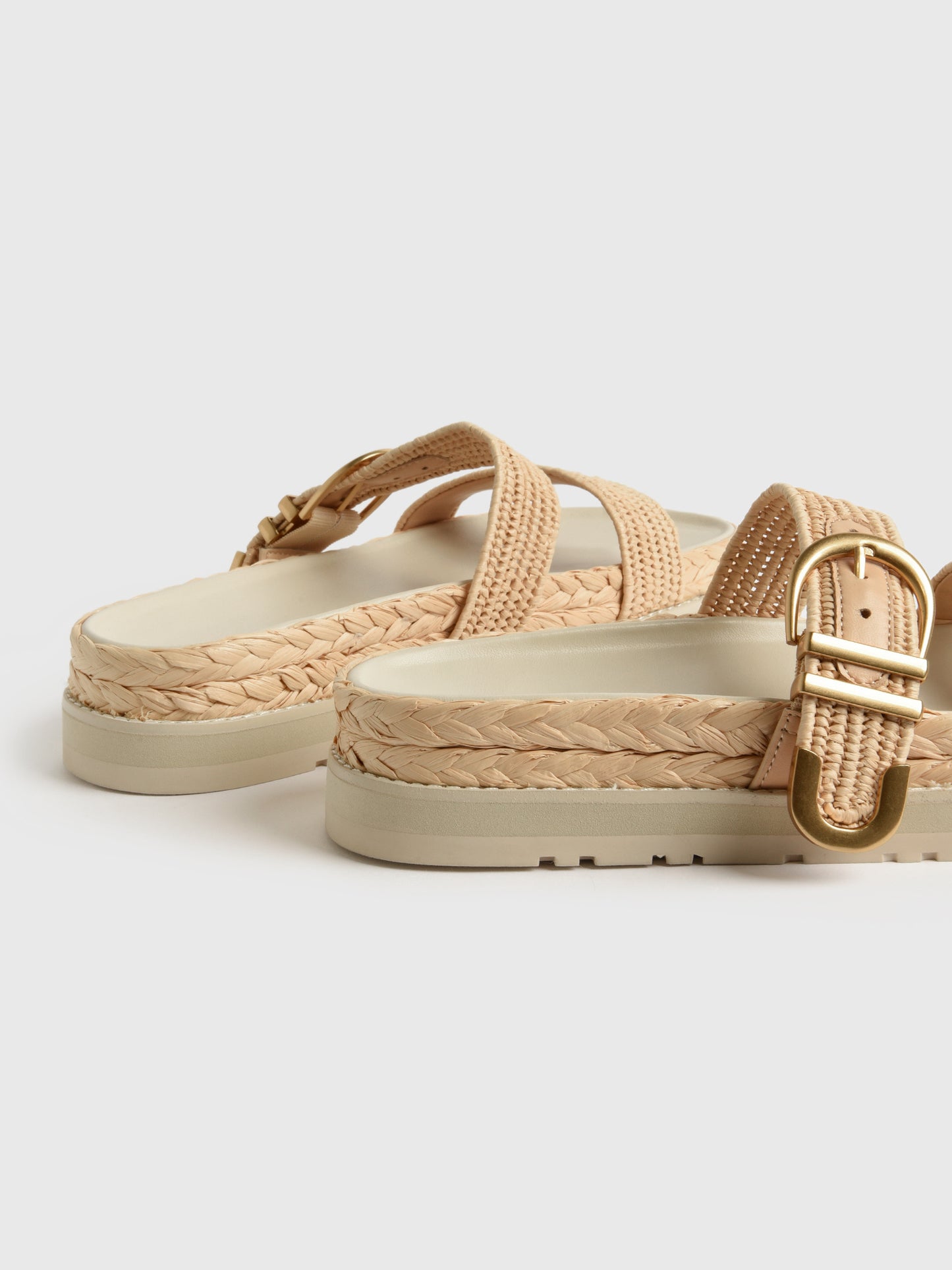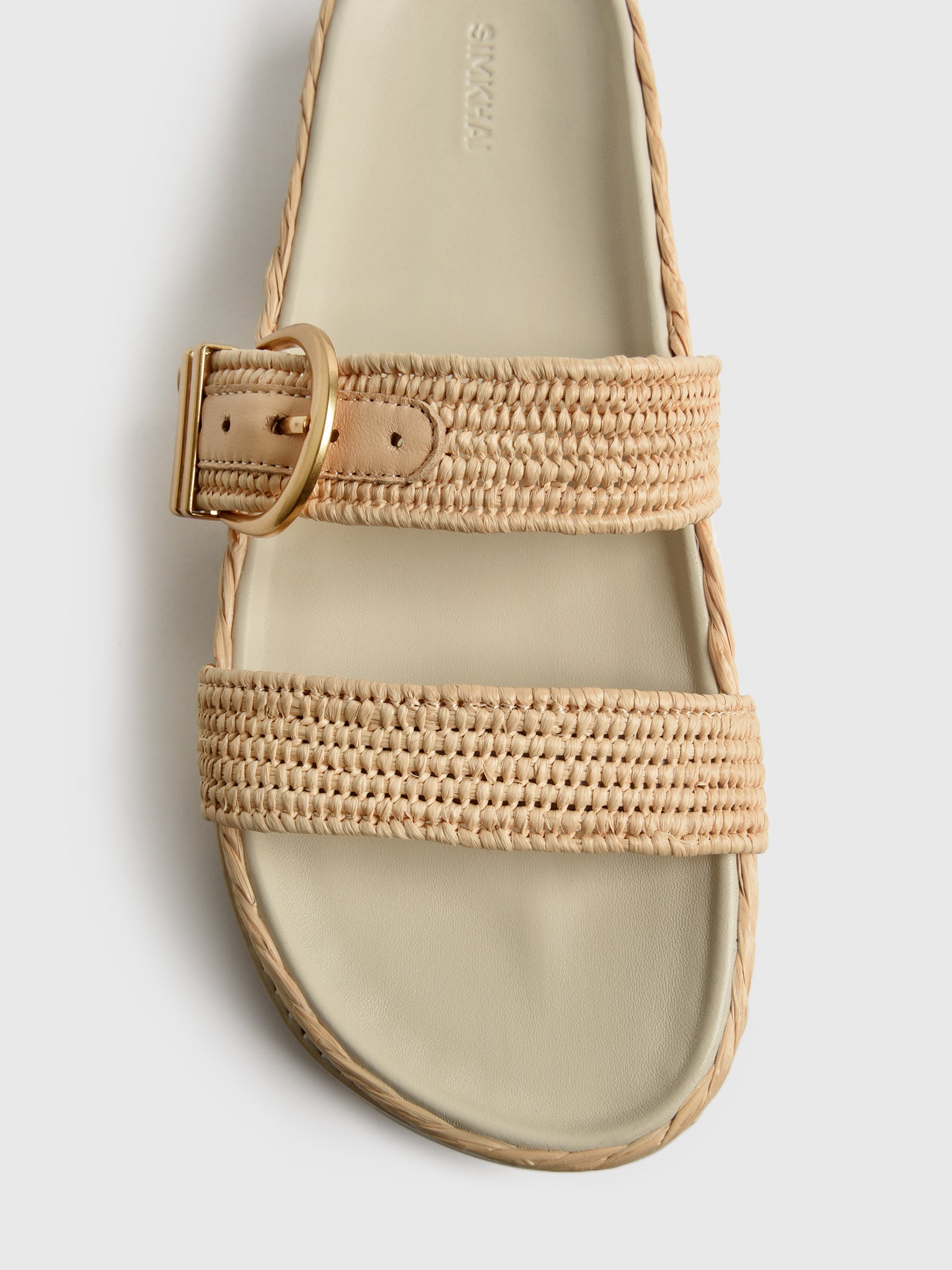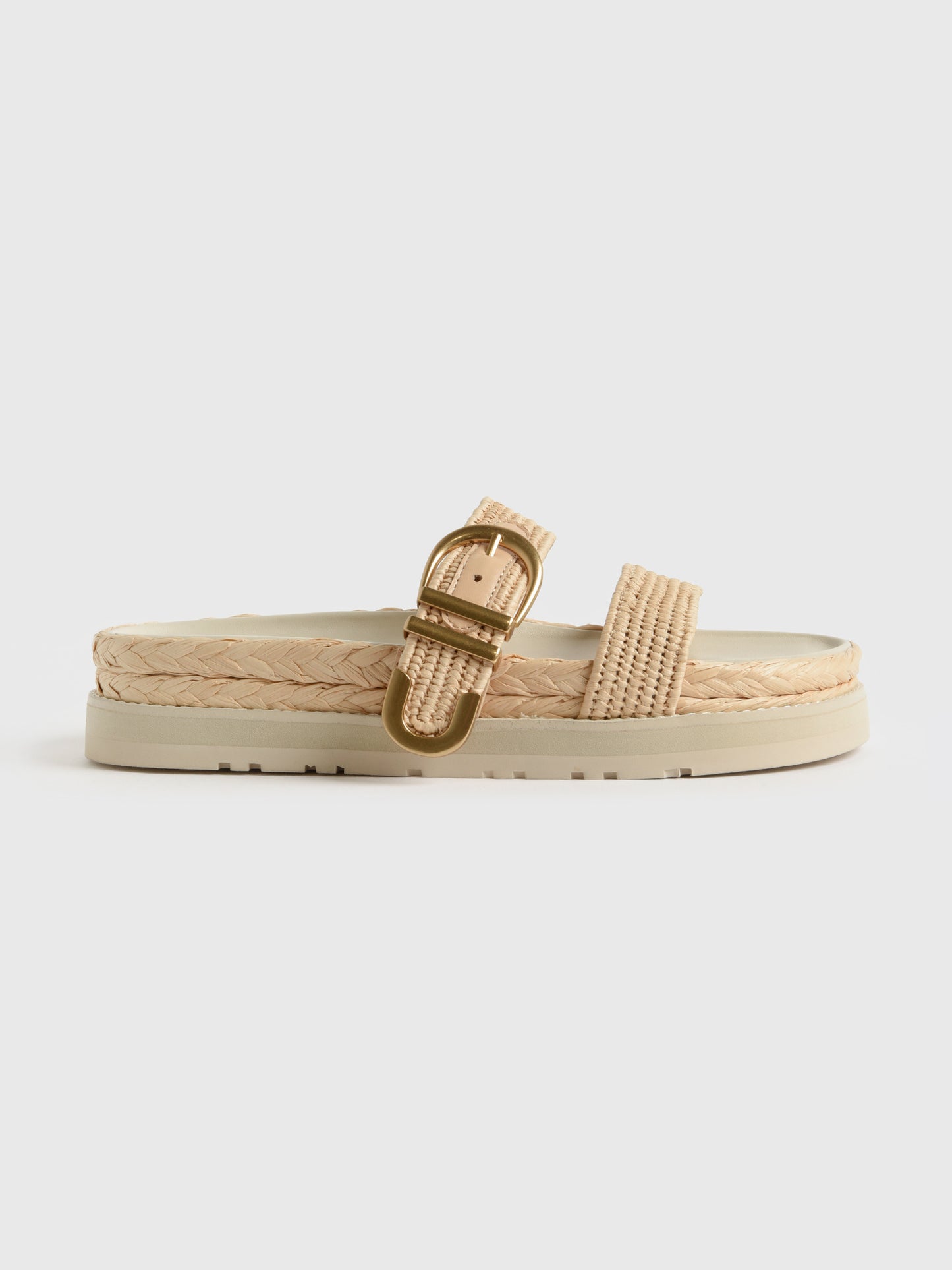 This double-strap sandal, crafted from raffia and leather, features bold buckles and a textured sole.