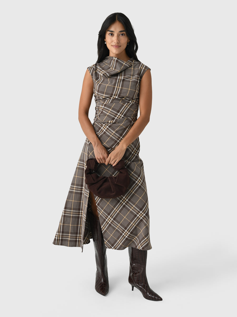 This plaid midi dress features a high neckline, cap sleeves, and a lightly draped design with a flattering A-line silhouette.