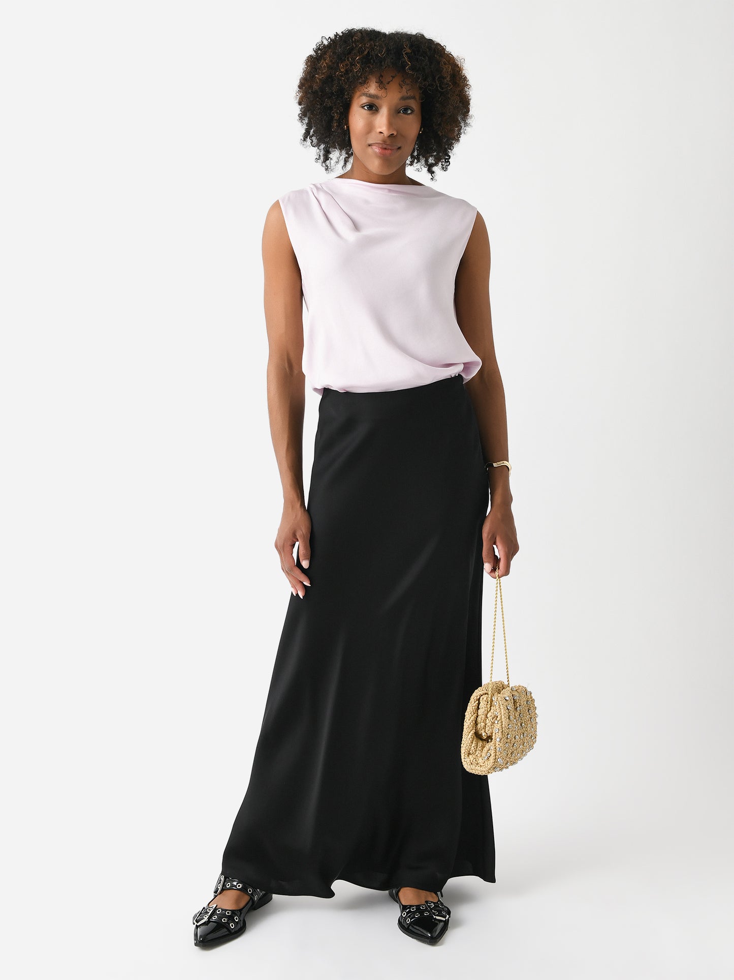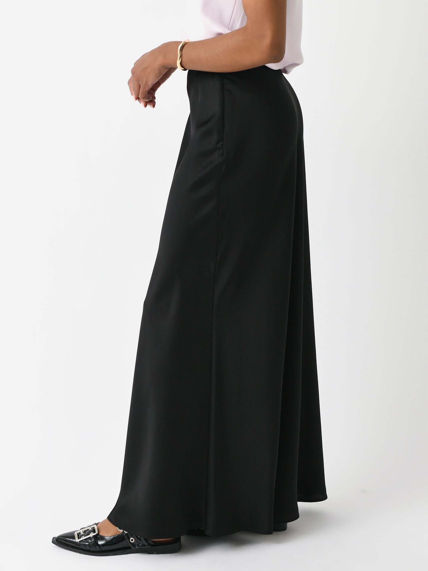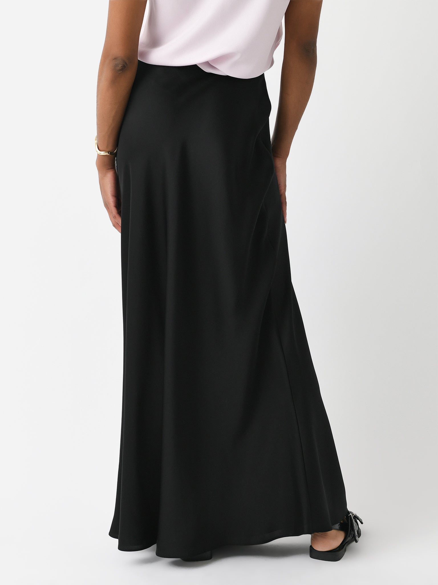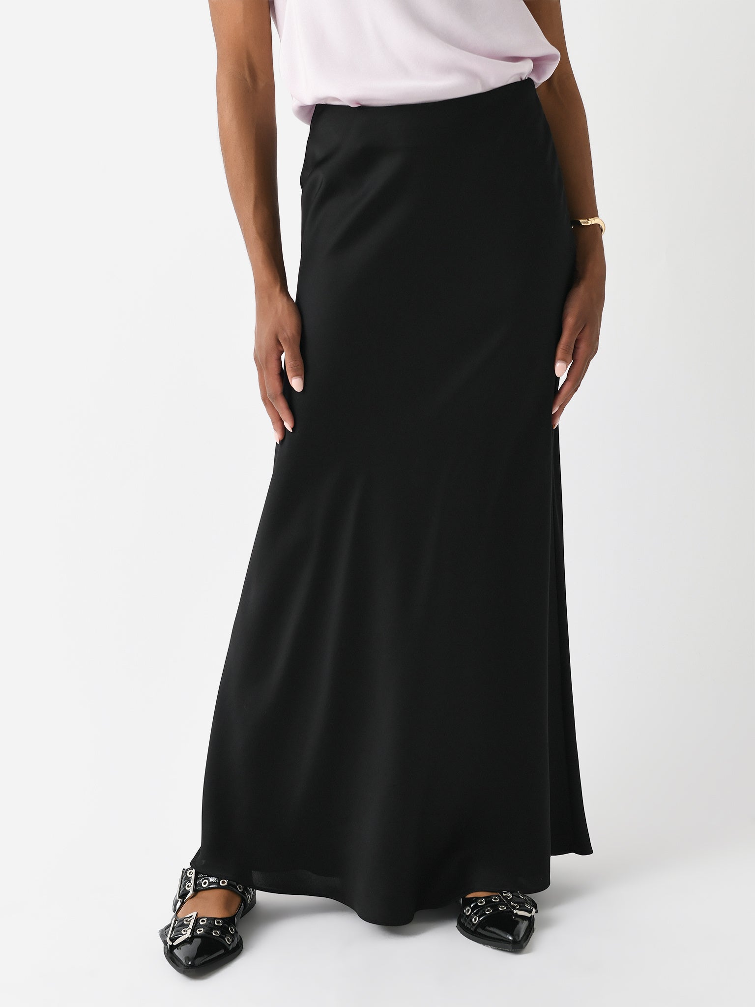 A satin maxi skirt with a straight silhouette and a pull-on design.