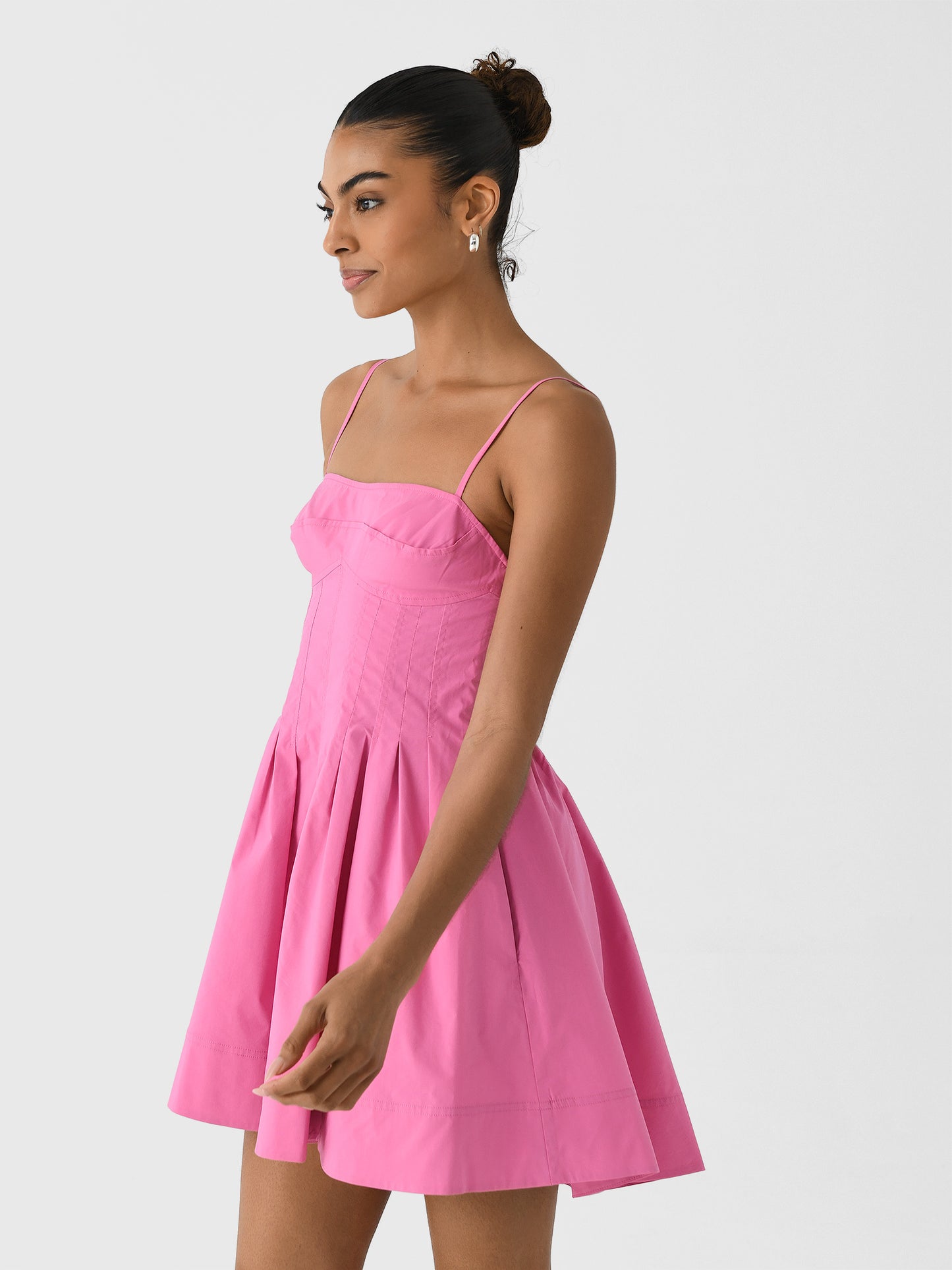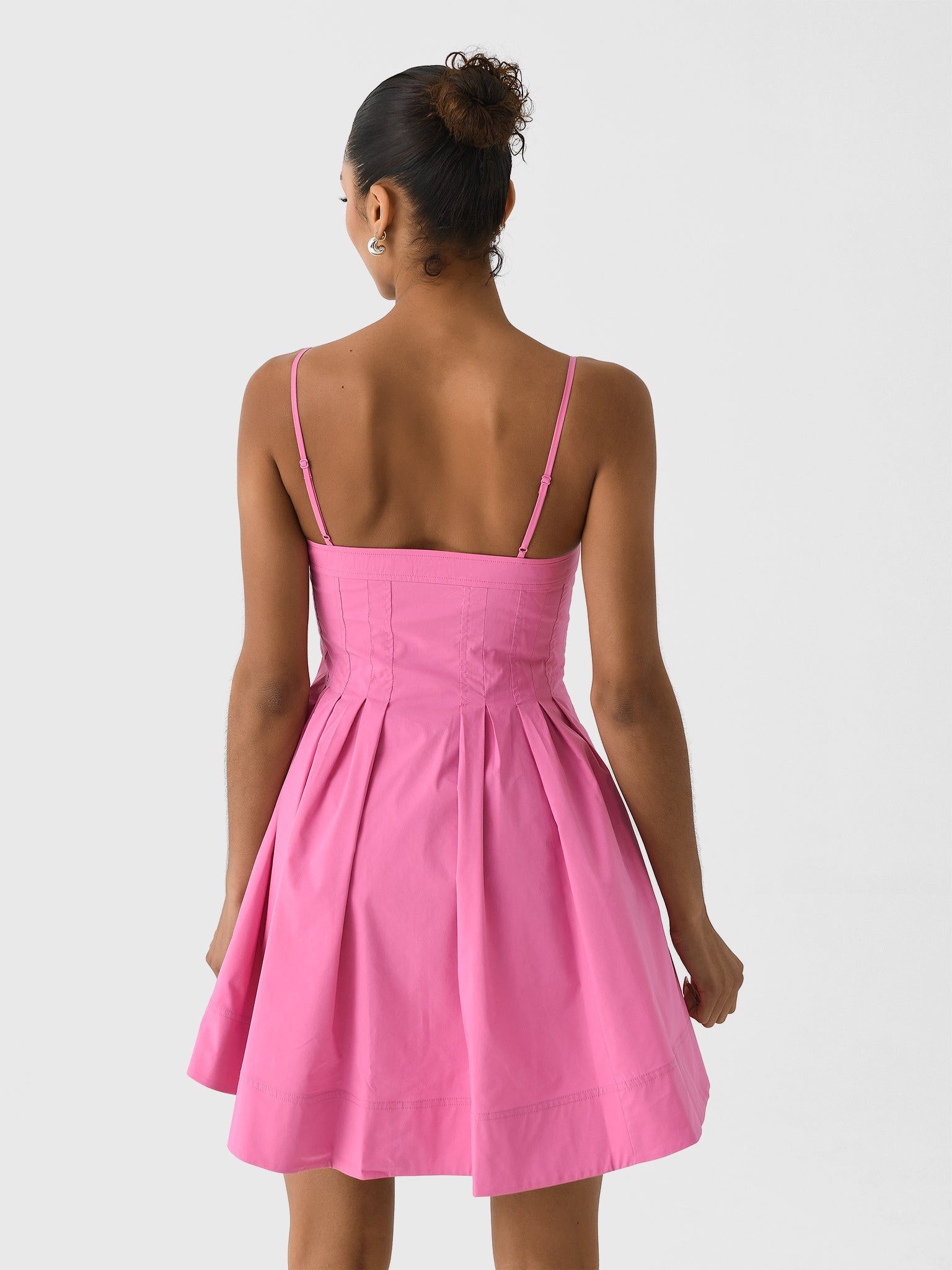 This versatile mini dress is made from a lightweight cotton blend and features a structured bodice that flows into a full, softly pleated skirt.